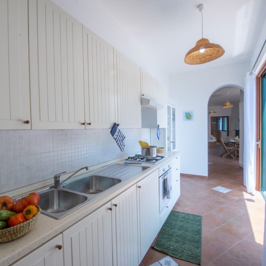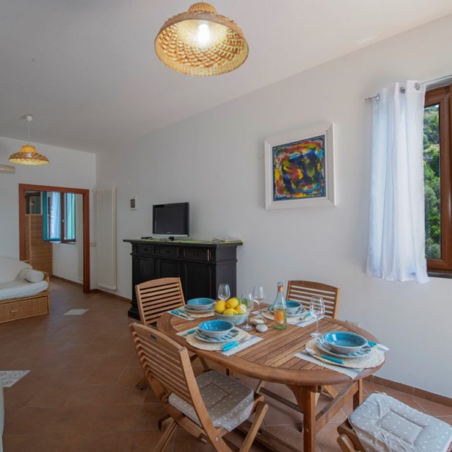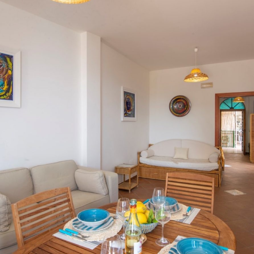 The first unit “Vento in poppa”, gives you the actual feeling of being on board of a sinuous sailing ship. The construction skirts the rock following its curvatures and joints, the large central balcony gives you the feeling of being suspended over the sea, the rooms follows one another offering glimpses of an infinite horizon from the luminous windows. The house offers two double bedrooms where it possible to add two single beds more and a double sofa bed located in the vast living room, two bathrooms, one with a bath tub and the other one with a shower, and a practical central kitchen.