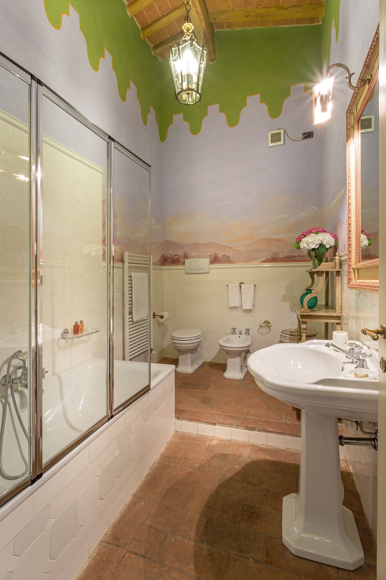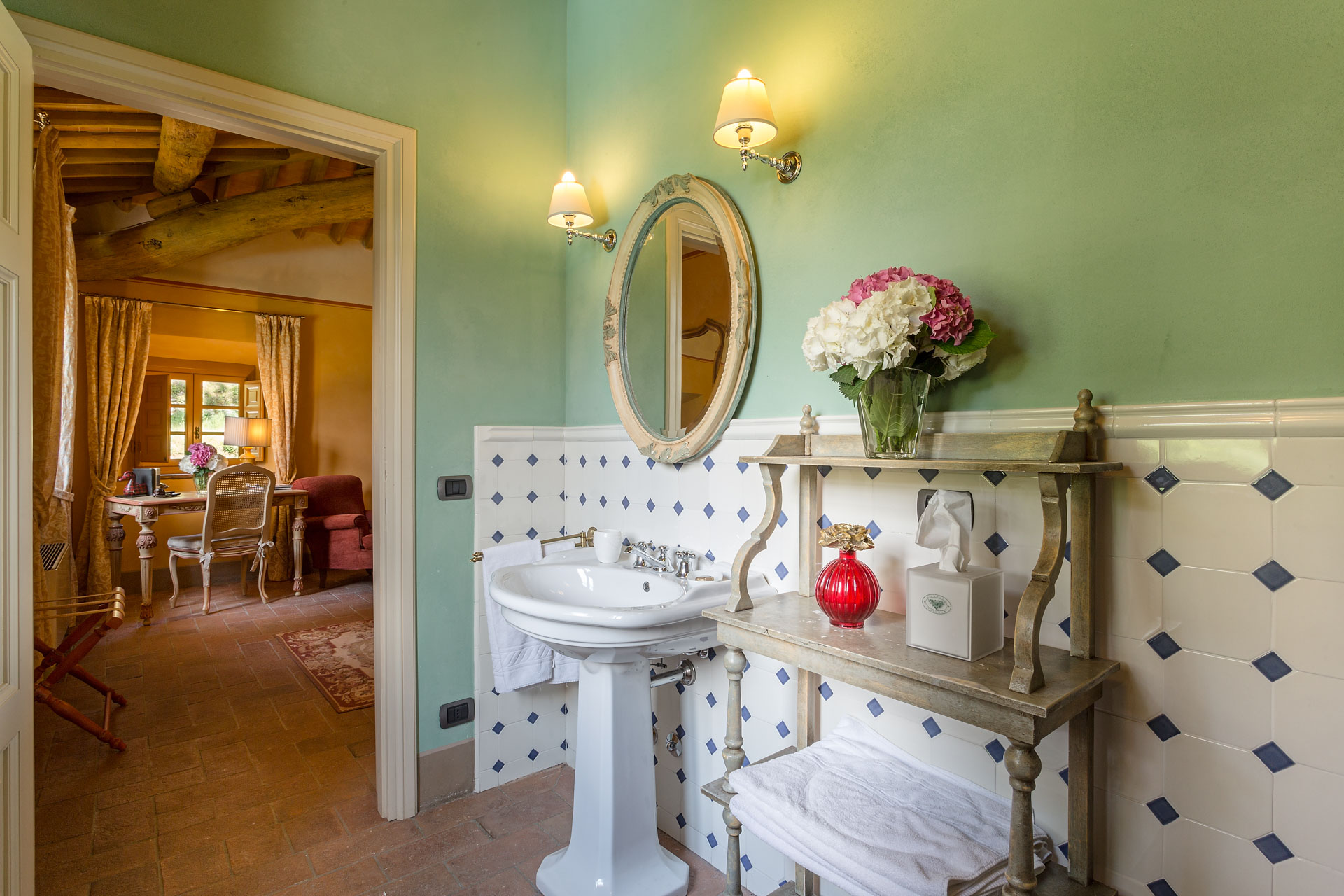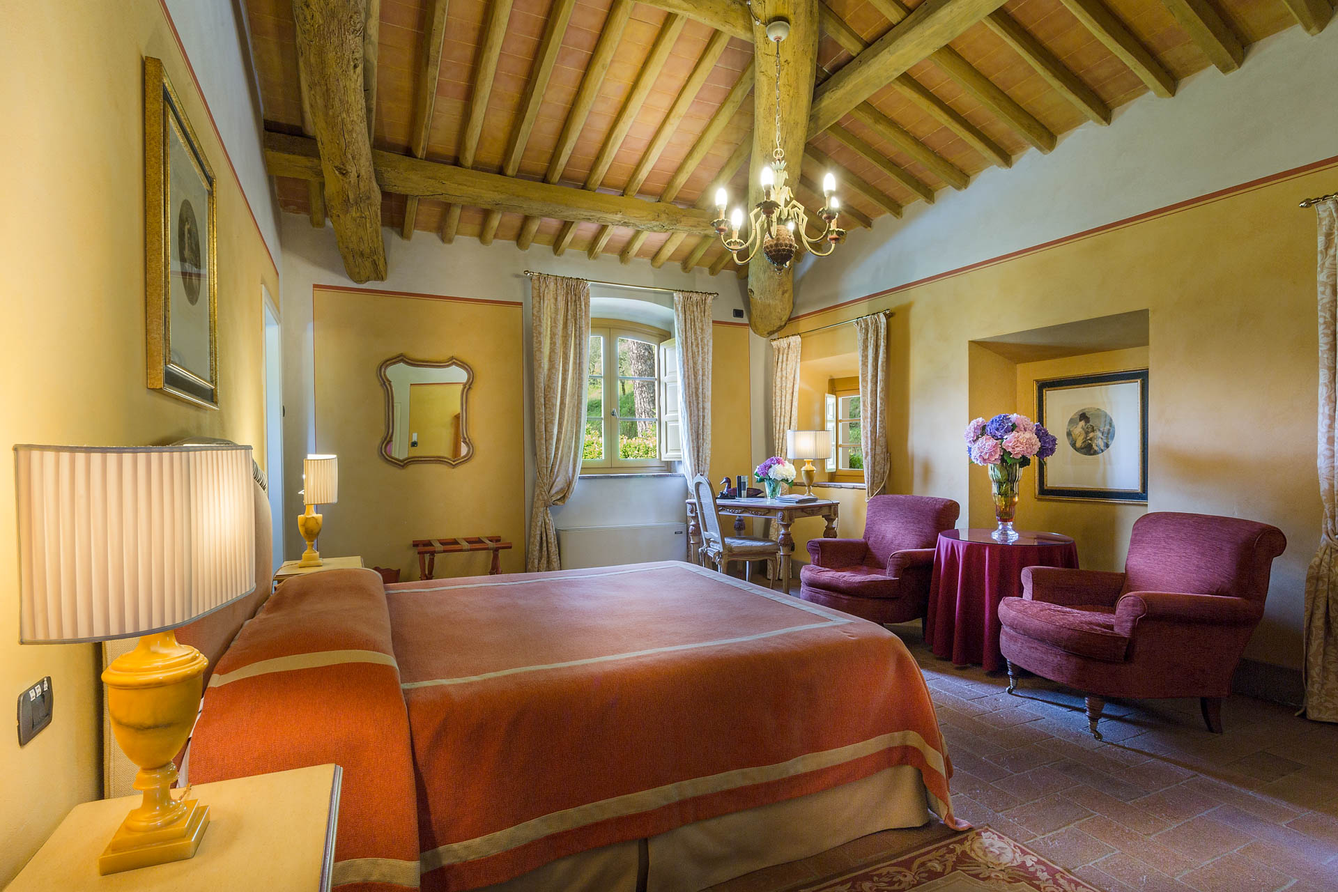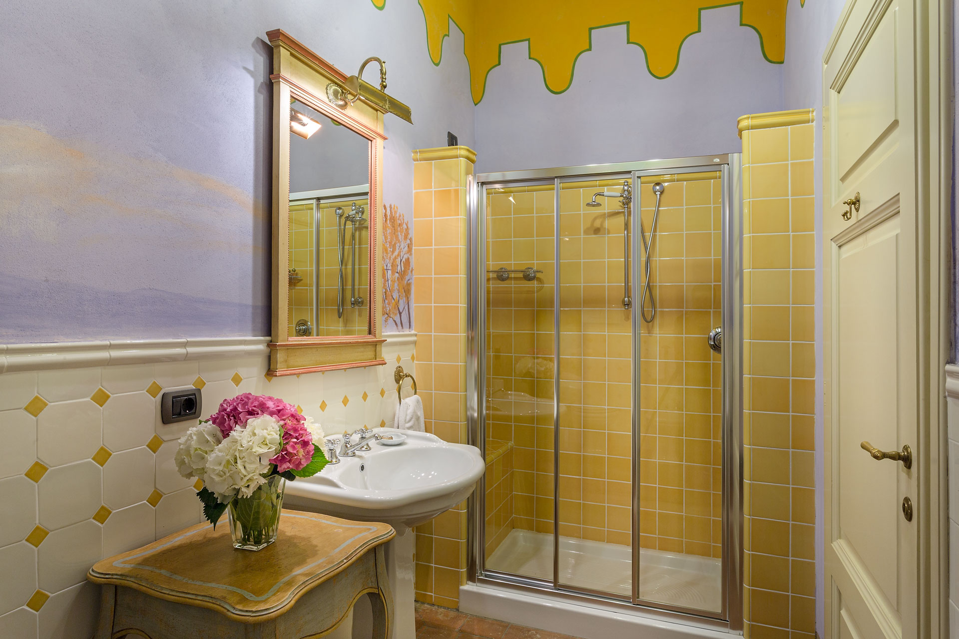 6 marvellous bedrooms with en-suite bathrooms. Every bedroom has a queen size bed except one where it is possible to have twin beds (can be converted into Queen). Two rooms can accomodate an extra bed for an additional charge. Thanks to the extra beds, Casa Mattei can accomodate up to 12 people.