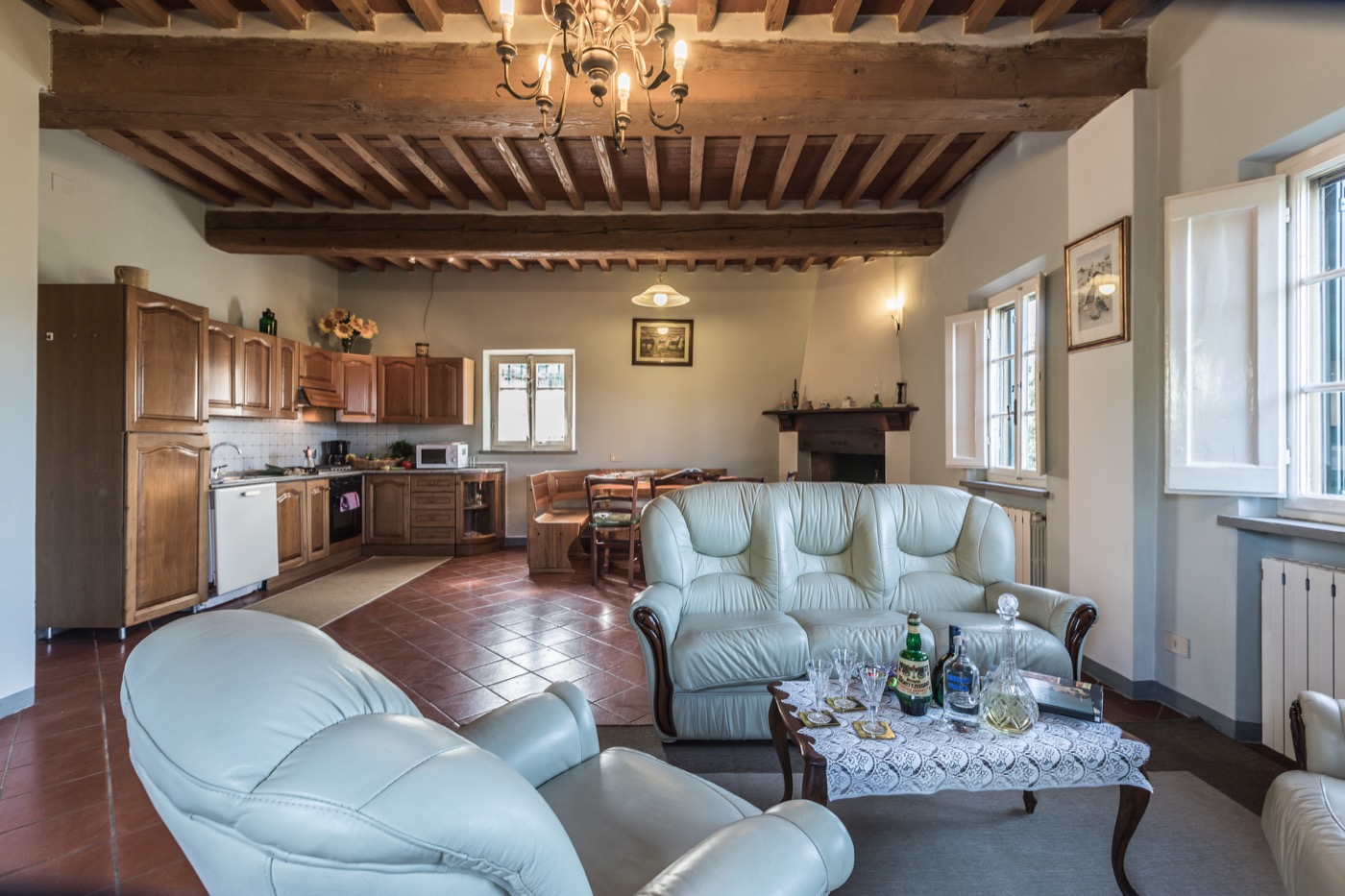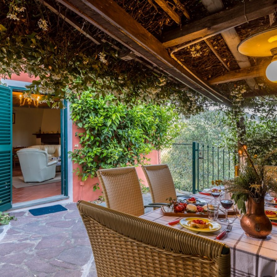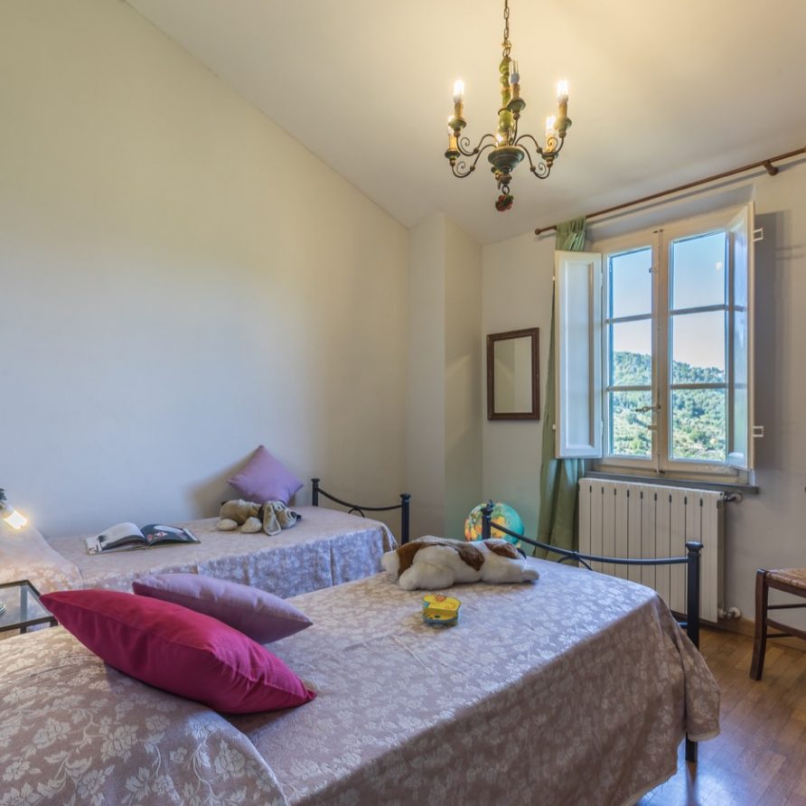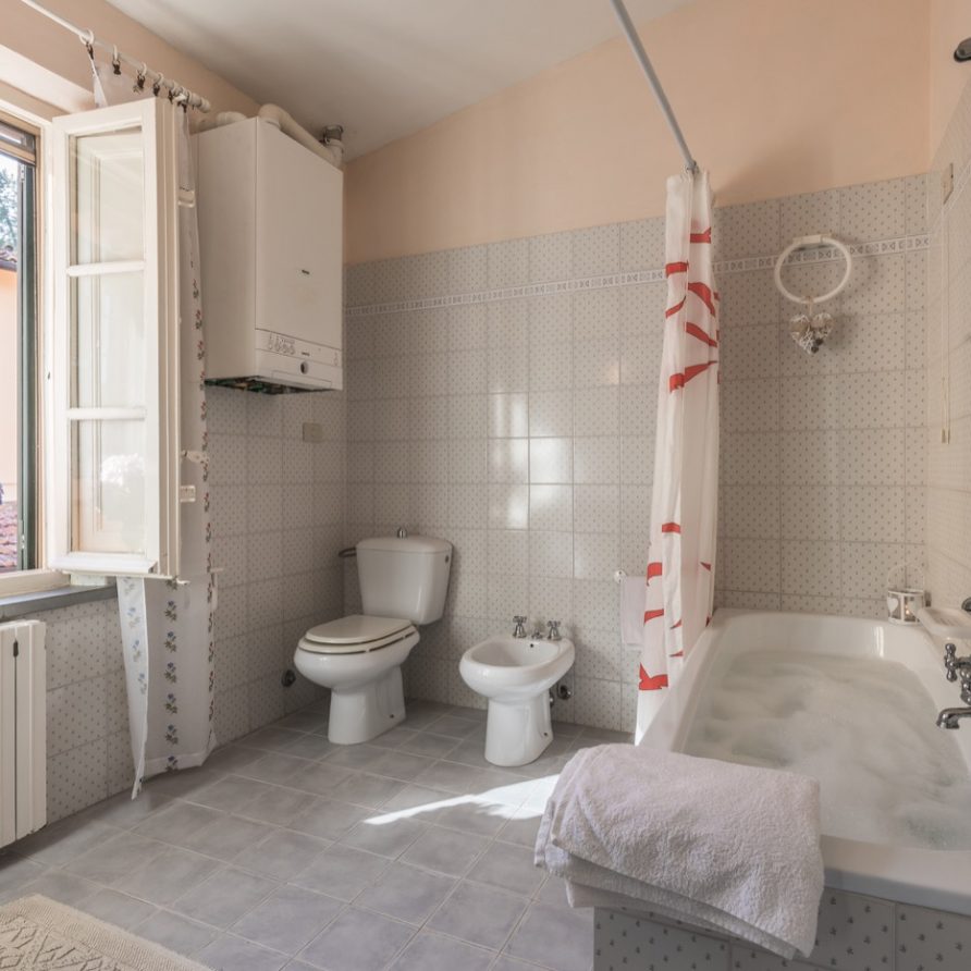 On the first floor: 2 double bedrooms, 1 sofa bed, 1 bathroom with shower, toilet / bidet. The house has a veranda with jasmine fragrant and roses, here you can dinner outside surrounded by a unique view of the hills of Lucca.