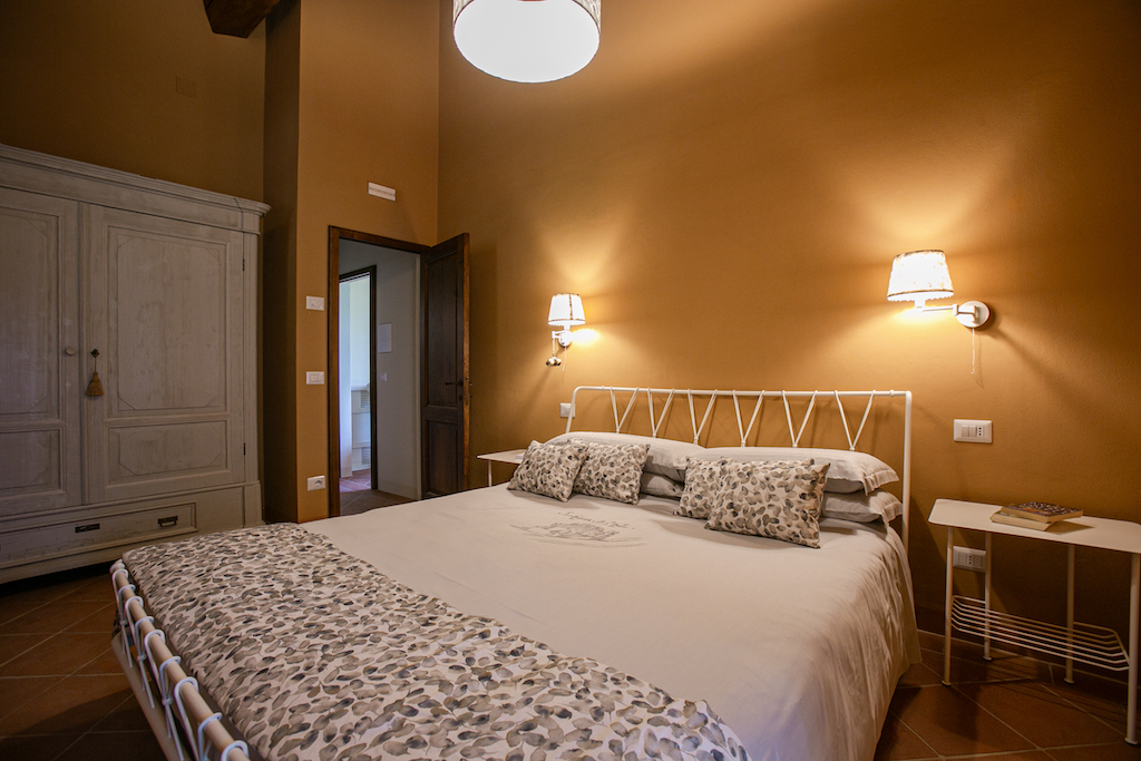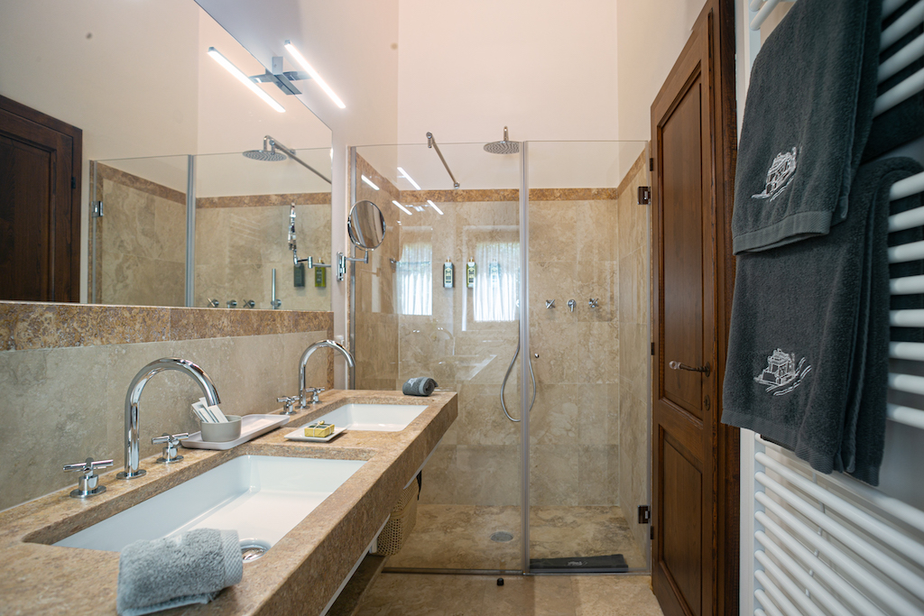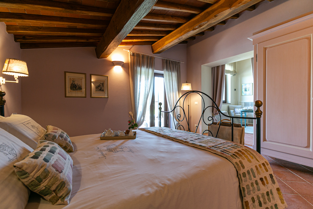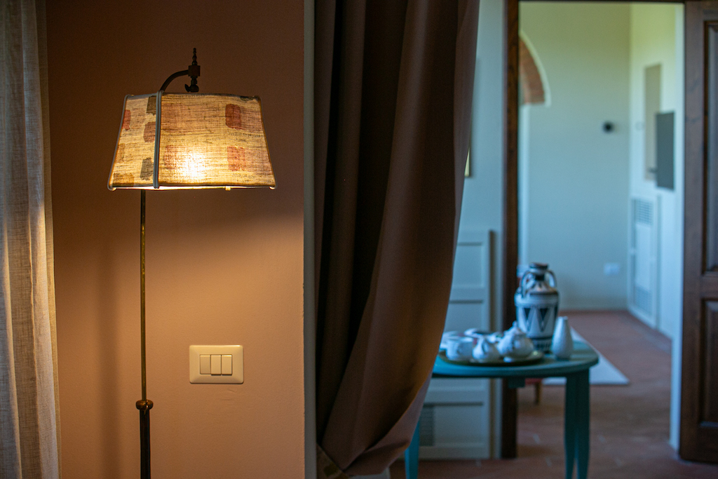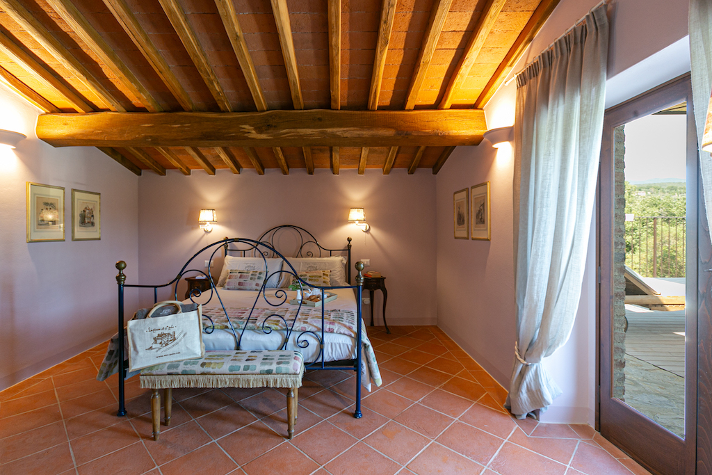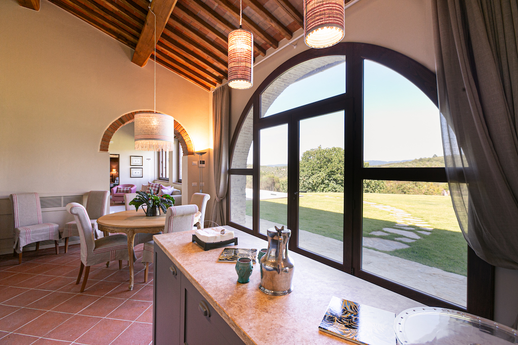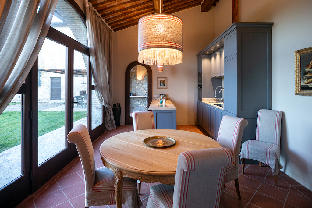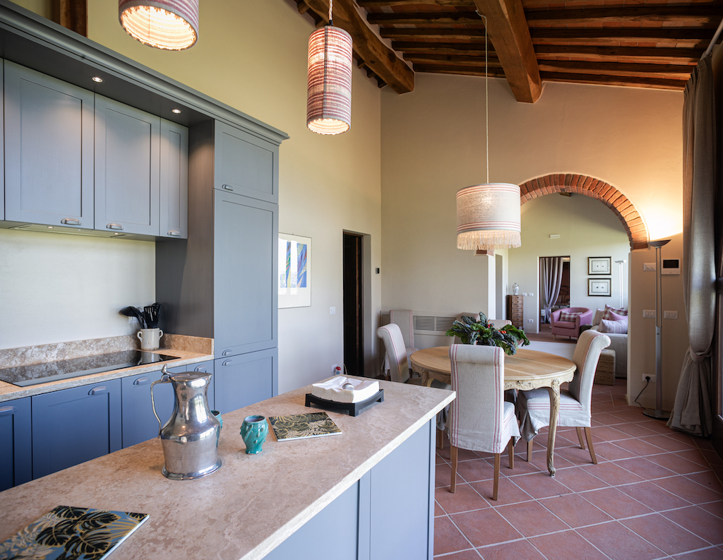 Typical Tuscan features include terracotta tiles on the floors and beamed ceilings, while soft pastels and stylish furnishings give a light and modern aspect.