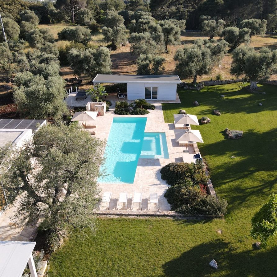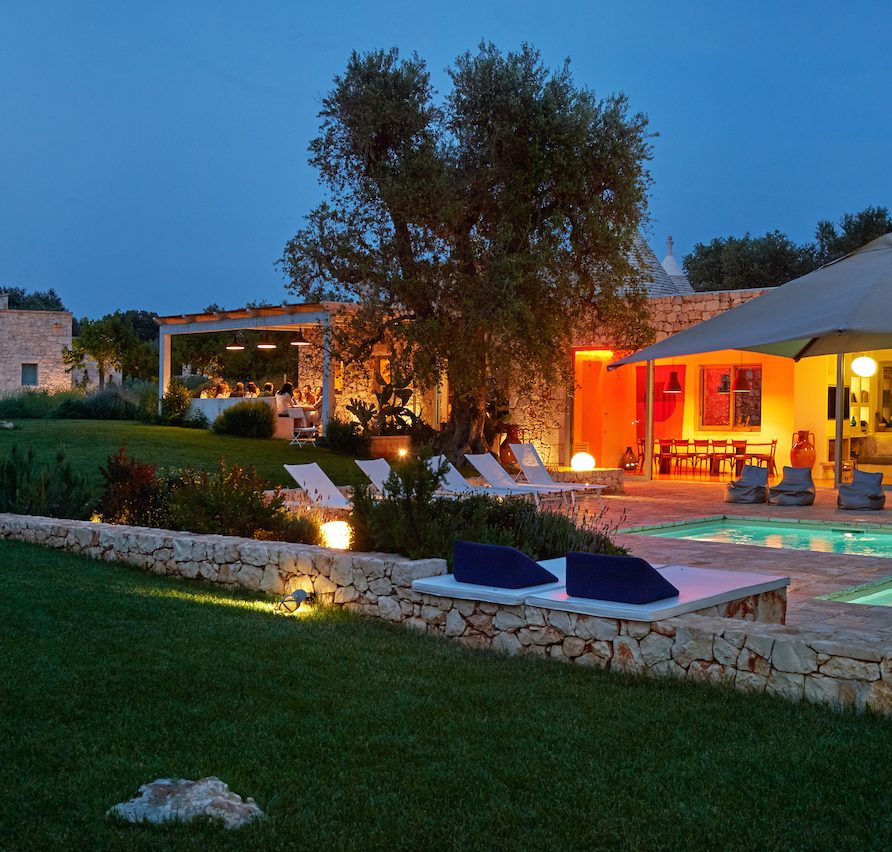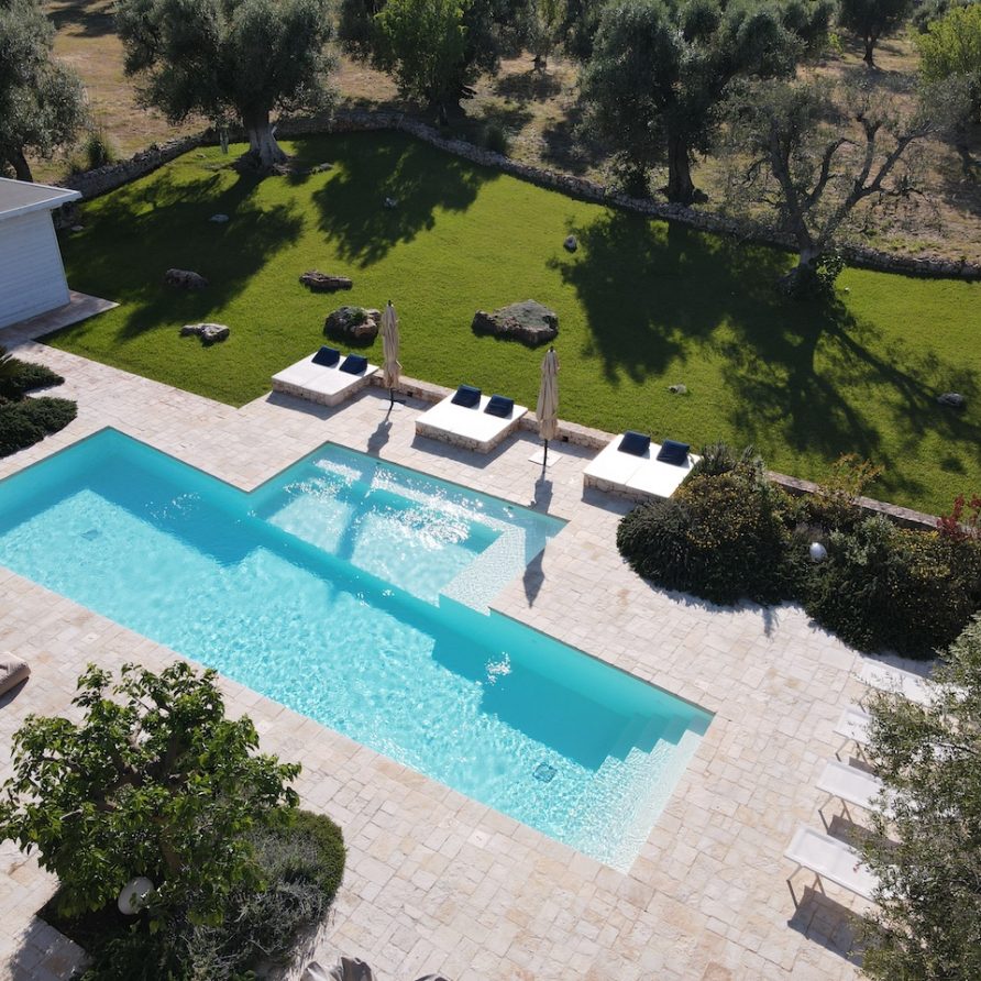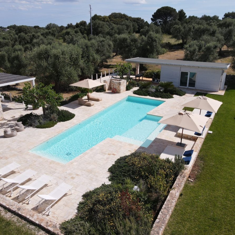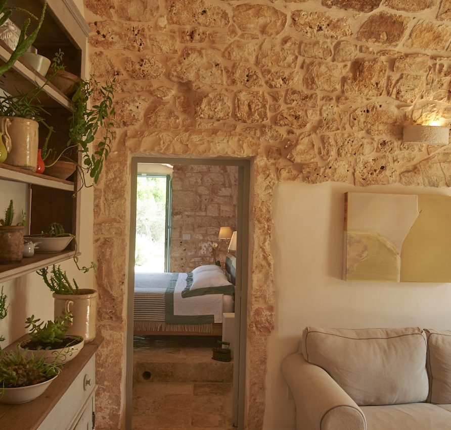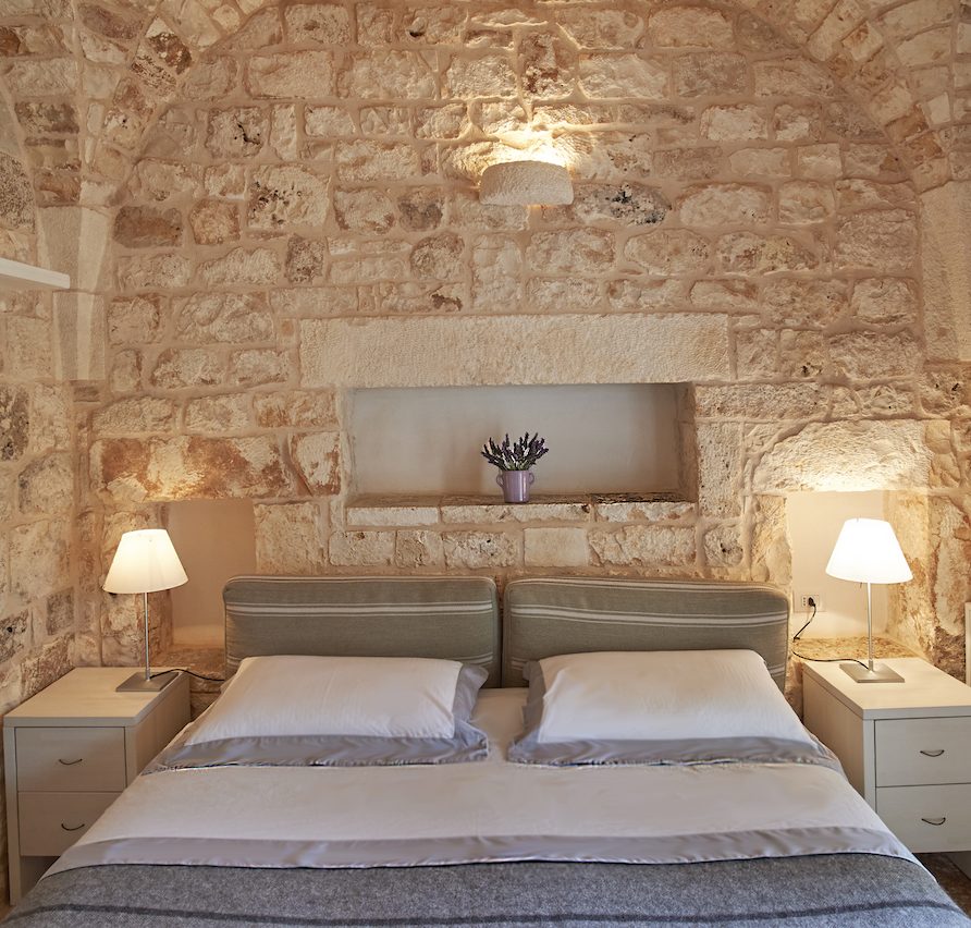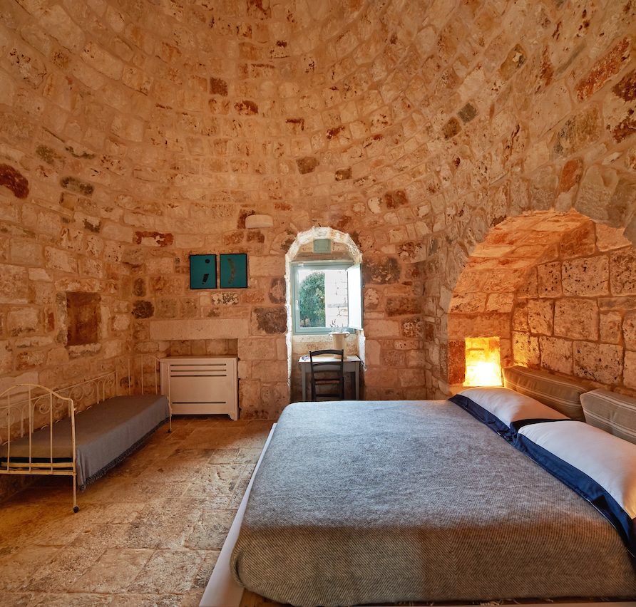 Ostuni Art is a luxury retreat located in the very heart of Apulia, close to the white city of Ostuni. The ensemble is nestled within private land more than 6 hectares of olive groves and it is composed of three stone buildings: the Trulli, the Lamia, and the Trullo Saraceno. A large swimming pool, 16×5 (max 7,5), high quality furniture and the ultimate privacy make this place perfect for relaxing and enjoy exclusive holiday. The three buildings that comprise this hidden retreat were built at the end of 1700 and at the beginning of 1800. Ostuni Art is a project of passion born from the architect Giorgio Angella and his brother Giulio, who dreamt of breathing life into the abandoned ruins. Using local craftsmen and traditional methods, they painstakingly restored the stone structures to their original beauty. As the 3 buildings are separated from the main house, the concept was to linked them together through the common areas: the lovely fully equipped kitchen and contemporary living room, the swimming pool with a huge sunbathing area, and the nearby areas with BBQ and wood-burning pizza oven. Inside the guests can breathe a magical air, the rooms in the Trulli or in the vaulted environments of stone transfer them into a timeless enchanted environment, every piece of furniture is made in Italy, sometimes exclusively for the resort other times they are recovered by expert restorers. The bathrooms are finished in the natural hues, the blue of the sky, the green of the olive tree leaves, the colors of the earth and stones.