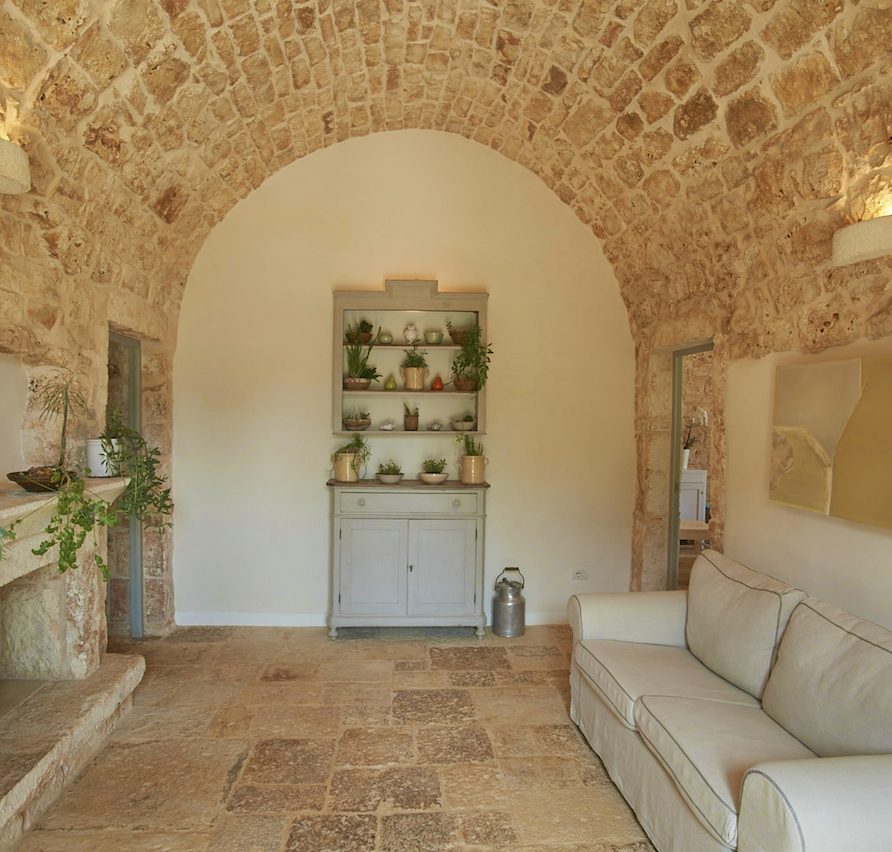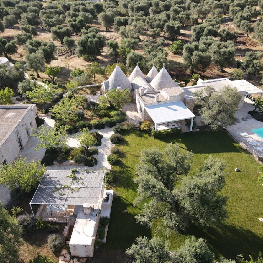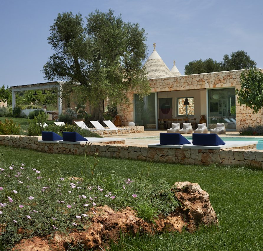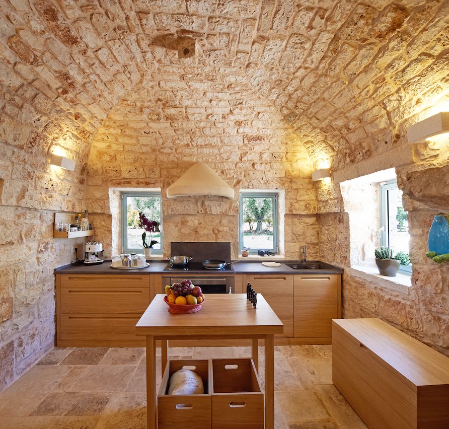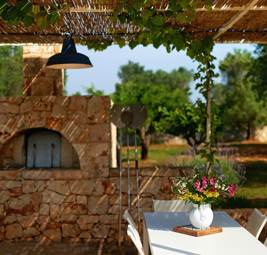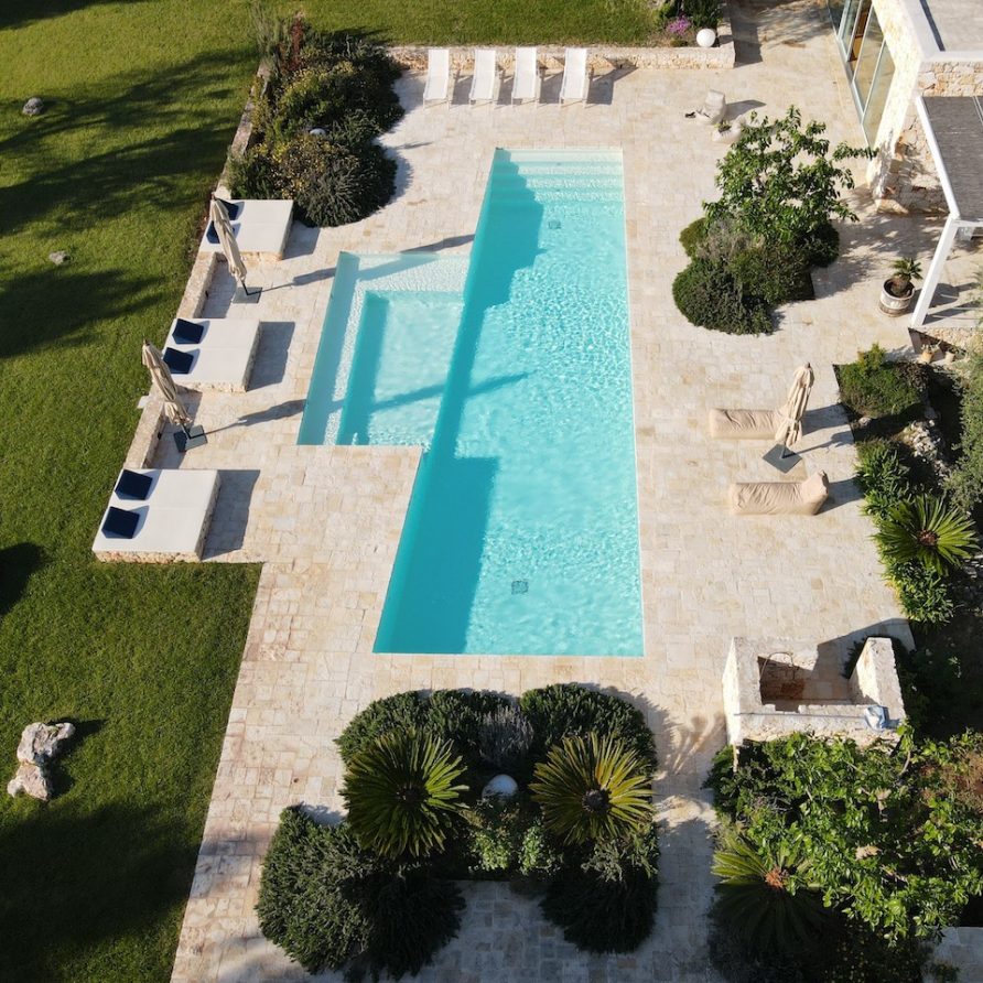 Ostuni Art is a luxury retreat located in the very heart of Apulia, close to the white city of Ostuni. The ensemble is nestled within private land more than 6 hectares of olive groves and it is composed of three stone buildings: the Trulli, the Lamia, and the Trullo Saraceno. A large swimming pool, 16×5 (max 7,5), high quality furniture and the ultimate privacy make this place perfect for relaxing and enjoy exclusive holiday. The three buildings that comprise this hidden retreat were built at the end of 1700 and at the beginning of 1800. Ostuni Art is a project of passion born from the architect Giorgio Angella and his brother Giulio, who dreamt of breathing life into the abandoned ruins. Using local craftsmen and traditional methods, they painstakingly restored the stone structures to their original beauty. As the 3 buildings are separated from the main house, the concept was to linked them together through the common areas: the lovely fully equipped kitchen and contemporary living room, the swimming pool with a huge sunbathing area, and the nearby areas with BBQ and wood-burning pizza oven. Inside the guests can breathe a magical air, the rooms in the Trulli or in the vaulted environments of stone transfer them into a timeless enchanted environment, every piece of furniture is made in Italy, sometimes exclusively for the resort other times they are recovered by expert restorers. The bathrooms are finished in the natural hues, the blue of the sky, the green of the olive tree leaves, the colors of the earth and stones.