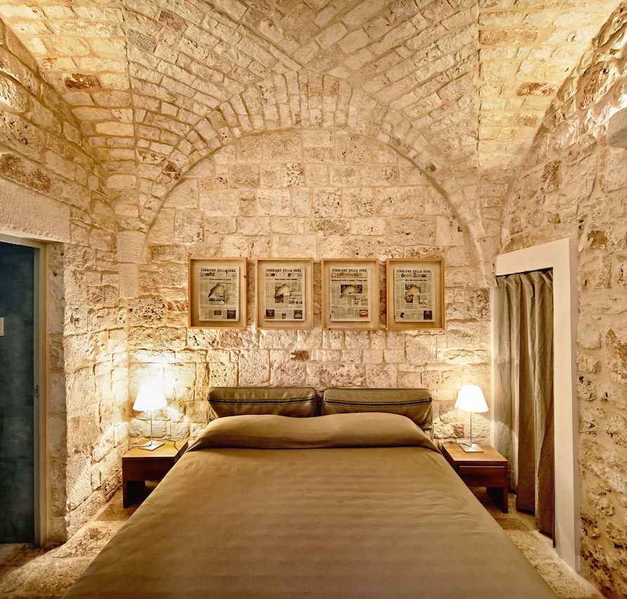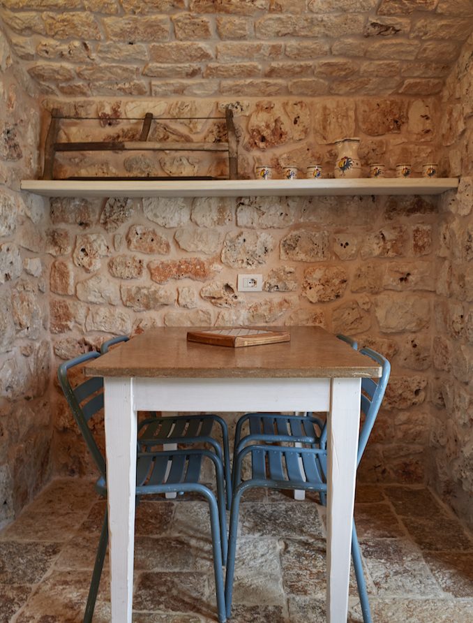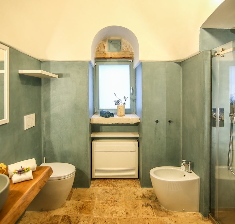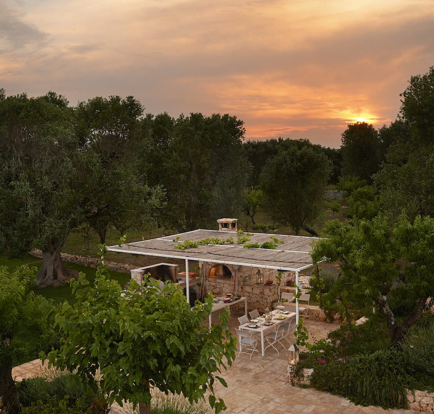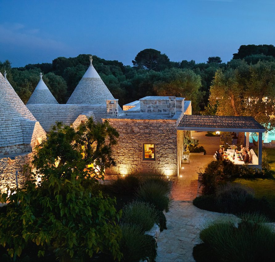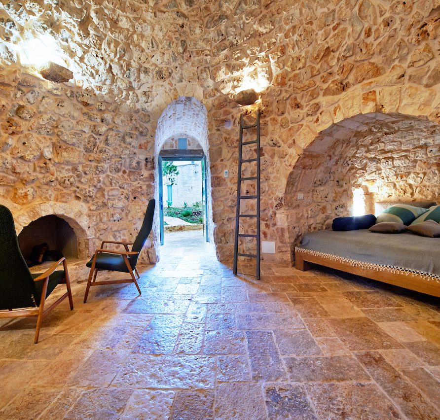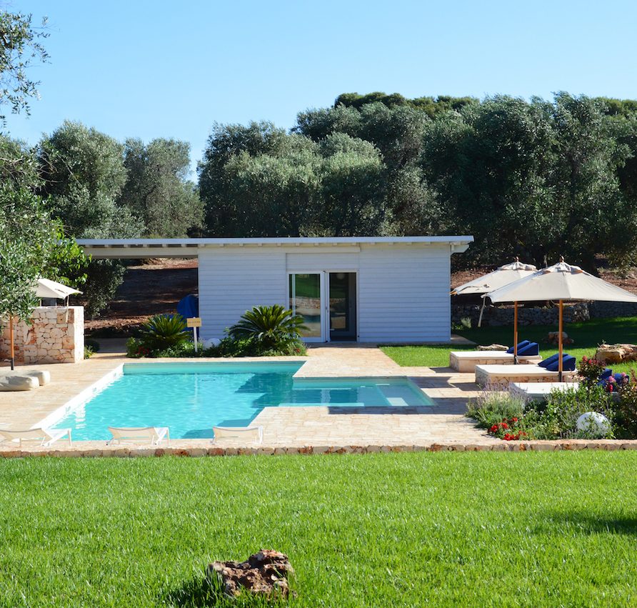 Ostuni Art is a luxury retreat located in the very heart of Apulia, close to the white city of Ostuni. The ensemble is nestled within private land more than 6 hectares of olive groves and it is composed of three stone buildings: the Trulli, the Lamia, and the Trullo Saraceno. A large swimming pool, 16×5 (max 7,5), high quality furniture and the ultimate privacy make this place perfect for relaxing and enjoy exclusive holiday. The three buildings that comprise this hidden retreat were built at the end of 1700 and at the beginning of 1800. Ostuni Art is a project of passion born from the architect Giorgio Angella and his brother Giulio, who dreamt of breathing life into the abandoned ruins. Using local craftsmen and traditional methods, they painstakingly restored the stone structures to their original beauty. As the 3 buildings are separated from the main house, the concept was to linked them together through the common areas: the lovely fully equipped kitchen and contemporary living room, the swimming pool with a huge sunbathing area, and the nearby areas with BBQ and wood-burning pizza oven. Inside the guests can breathe a magical air, the rooms in the Trulli or in the vaulted environments of stone transfer them into a timeless enchanted environment, every piece of furniture is made in Italy, sometimes exclusively for the resort other times they are recovered by expert restorers. The bathrooms are finished in the natural hues, the blue of the sky, the green of the olive tree leaves, the colors of the earth and stones.