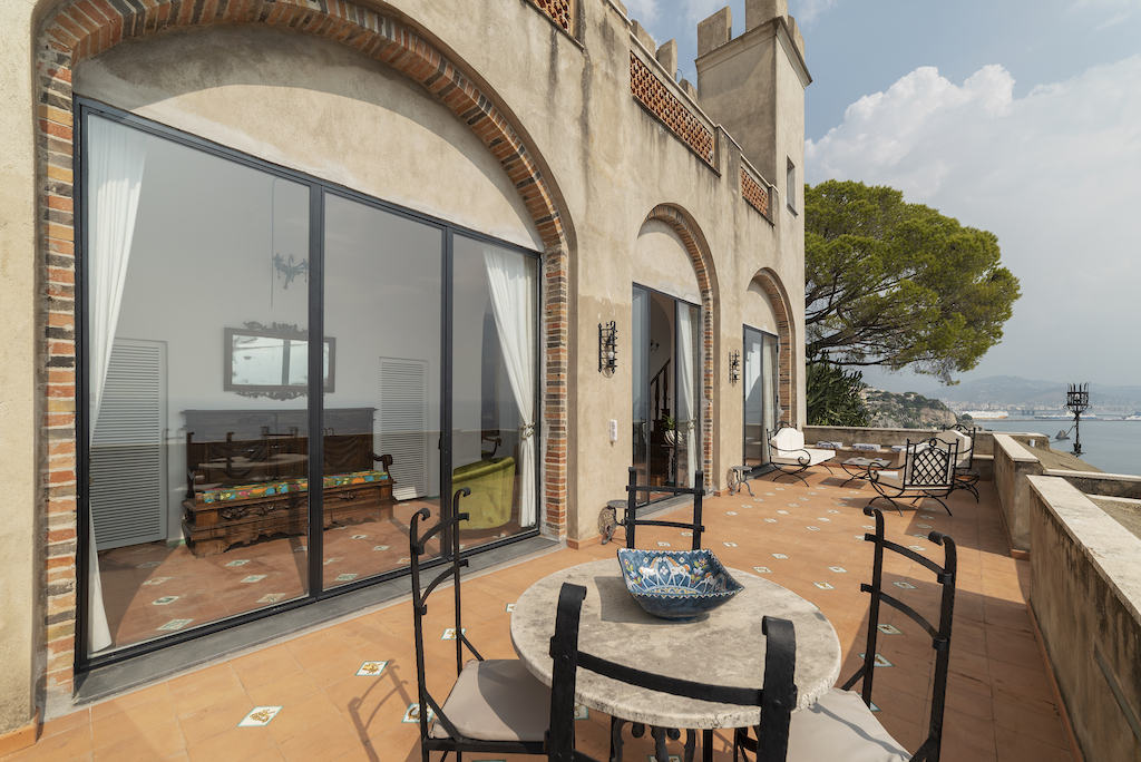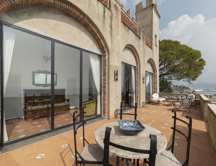 The main terrace, adjacent the principal access to the Tower, is furnished with a large marble table and comfortable sofas: perfect for alfresco dining or simply to make the most of the view and the breeze from the sea.
