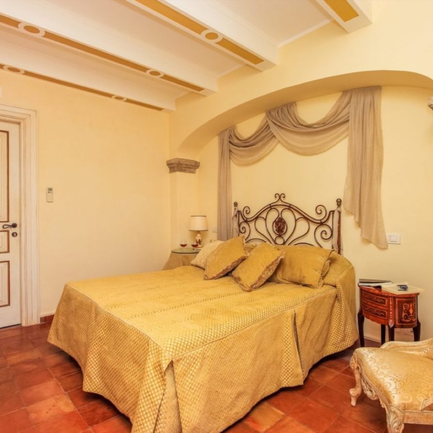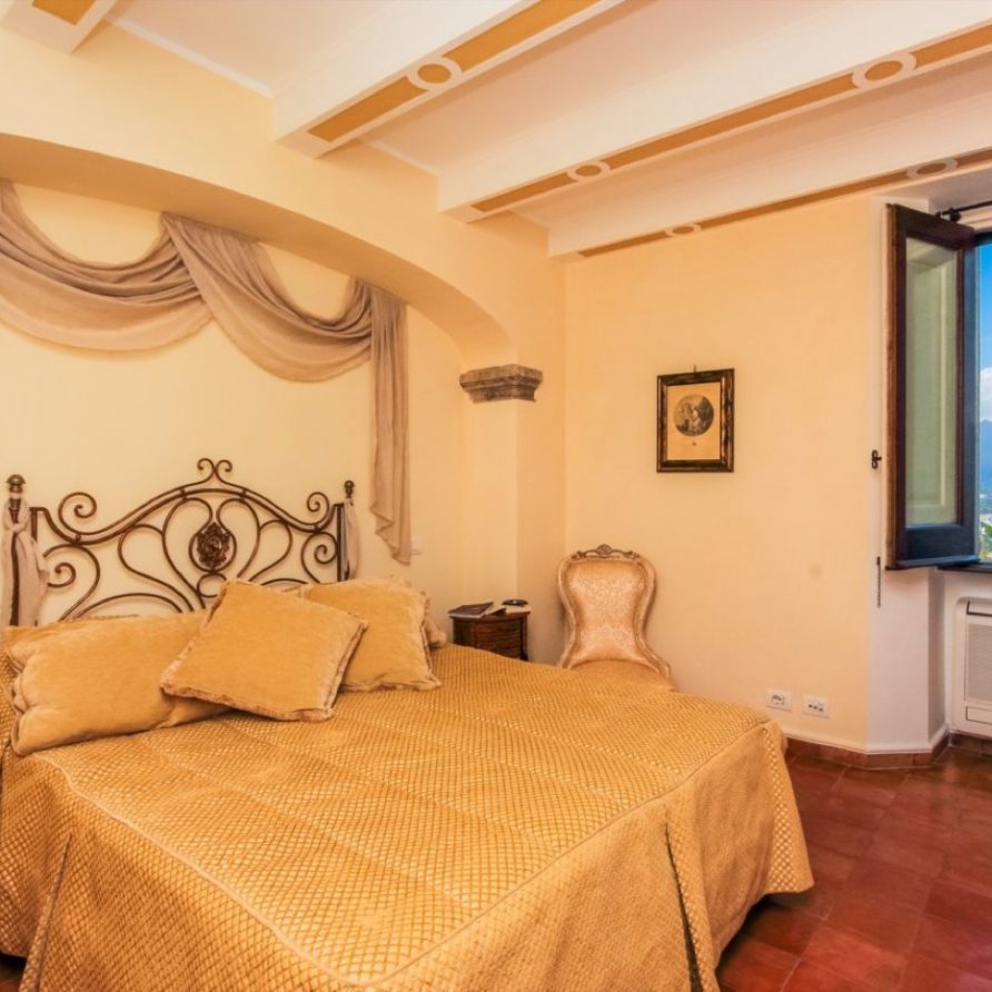 This floor has an office, 2 double bedrooms, a shower/sauna bathroom, 1 lounge with a double bed sofa, illuminated by a balcony opening onto the beautiful panoramic terrace of about 30 square meters, a third double bedroom overlooks the sea, a corridor equipped with beautiful cupboards with gold trim sizes, where there is the second bathroom with a hydro massage bathtub, 1 large completely equipped kitchen/dining room (dishwasher, oven, freezer, fridge, cooking plate with 5 stoves, microwave oven) furnished with a splendid fireplace. Third Level: an outdoor staircase leads to the Villa’s upper floor with an external shower bathroom and laundry area (2 washing machines, laundry, drying rack); few steps lead to the solarium terrace (suspended between the sea and the rocky coast with the ancient Saint Rosa Monastery), equipped with sun beds, outdoor shower, table, chairs and embellished with a characteristic brick bench. From the terrace by descending a few steps there is a direct access to the Attic composed of living room with one place bed sofa, table, kitchen cupboard and fridge, 1 double bedroom & 1 shower bathroom. All the bedrooms of the Villa are laid out to guarantee the guests absolute privacy.