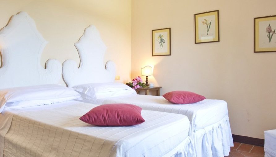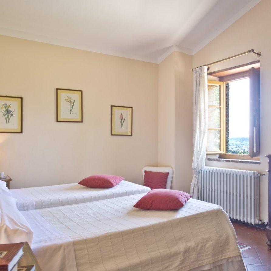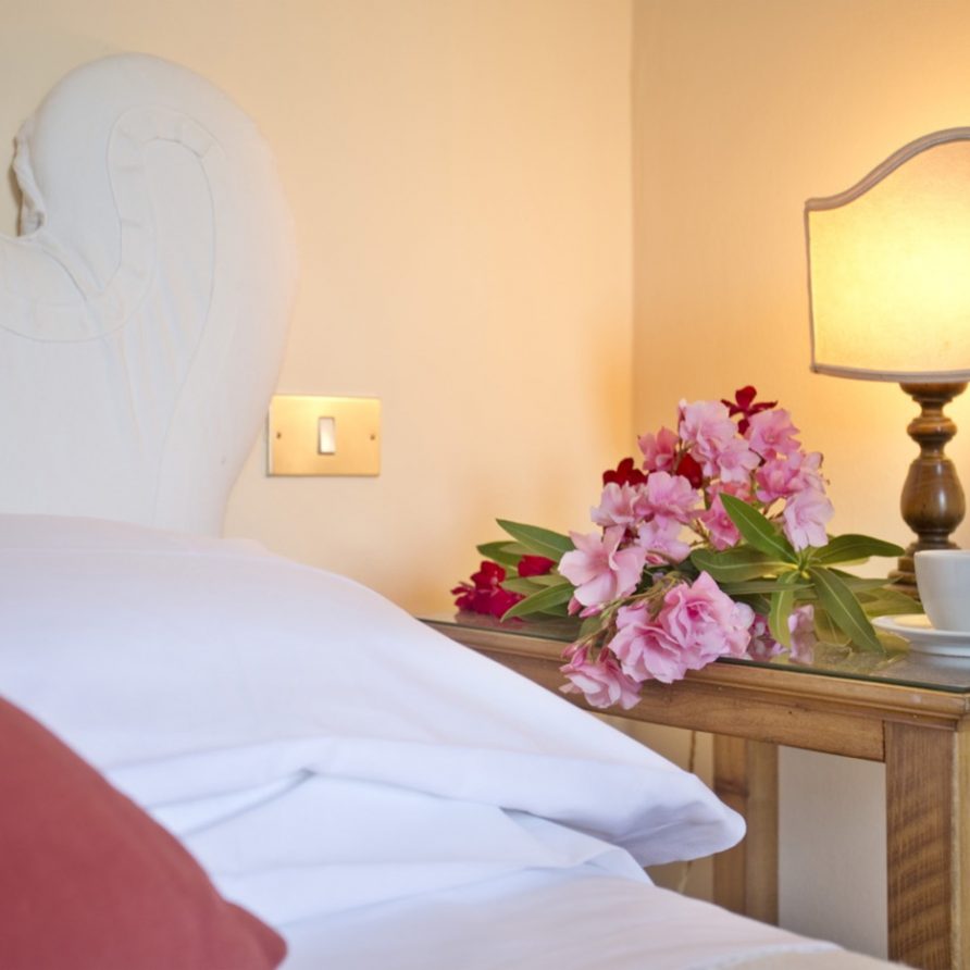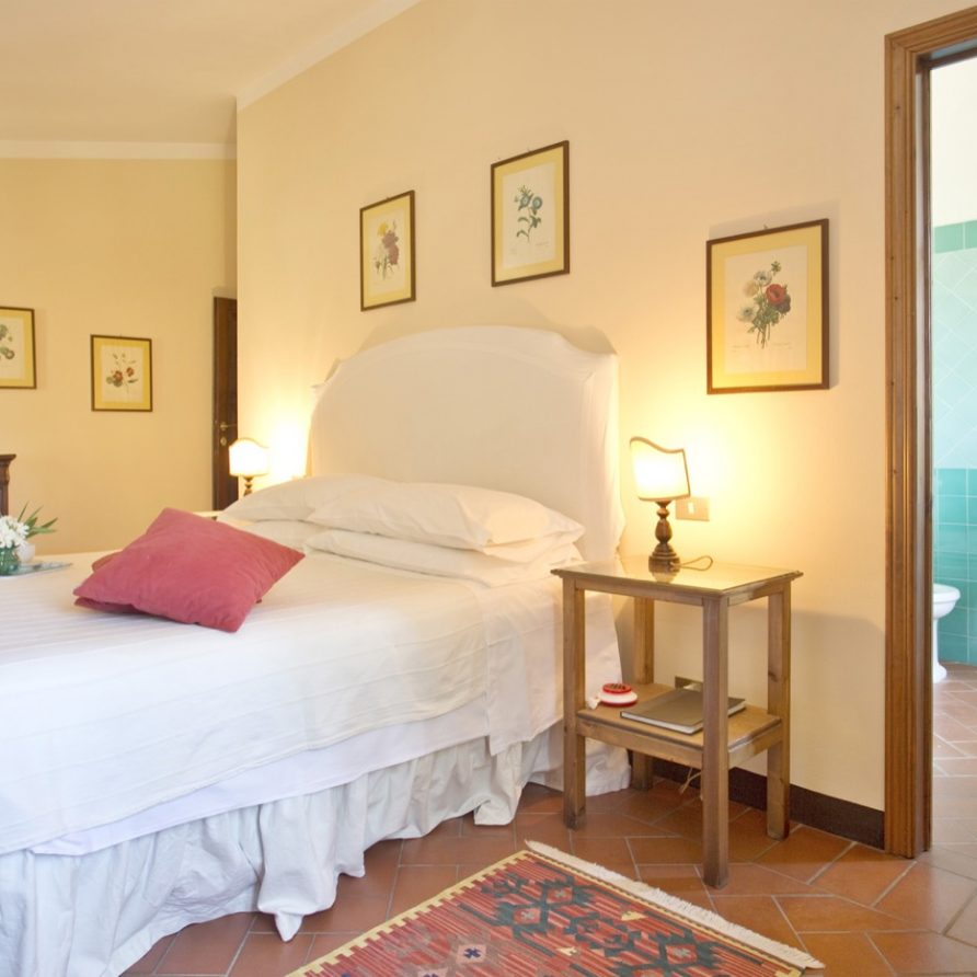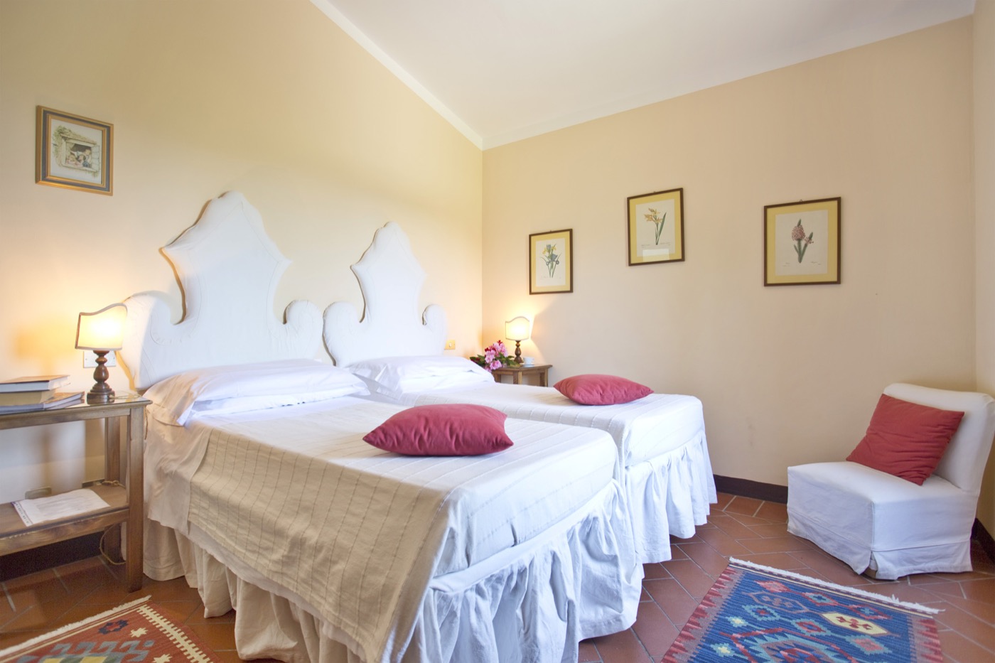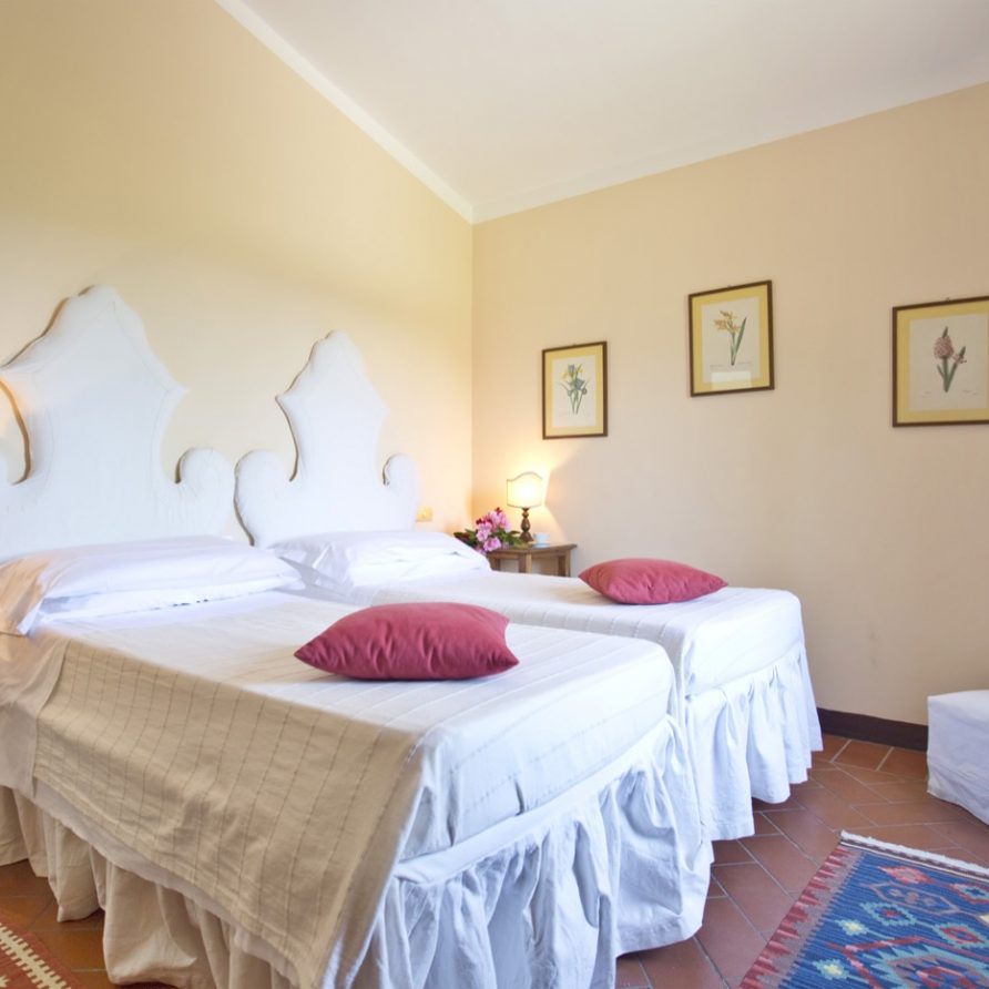 Double bedroom: Two single joinable beds with antique Florentine upholstered headboards welcome the guest to this nice room with in-suite bathroom. A beautiful wardrobe and matching chest of drawers offer our guests all the necessary room for their clothes.