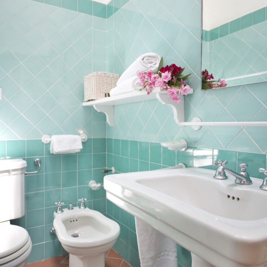 Green tiles make the nice atmosphere of this bathroom. It is also fully equipped for the disabled.