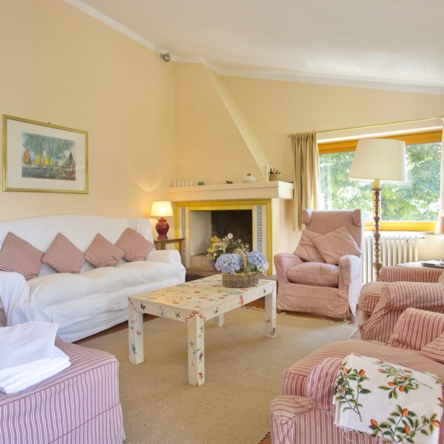 To the right a comfortable sofa with 2 armchairs and an ottoman nestle around the fireplace framed in tiles from Vietri.