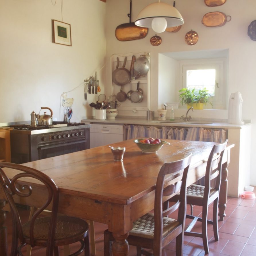 The kitchen, rustic, well-stocked opens onto the garden and veranda.
