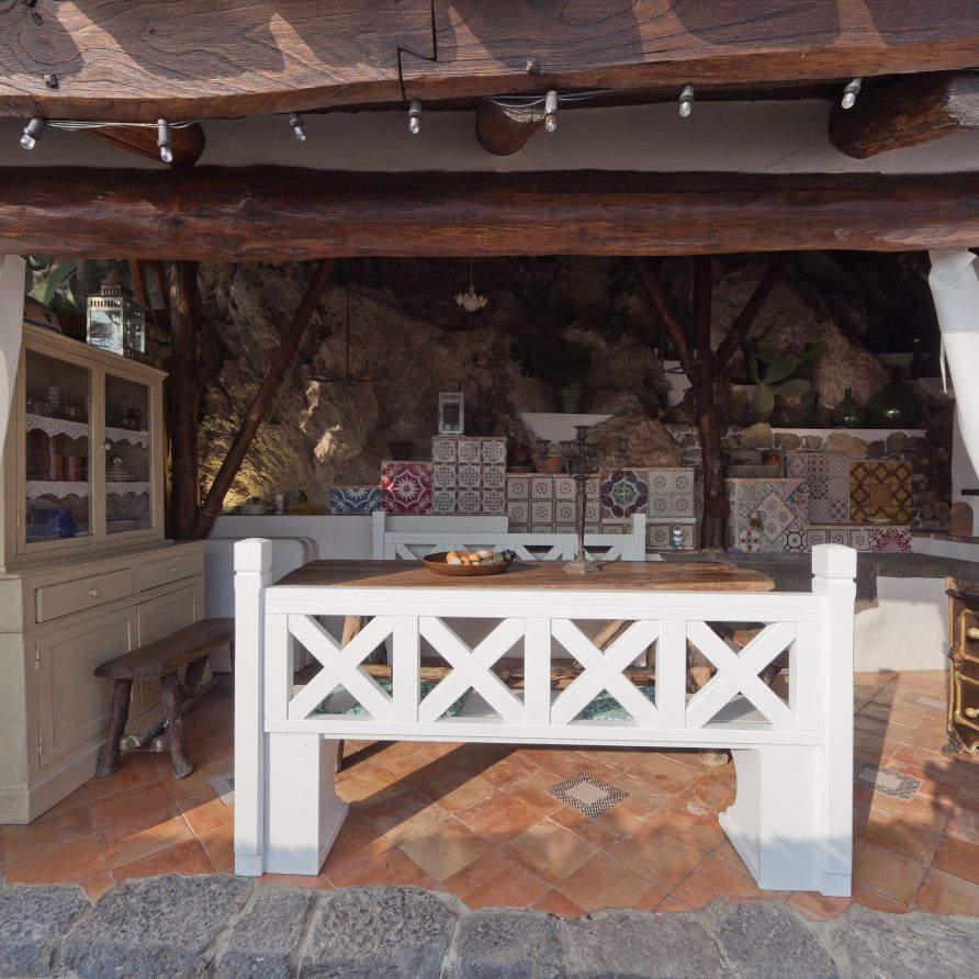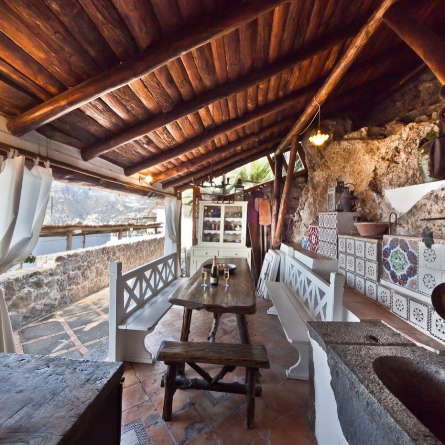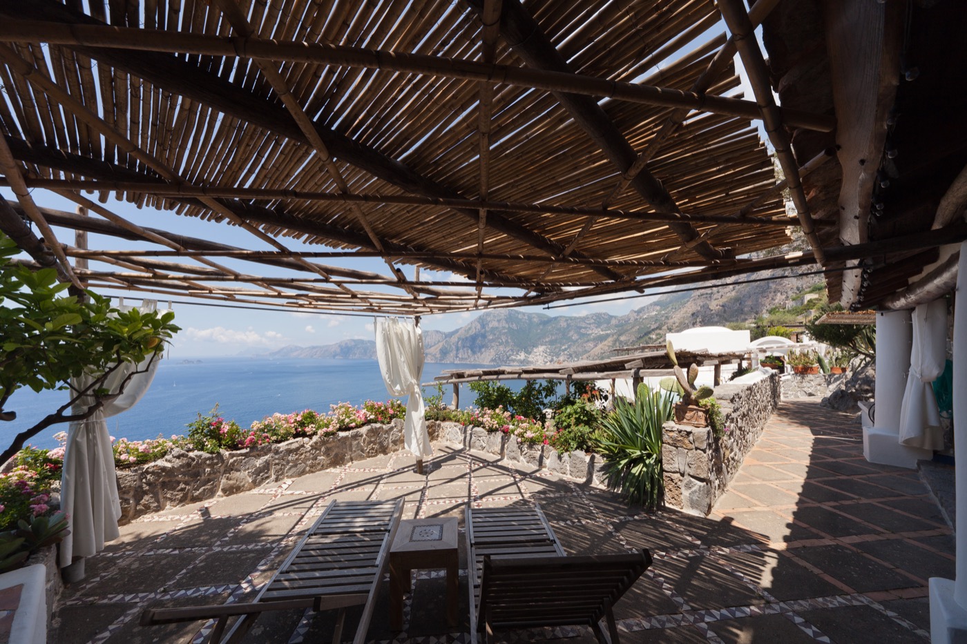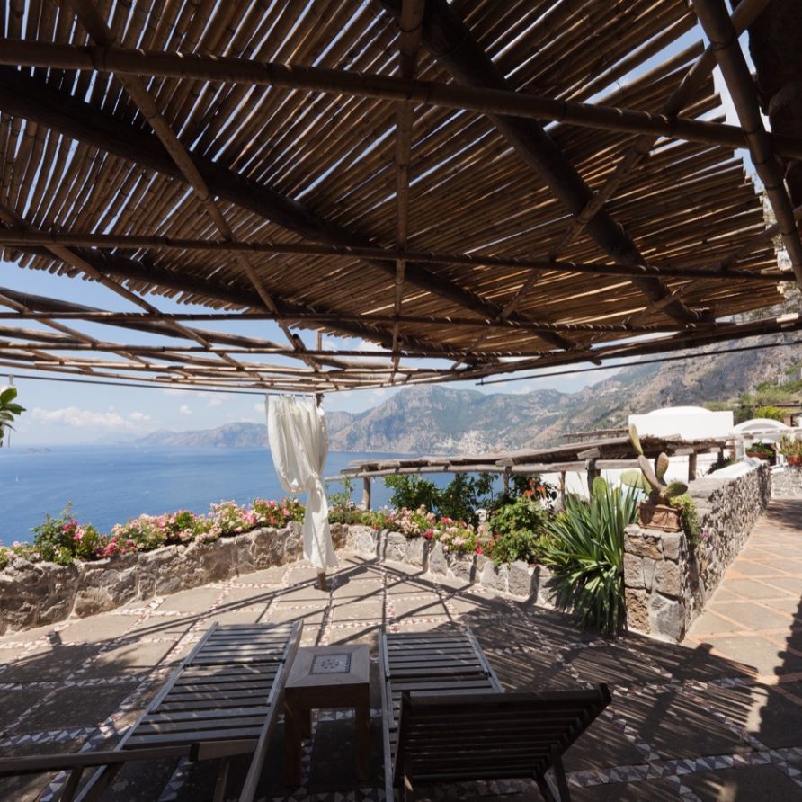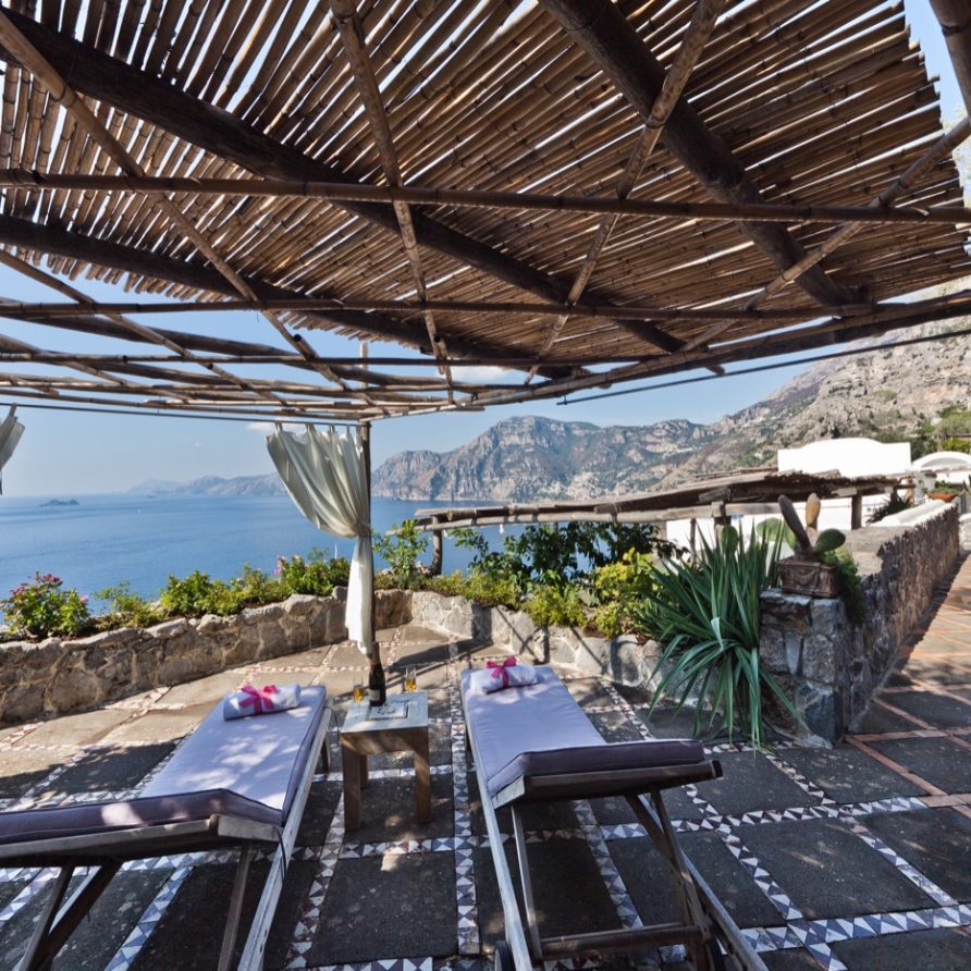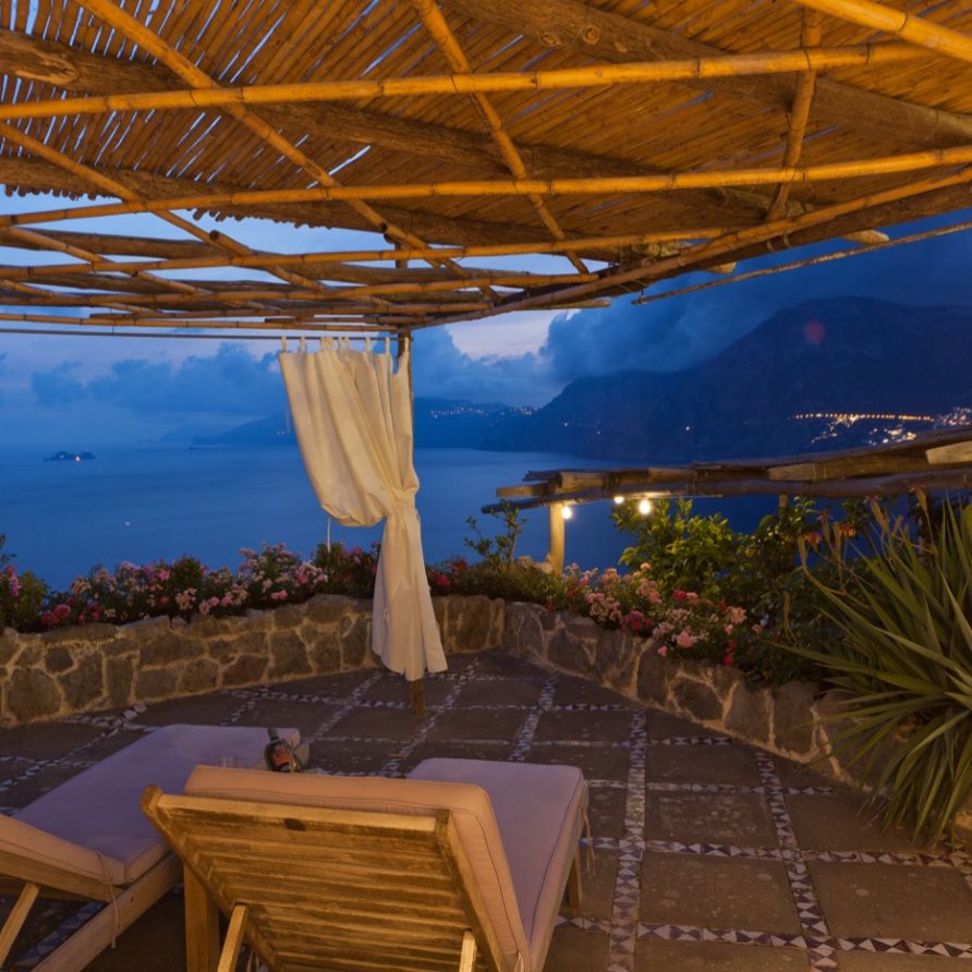The fourth terrace is 50 square meters (540 square feet) large. You will be able to enter it from the second bedroom and from the third bedroom. It is partly shaded by a pergola with a bamboo roof. The terrace is equipped with masonry benches, as well as with tables, chairs and a deck chair. From the terrace you will enjoy a fascinating view of the sea, of Praiano and the coast of Amalfi and of the small Li Galli islands at a distance.
