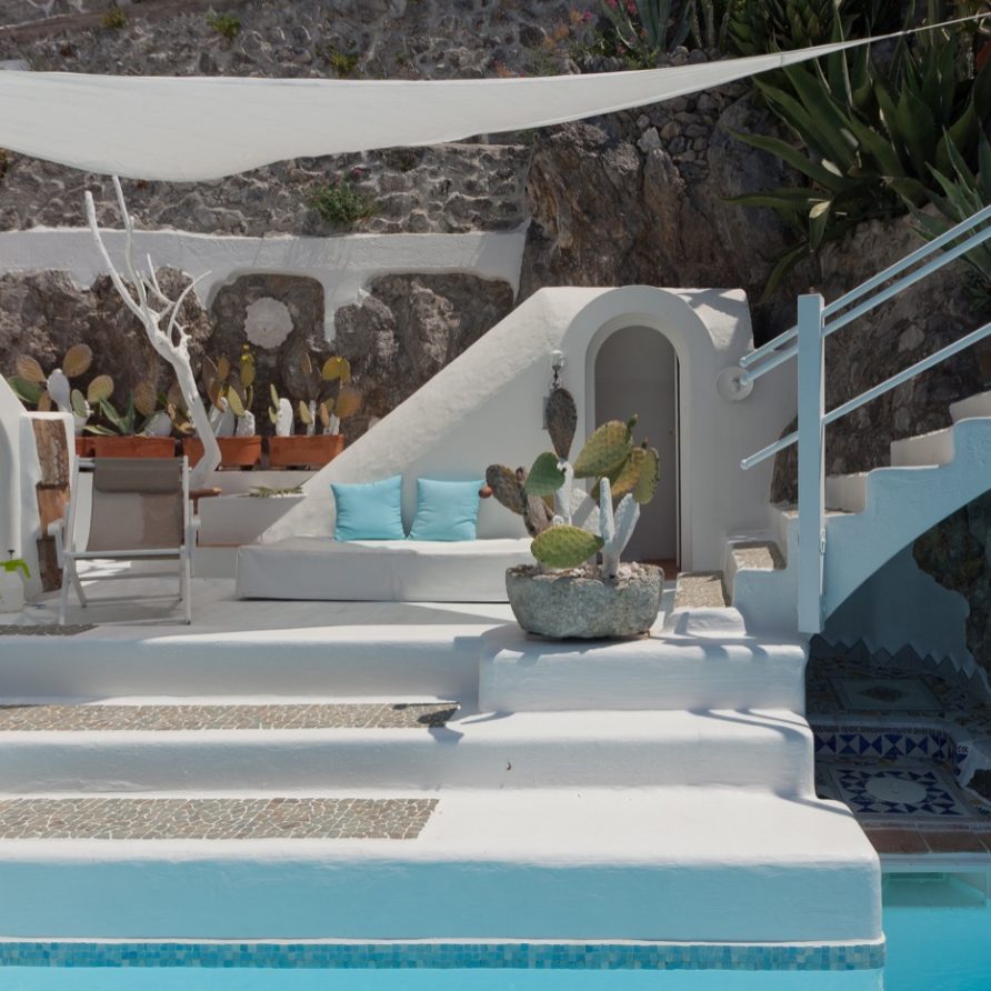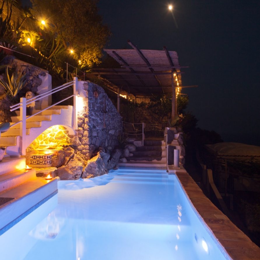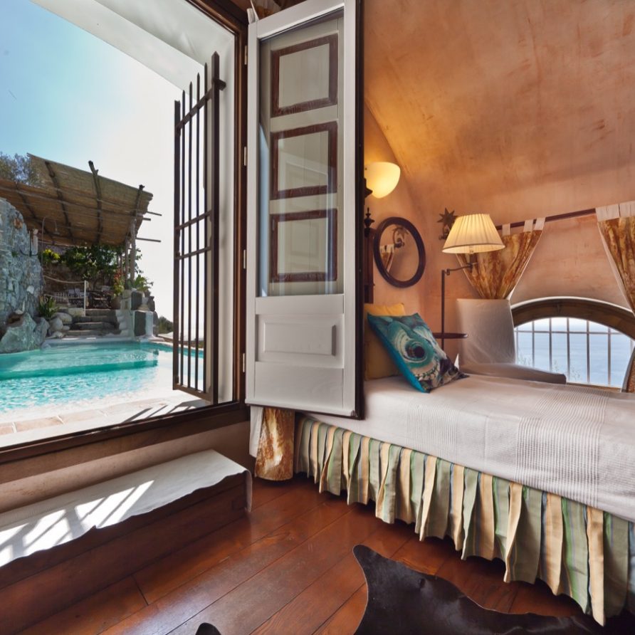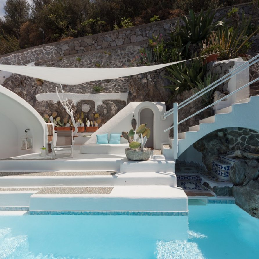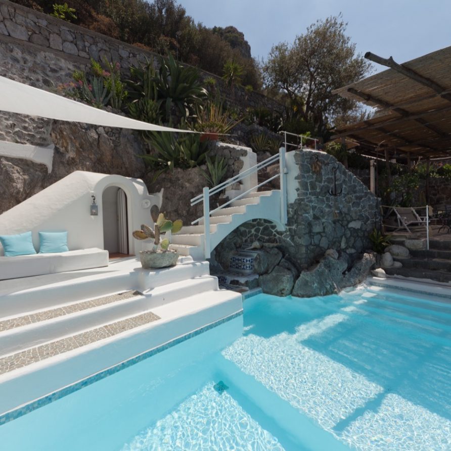Located between lemons, olive trees surrounded by the Mediterranean, the Villa has a spectacular view suspended between sky and sea and overlooks a wonderful country, Praiano, in front of one of the most beautiful views in the world: the island of Capri, the Faraglioni, the Sorrento peninsula, Positano, and the Li Galli archipelago (formerly Nureiev property as well as the Island of the Sirens in the Odyssey of Ulysses).