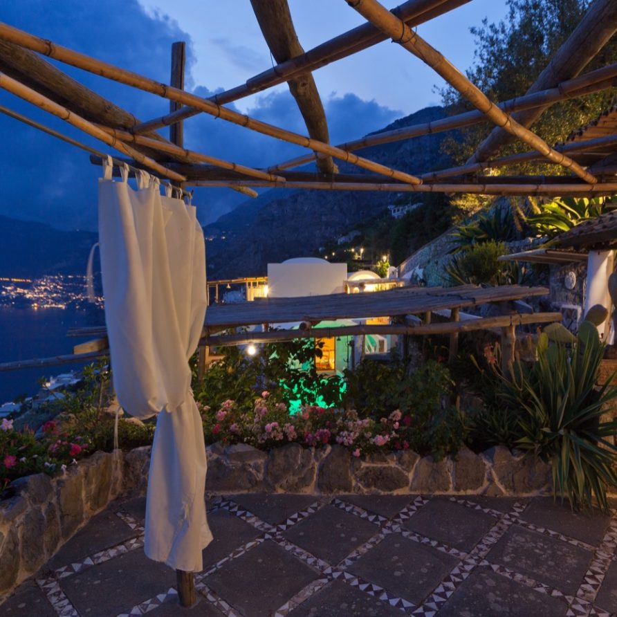 The garden is 50 square meters (540 square feet) large. It is partly shaded by a pergola. The garden is equipped with wood benches. From the garden you will enjoy an enchanting view of the sea, of Praiano and the coast of Amalfi.