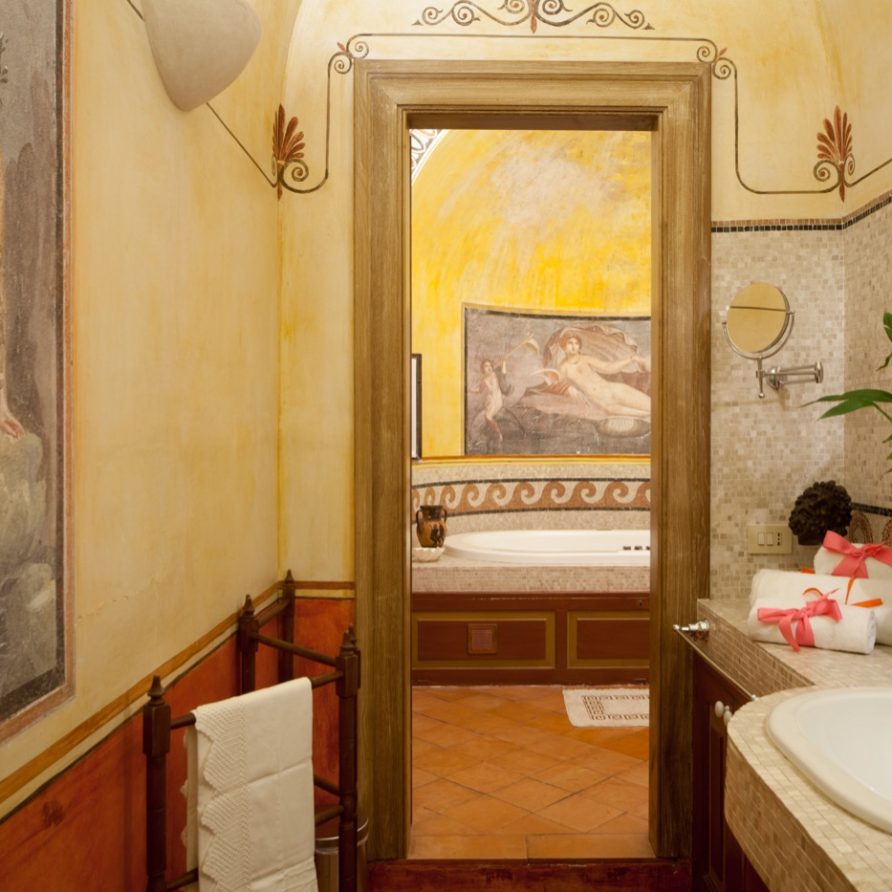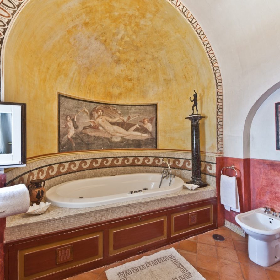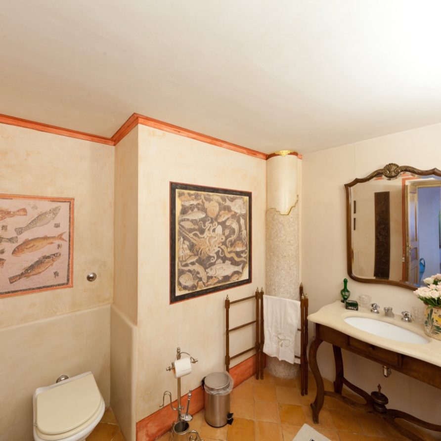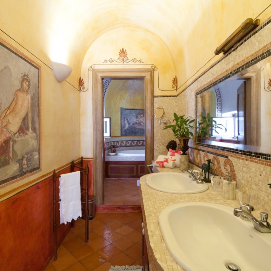 The bathroom is tiled with lucid handmade majolica tiles and equipped with a washbasin, a toilet and a Jacuzzi bathtub. You will be able to enter the bathroom from the corridor.
