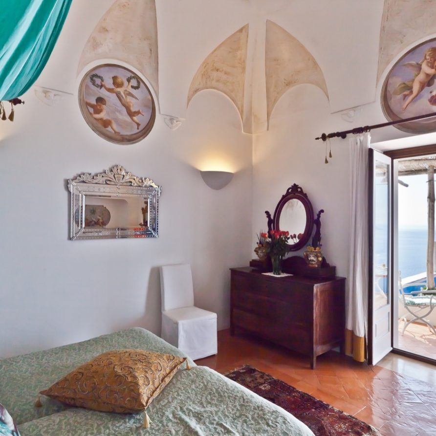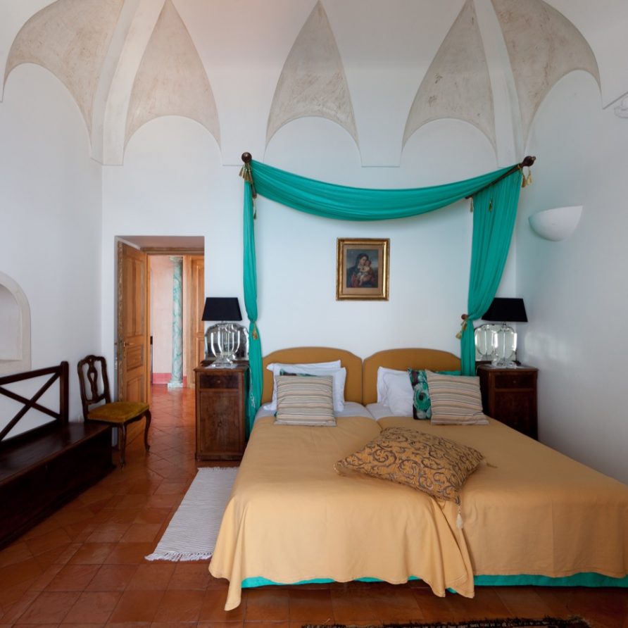 You will be able to enter the third bedroom from the corridor. The ceiling is high and vaulted. It has two twin beds (80 cm/32 inches), that can be pushed together into a matrimonial bed if requested (please contact our staff in advance to make arrangements). The furnishings include an armchair and a desk. From the bedroom you will be able to enter the fourth terrace with a view of the sea and of the coast of Amalfi through a French door. The bedroom is equipped with an air conditioning/heating unit.