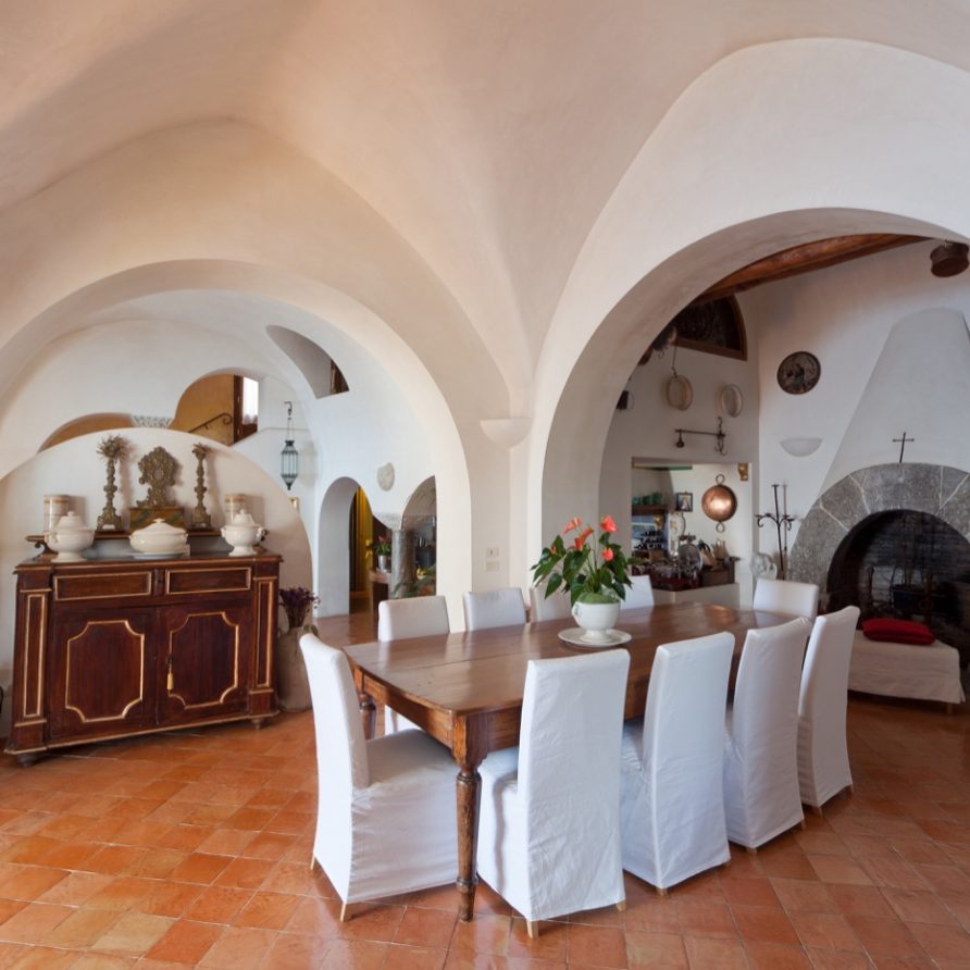 The dining table can accommodate ten guests. From the living room you will be able to enter the third terrace with a view of the sea and of the coastline through a French door. The room has two windows with a view of the sea and of the island of Li Galli. It is equipped with an air conditioning/heating unit.