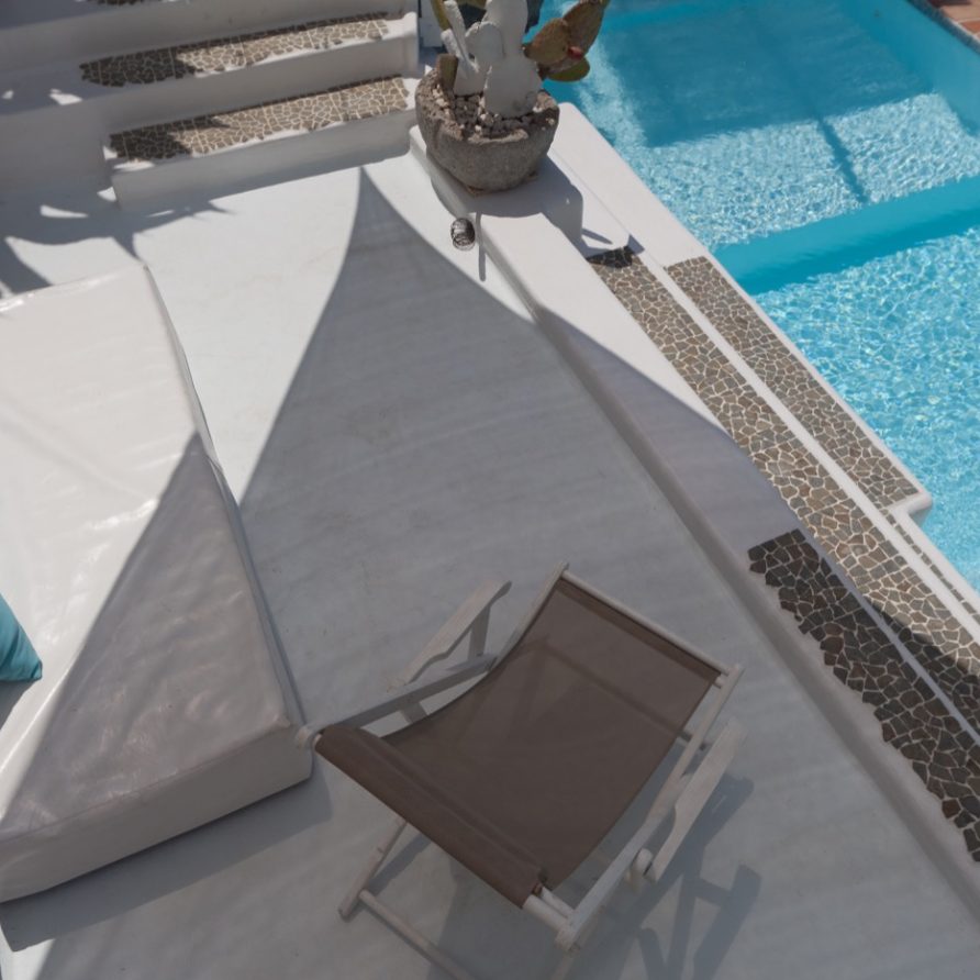 The swimming pool is 2.5 meters (8 feet) large by 8 meters (26 feet) long, from 20 centimeters (8 inches) 2.2 meters (7.2 feet) deep. It has a whirlpool corner. The area is equipped with a table, chairs, a sun umbrella and two deck chairs.