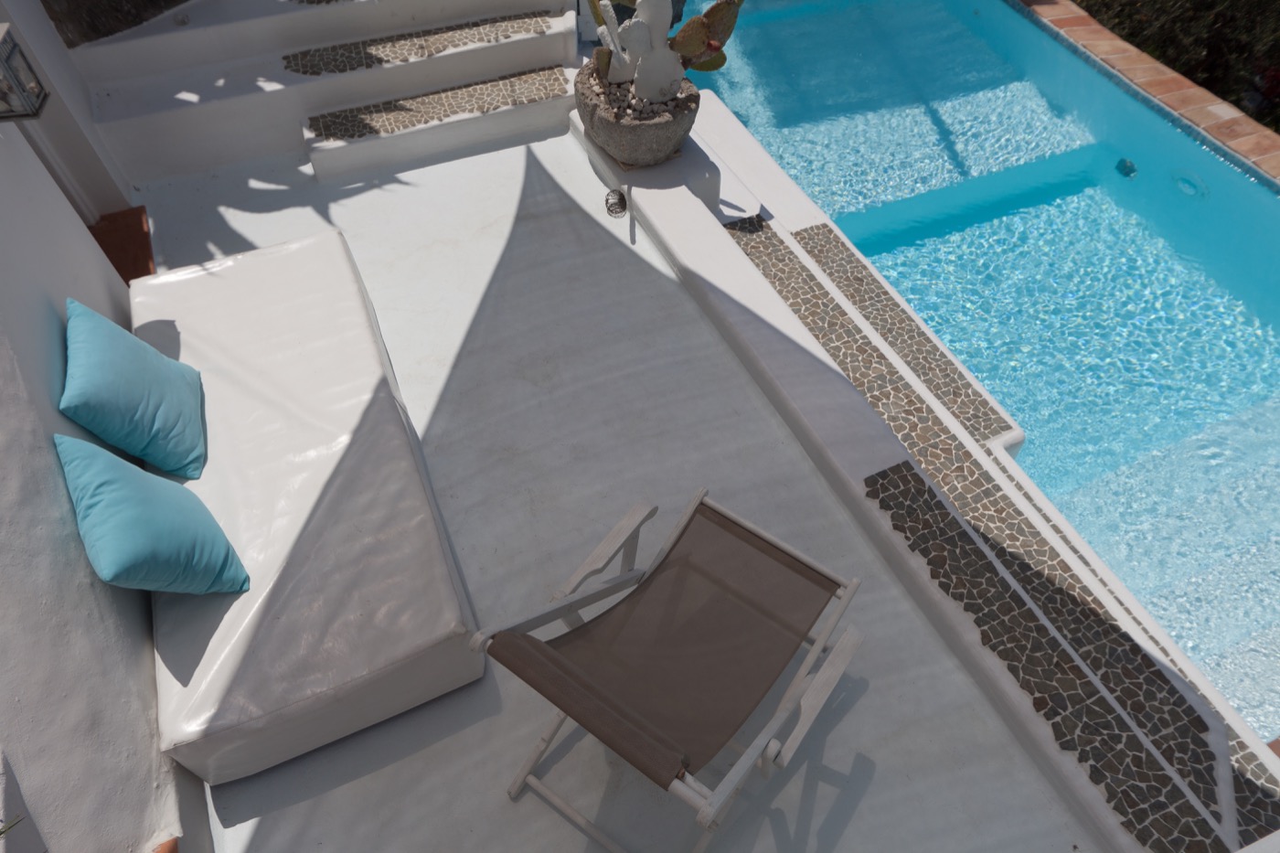the mezzanine level from the second living room climbing 13 steps. The mezzanine has a matrimonial bed (160 cm/62 inches, wider than a queen-size bed), as well as a twin bed (80 cm/32 inches). The ceiling is high and vaulted. From the mezzanine level you will be able to enter the swimming pool with a view of the sea and of the coastline through a French door.