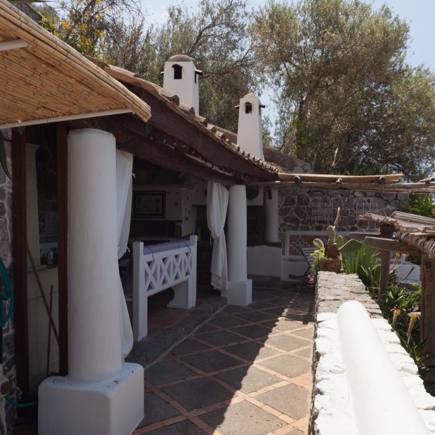 The third terrace is 40 square meters (430 square feet) large. You will be able to enter it from the second terrace. It is partly shaded by a wood roof. The terrace is equipped with wood benches, as well as with a table, chairs, a sun umbrella, two deck chairs and two sun loungers. Here you will also find a brickwork barbecue and a wood-fired pizza oven. From the terrace you will enjoy a splendid view of the sea,