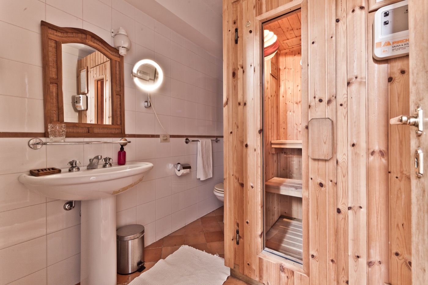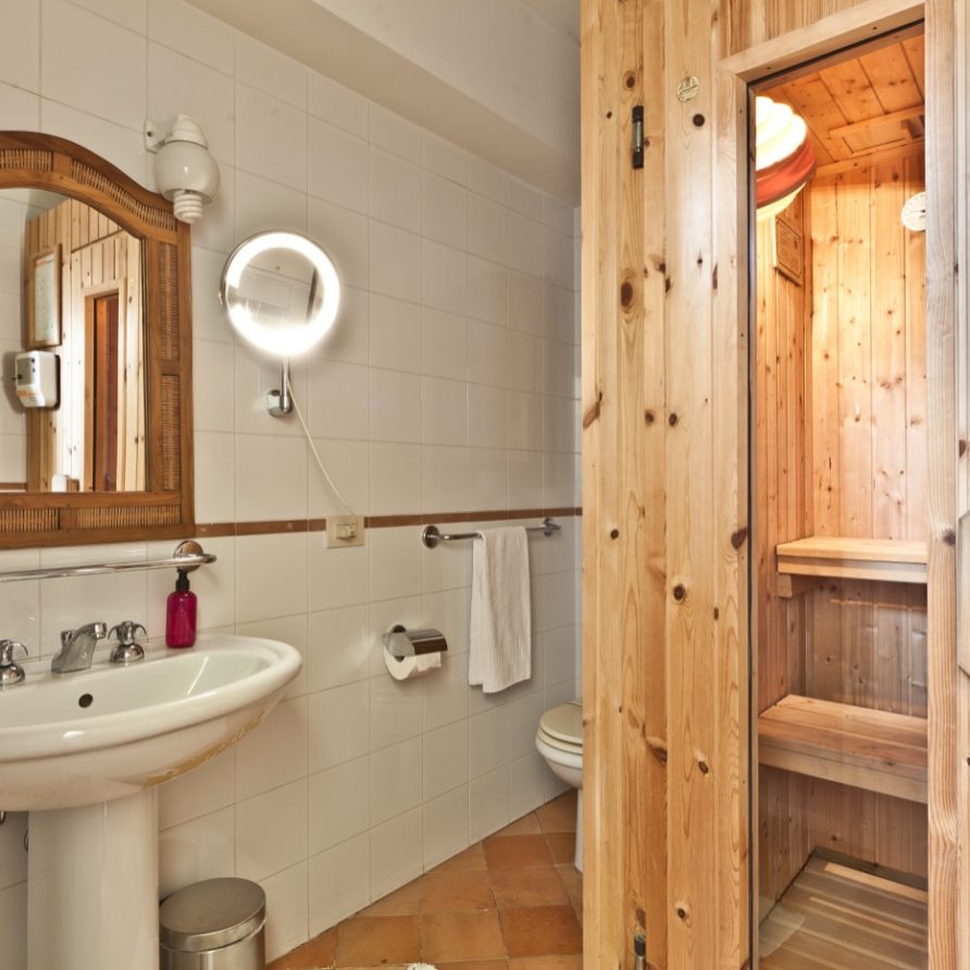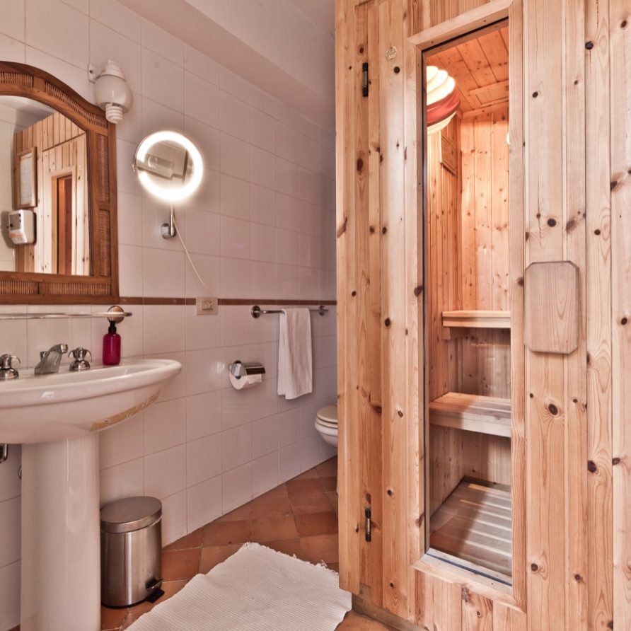 You will be able to enter the wellness room from the second living room going down eight steps. In the wellness room you will find a sauna. This room has a bathroom, equipped with a washbasin, a toilet and a fully enclosed shower.
