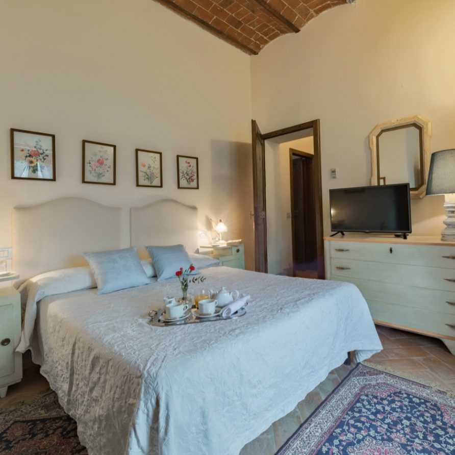 The first living room is paved with original terracotta tiles. The ceiling is high and vaulted. The furnishings are classic and welcoming, and include some antique pieces. The furnishings include wood benches and an armchair. There is a big and elegant fireplace made of stone, for decorative purposes only. In the living room you will also find a cooking area. The kitchenette is very well equipped, with a five-burner gas cooker, an electric oven, a large refrigerator with freezer, a dishwasher, a microwave oven, an Italian-style coffee-maker, a toaster and other small appliances.