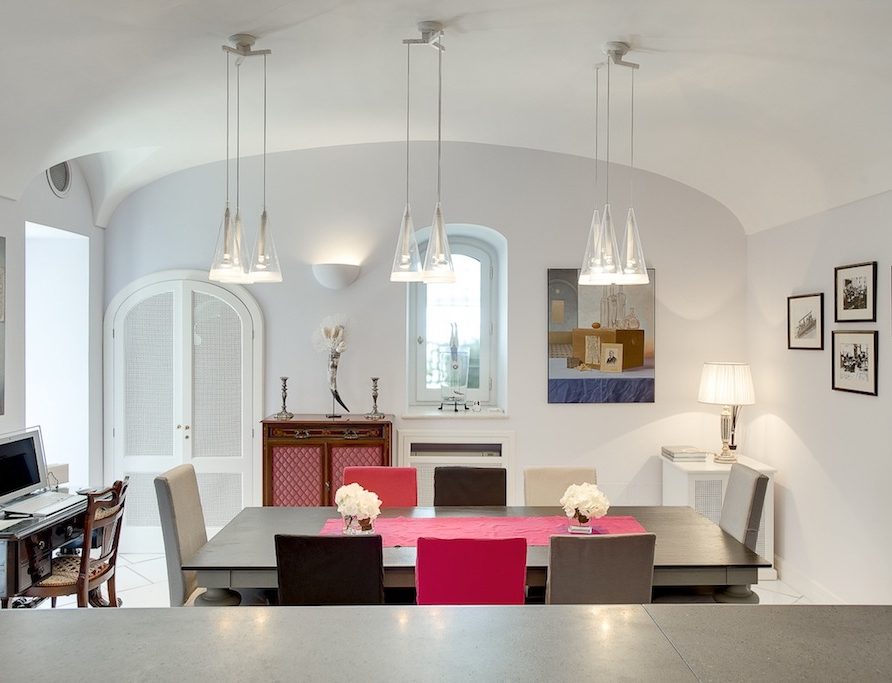 Continuing you will find the kitchen & dining room area with elegant design elements and antique prints of the Amalfi Coast.