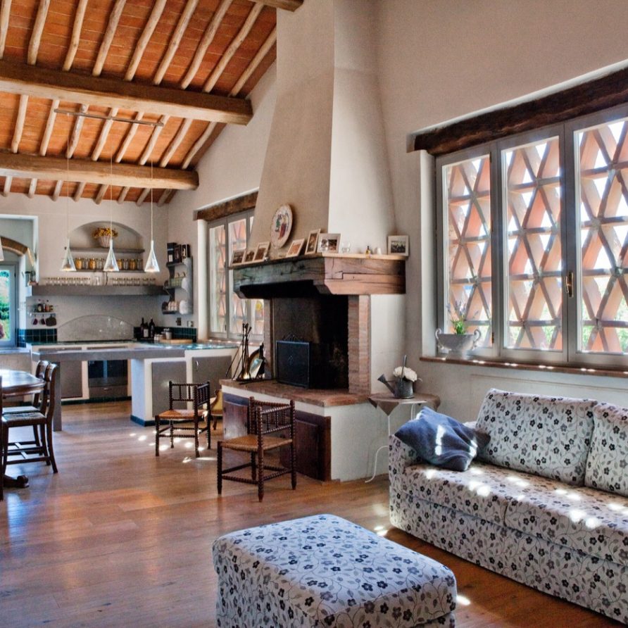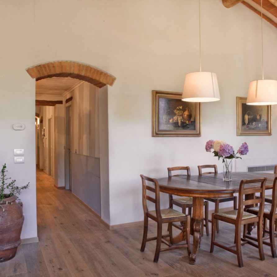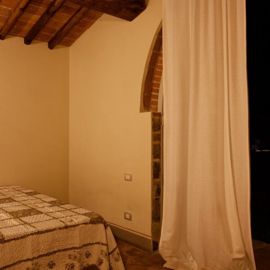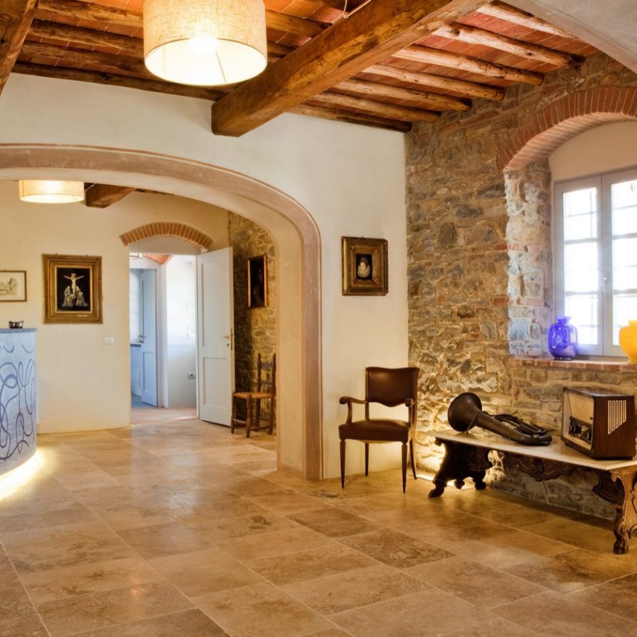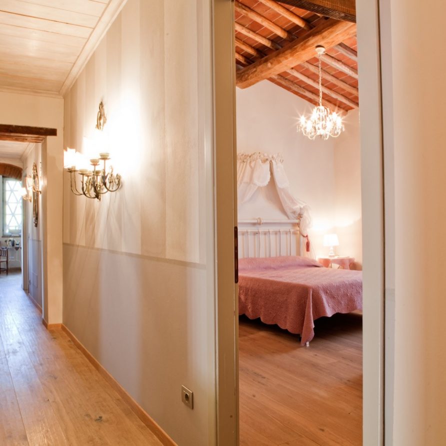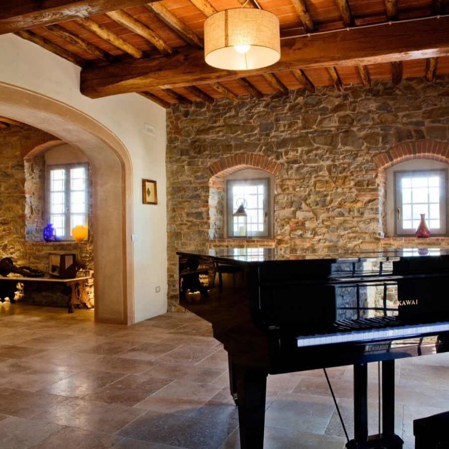 The villa is in the typical materials of the area….stone, wooden beams, arched ceilings.The interior is in pale pastel colours, with areas for relaxing, fireplaces…..very authentic Tuscan cordiality and family feeling. The main villa (460 sq m) has a principle entrance –grounf floor- which leads to a spacious and well-equipped kitchen. This is ideal for cooking lessons and leads to the dining room. The rest of the ground floor is composed of an enormous lounge area which includes a grand piano There is also a small bathroom. On the first floor there are six bedroom….four doubles, a twin bedroom and a single bedroom.Each bedroom has its own bathroom and one has a bathtub. On this floor there is also a second kitchen and lounge area with a lovely view over the surrounding countryside.