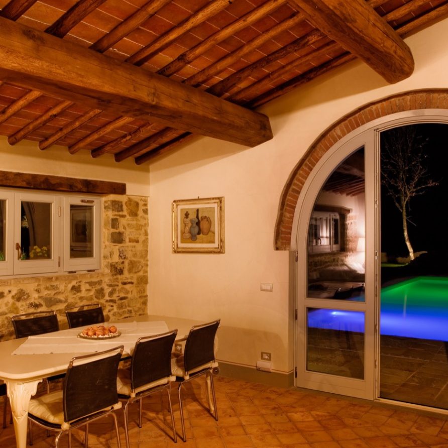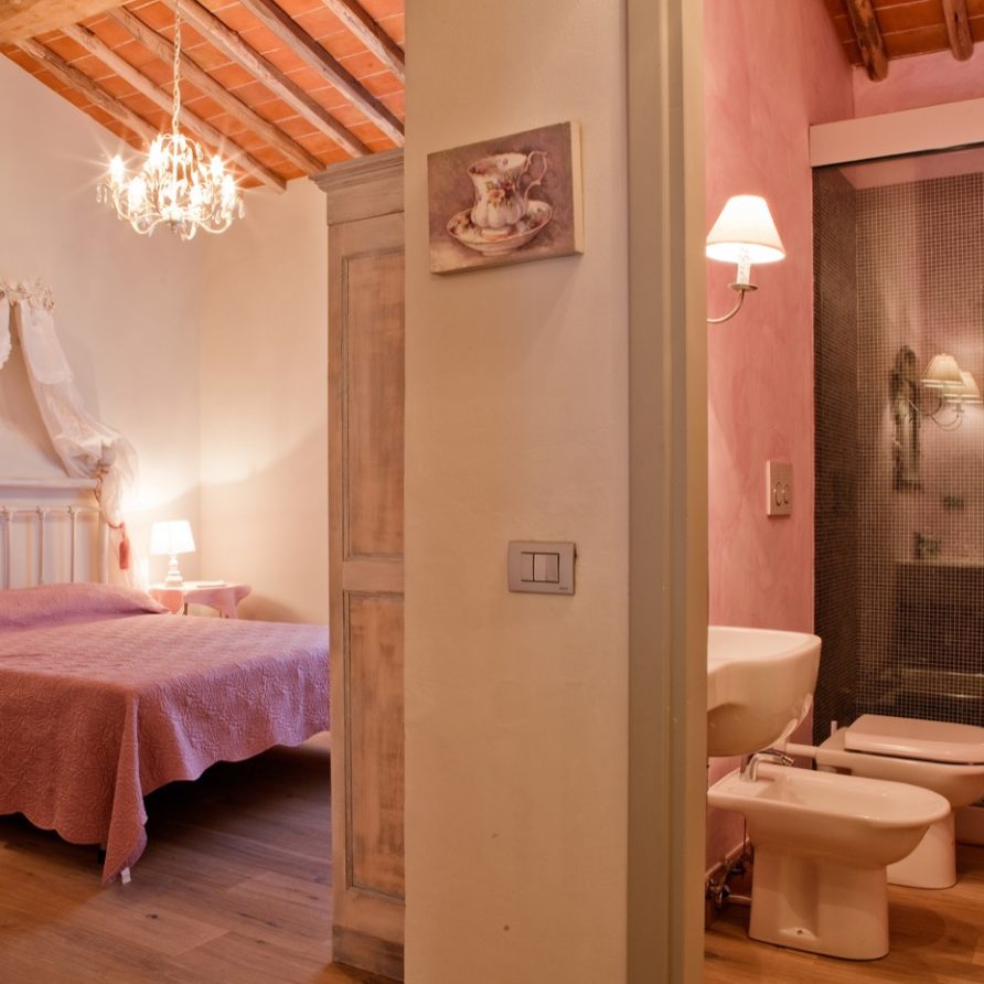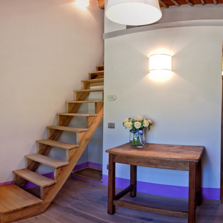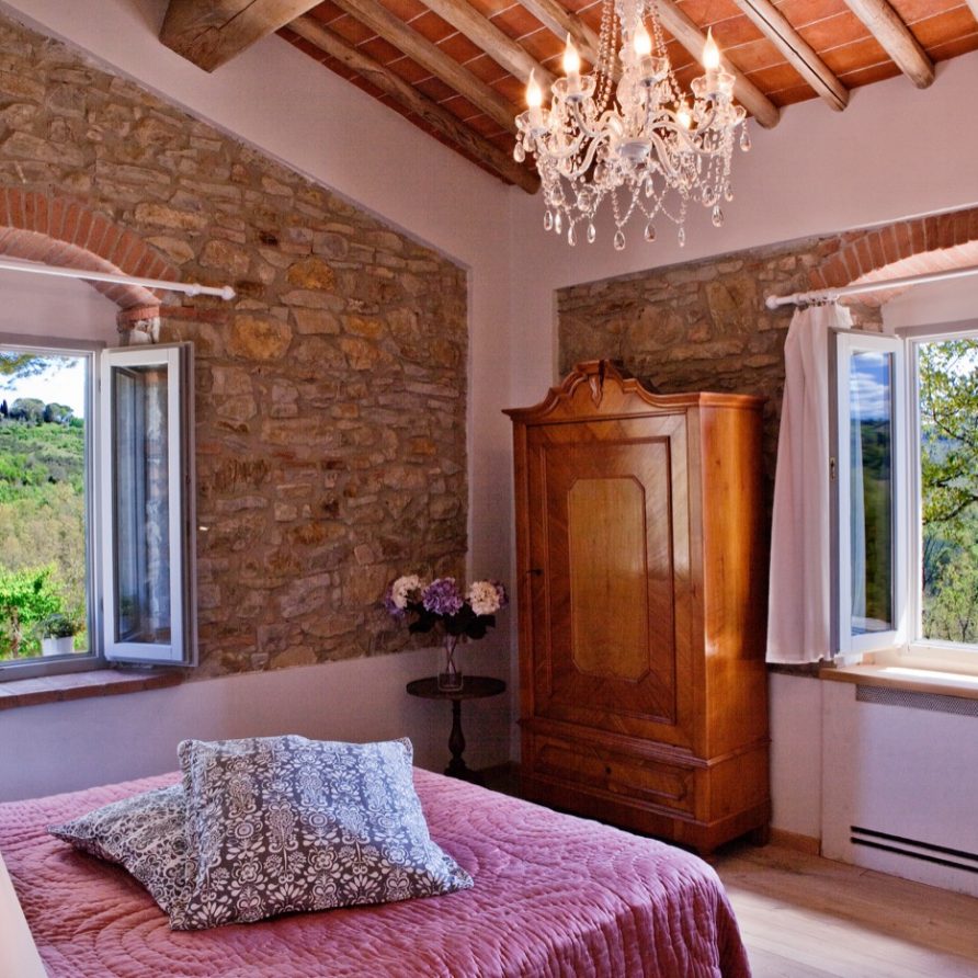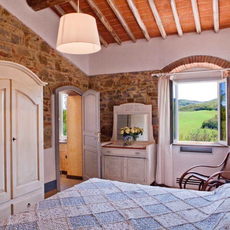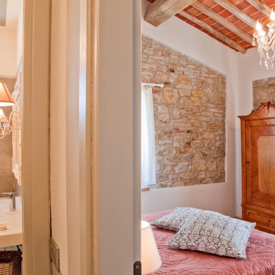 The villa is in the typical materials of the area….stone, wooden beams, arched ceilings.The interior is in pale pastel colours, with areas for relaxing, fireplaces…..very authentic Tuscan cordiality and family feeling. The main villa (460 sq m) has a principle entrance –grounf floor- which leads to a spacious and well-equipped kitchen. This is ideal for cooking lessons and leads to the dining room. The rest of the ground floor is composed of an enormous lounge area which includes a grand piano There is also a small bathroom. On the first floor there are six bedroom….four doubles, a twin bedroom and a single bedroom.Each bedroom has its own bathroom and one has a bathtub. On this floor there is also a second kitchen and lounge area with a lovely view over the surrounding countryside.