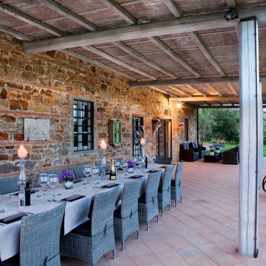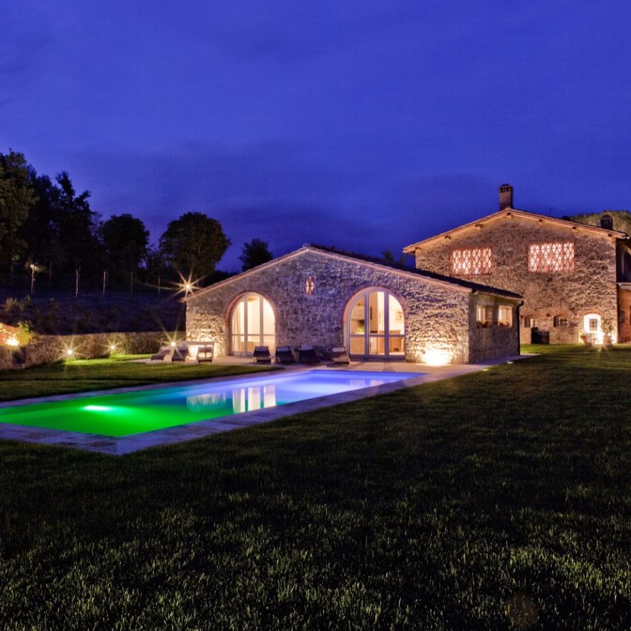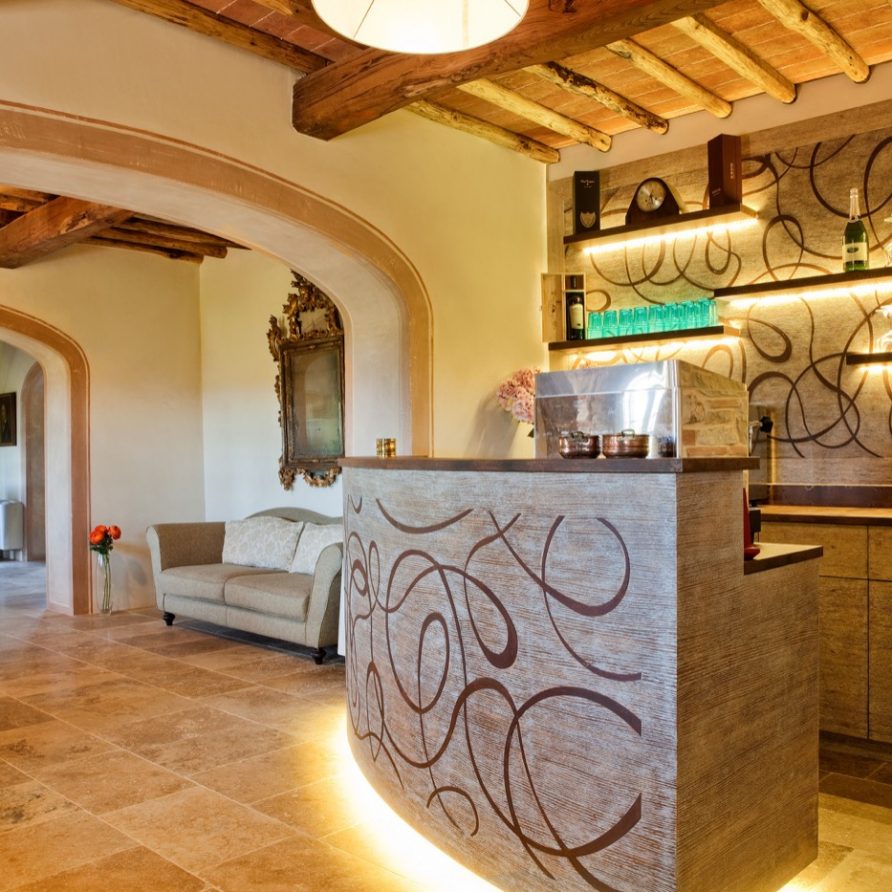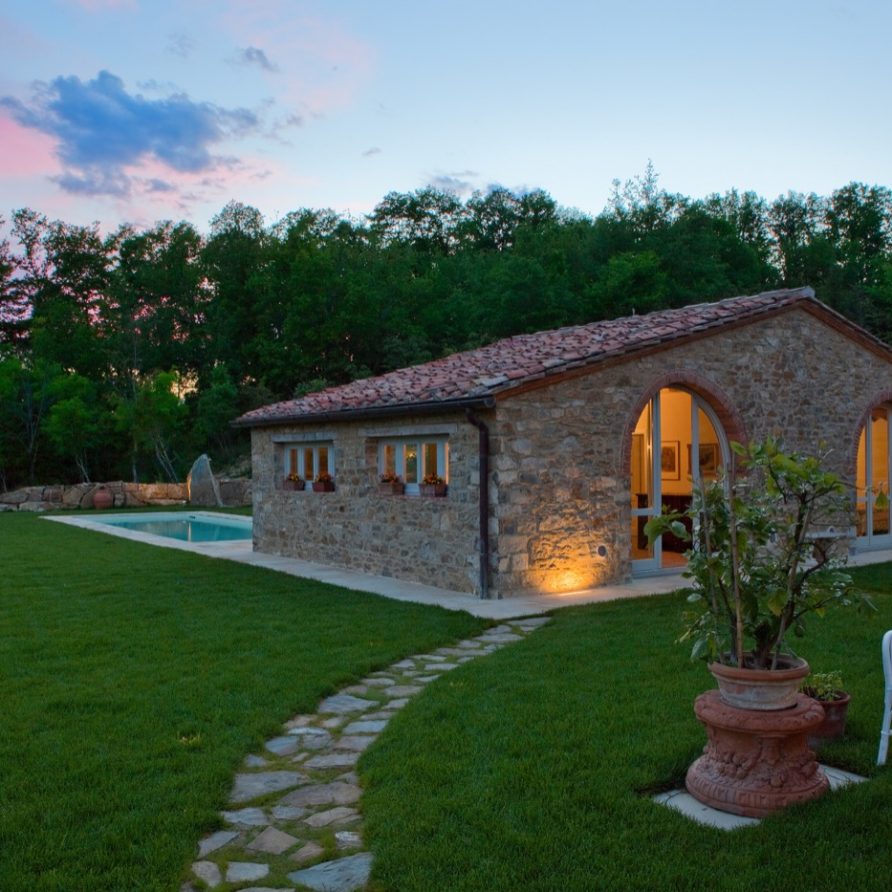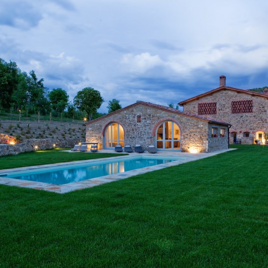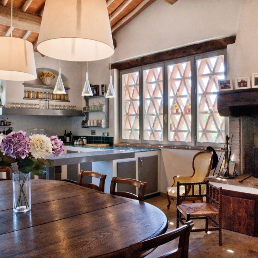 The villa is in the typical materials of the area….stone, wooden beams, arched ceilings.The interior is in pale pastel colours, with areas for relaxing, fireplaces…..very authentic Tuscan cordiality and family feeling. The main villa (460 sq m) has a principle entrance –grounf floor- which leads to a spacious and well-equipped kitchen. This is ideal for cooking lessons and leads to the dining room. The rest of the ground floor is composed of an enormous lounge area which includes a grand piano There is also a small bathroom. On the first floor there are six bedroom….four doubles, a twin bedroom and a single bedroom.Each bedroom has its own bathroom and one has a bathtub. On this floor there is also a second kitchen and lounge area with a lovely view over the surrounding countryside.