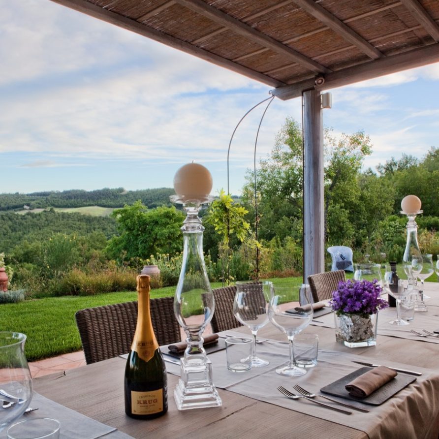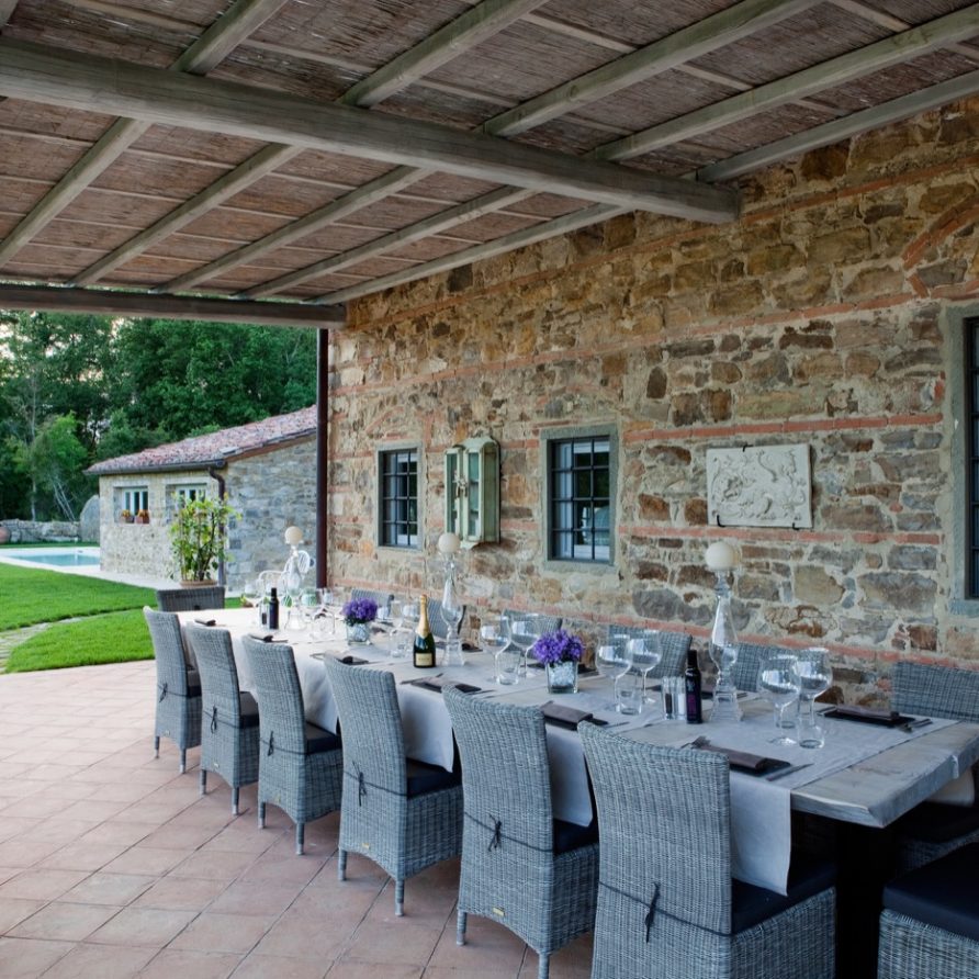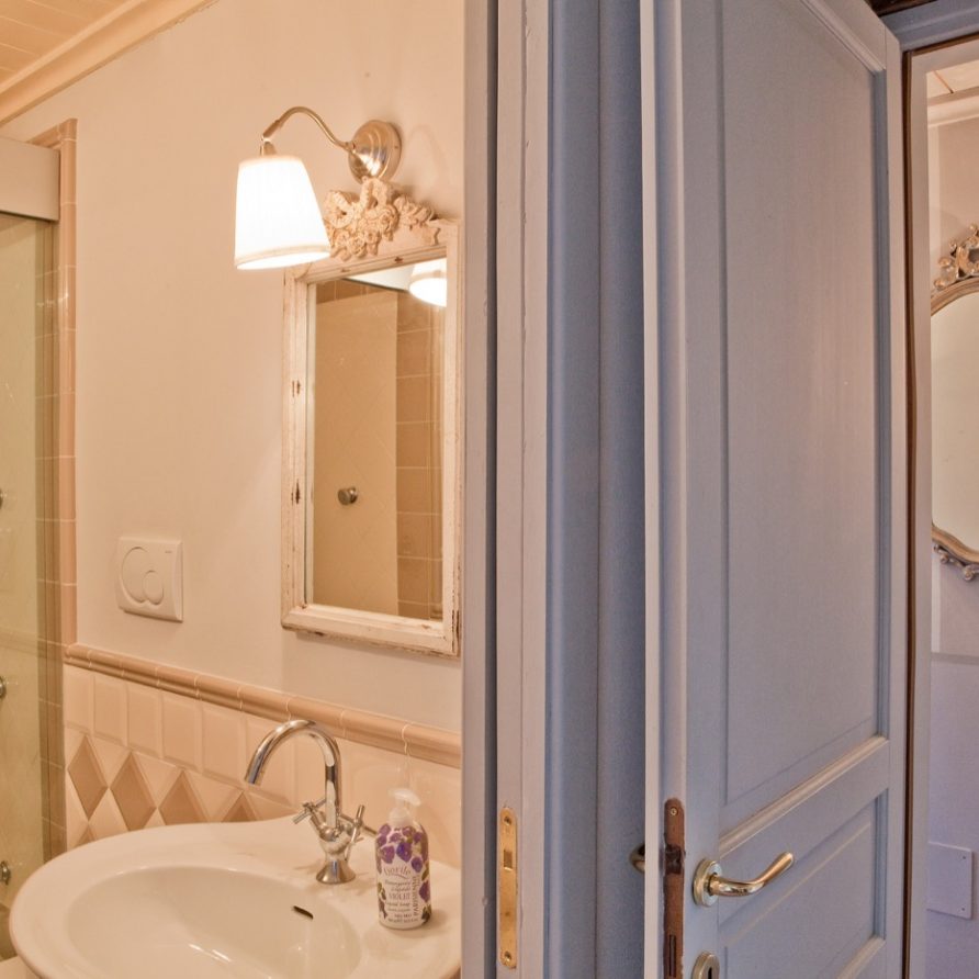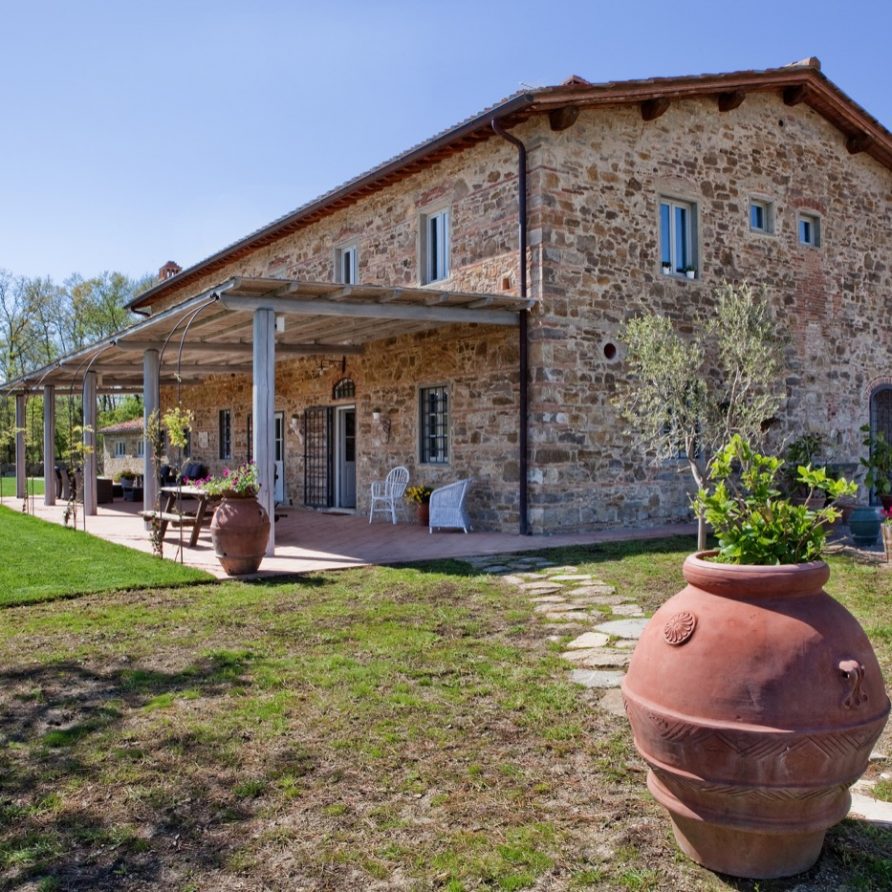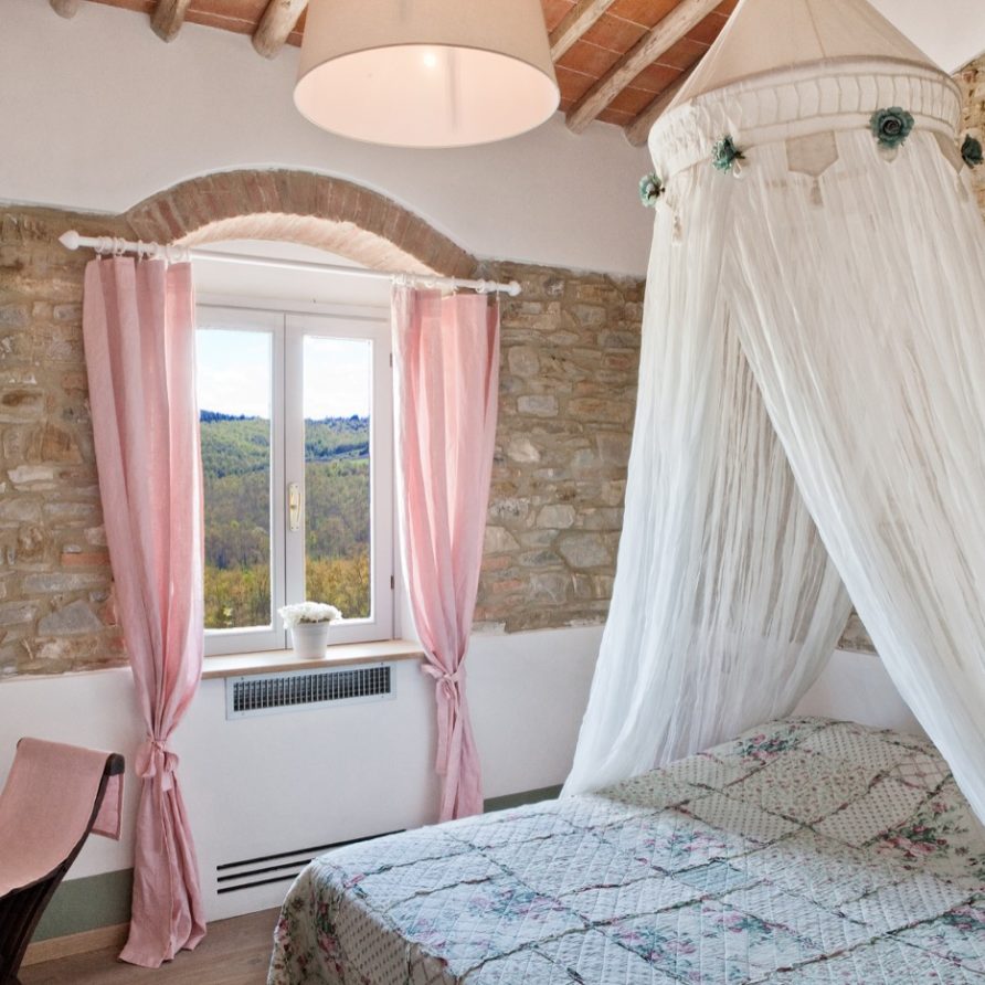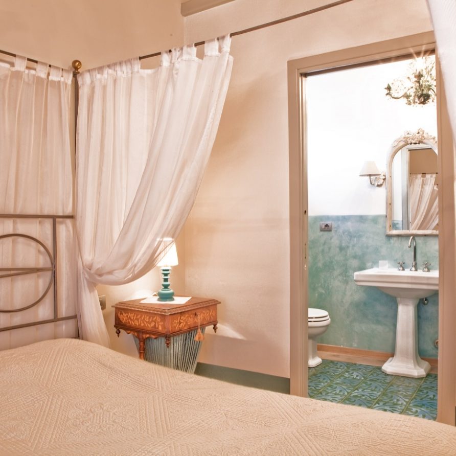 The villa is in the typical materials of the area….stone, wooden beams, arched ceilings.The interior is in pale pastel colours, with areas for relaxing, fireplaces…..very authentic Tuscan cordiality and family feeling. The main villa (460 sq m) has a principle entrance –grounf floor- which leads to a spacious and well-equipped kitchen. This is ideal for cooking lessons and leads to the dining room. The rest of the ground floor is composed of an enormous lounge area which includes a grand piano There is also a small bathroom. On the first floor there are six bedroom….four doubles, a twin bedroom and a single bedroom.Each bedroom has its own bathroom and one has a bathtub. On this floor there is also a second kitchen and lounge area with a lovely view over the surrounding countryside.