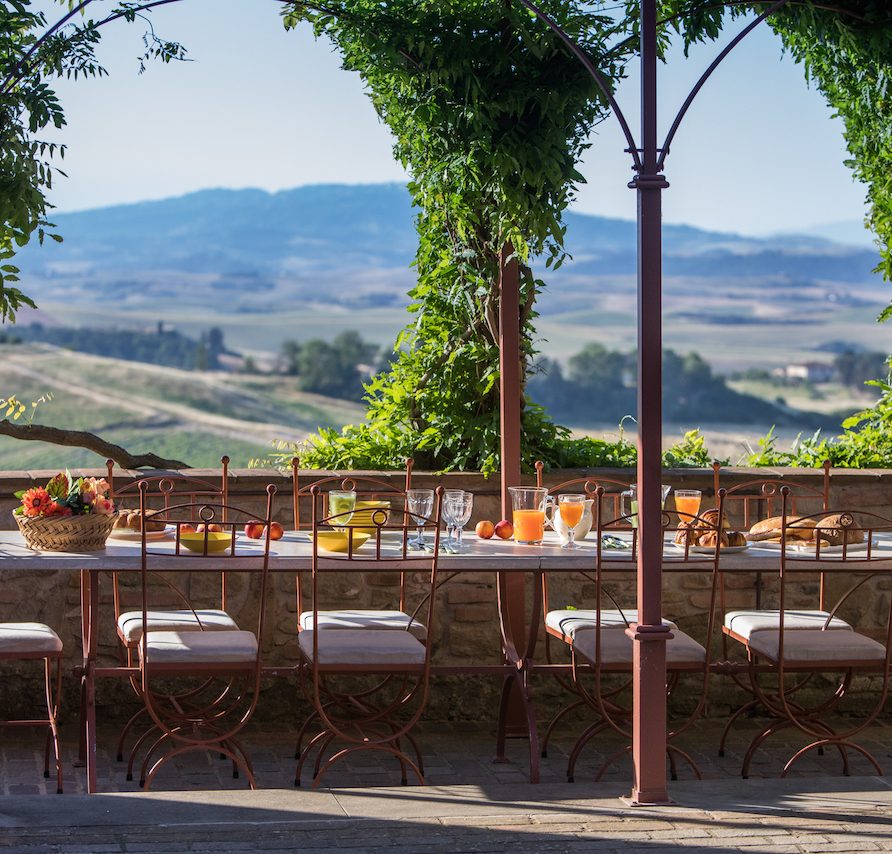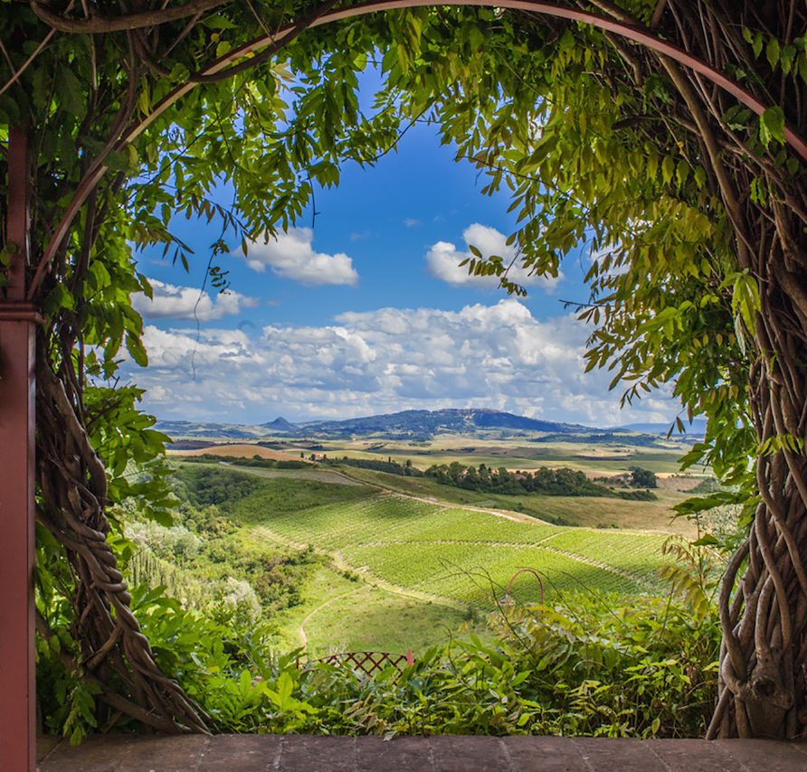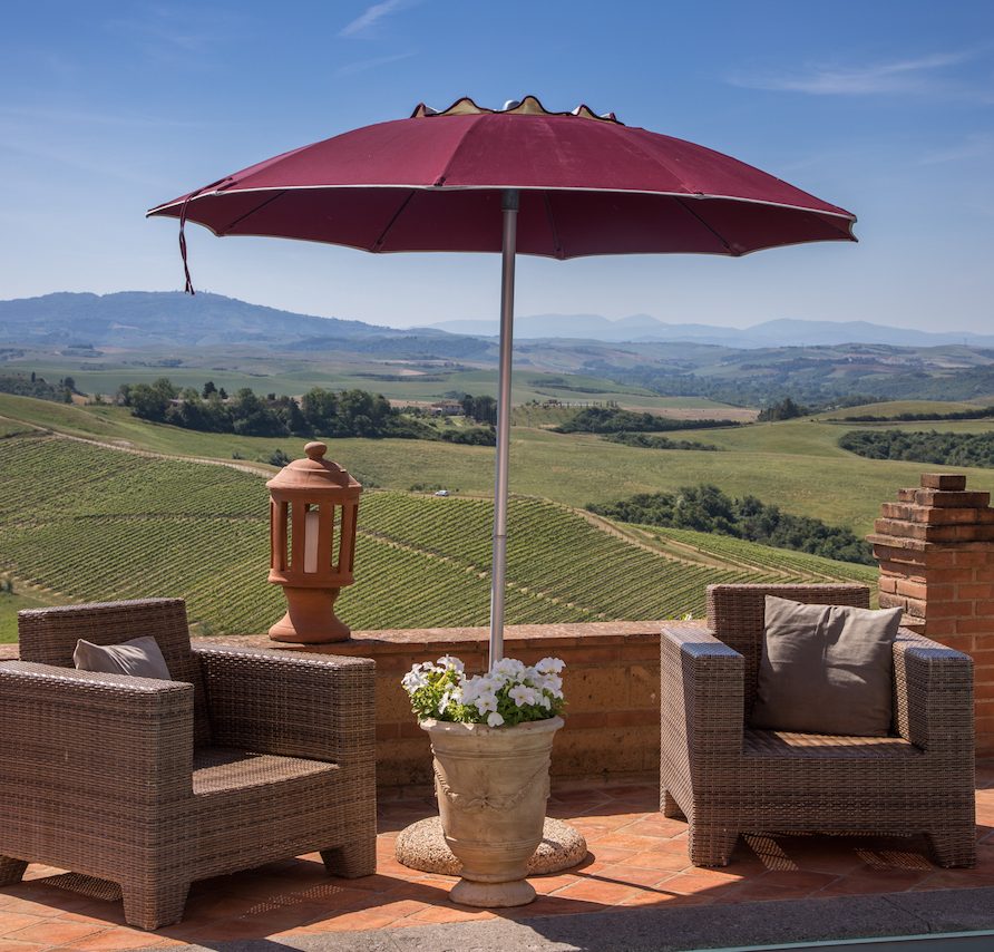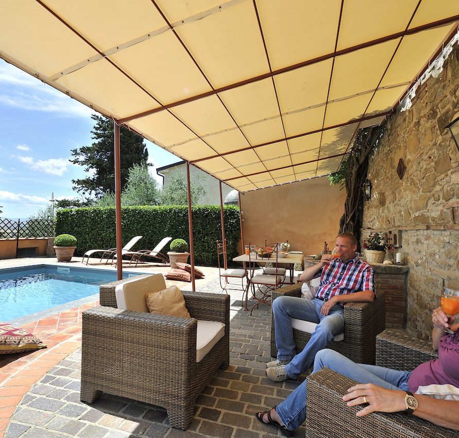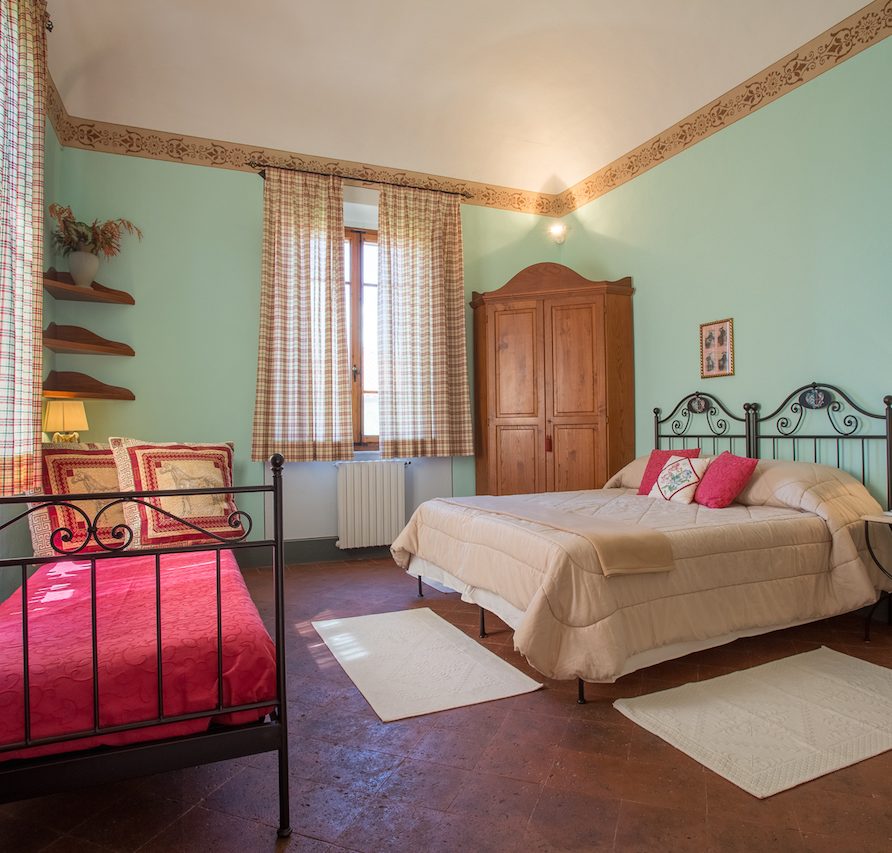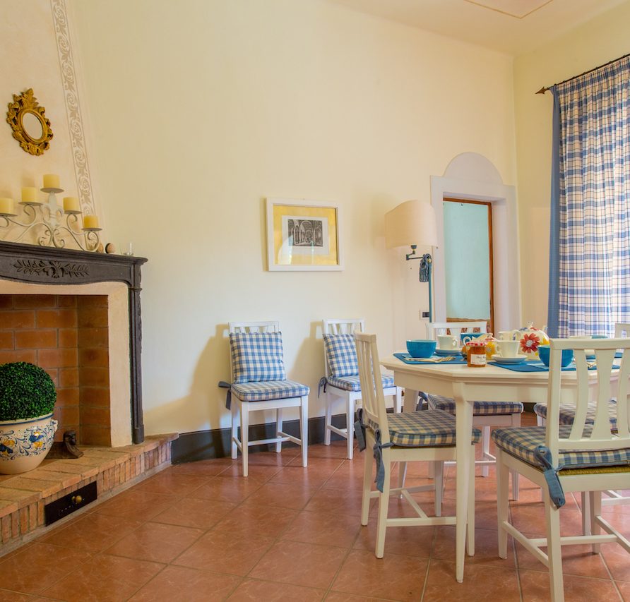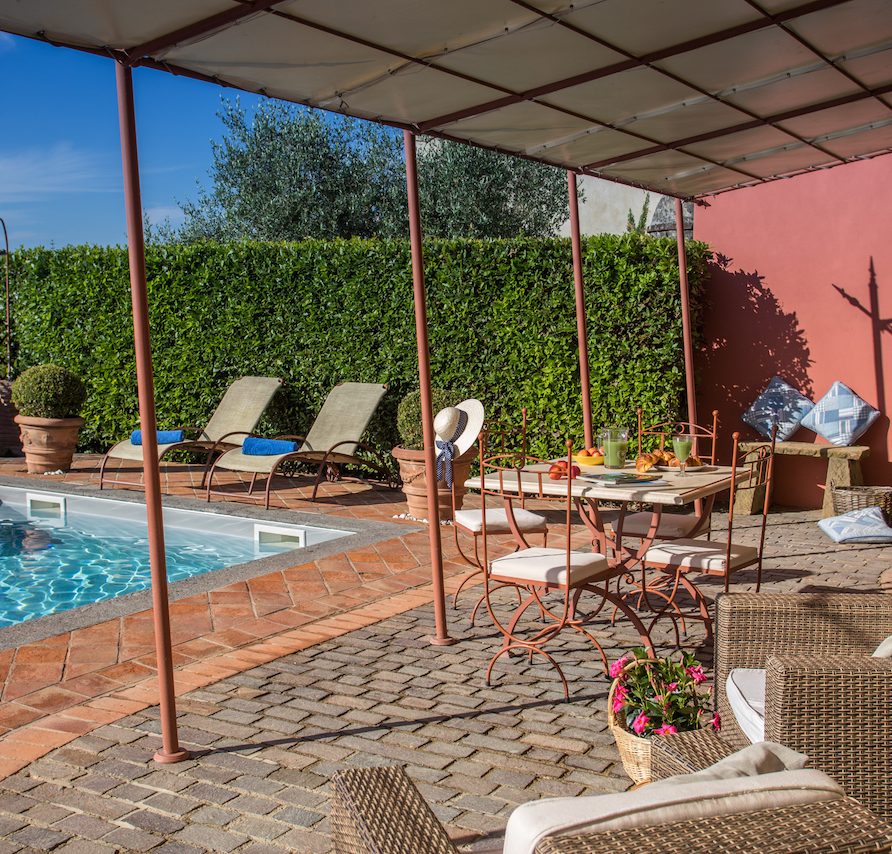 Coming back down to the ground floor, next to the kitchen and living room, we pass through two arched doorways and enter the garden, which has a stone floor and was originally the cloister.A large lodge has a dining table and chairs for “al fresco” dining, and divans under a pergola with a hundred year old wisteria. From here you can admire the vineyards and olive groves as far as the city of Volterra.