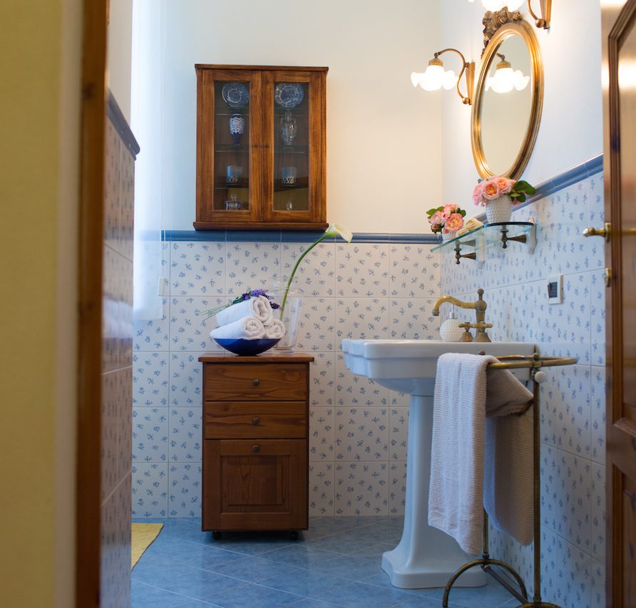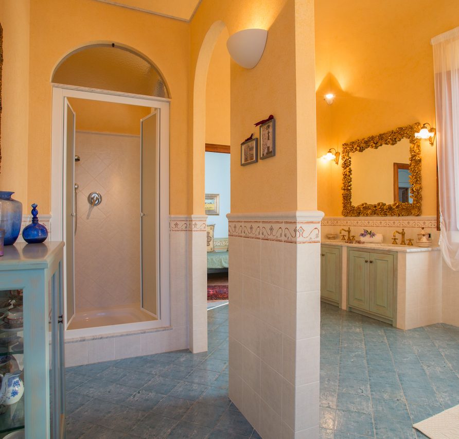The villa s 350 square metres are disposed on two floors. On the ground floor is an extremely well-equipped kitchen with a small larder, a dining room with an elegant wood fireplace in lava stone, divans and armchairs and Sat. TV. There is also another large salon with frescoed ceilings, divans and armchairs, a dining room with a large, crystal dining table and original bookcases, a double bedroom with ensuite bathroom.