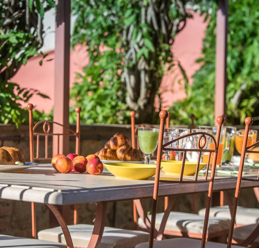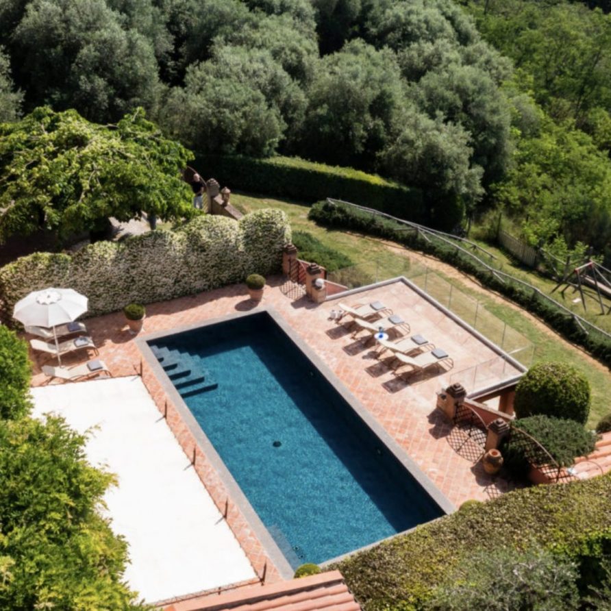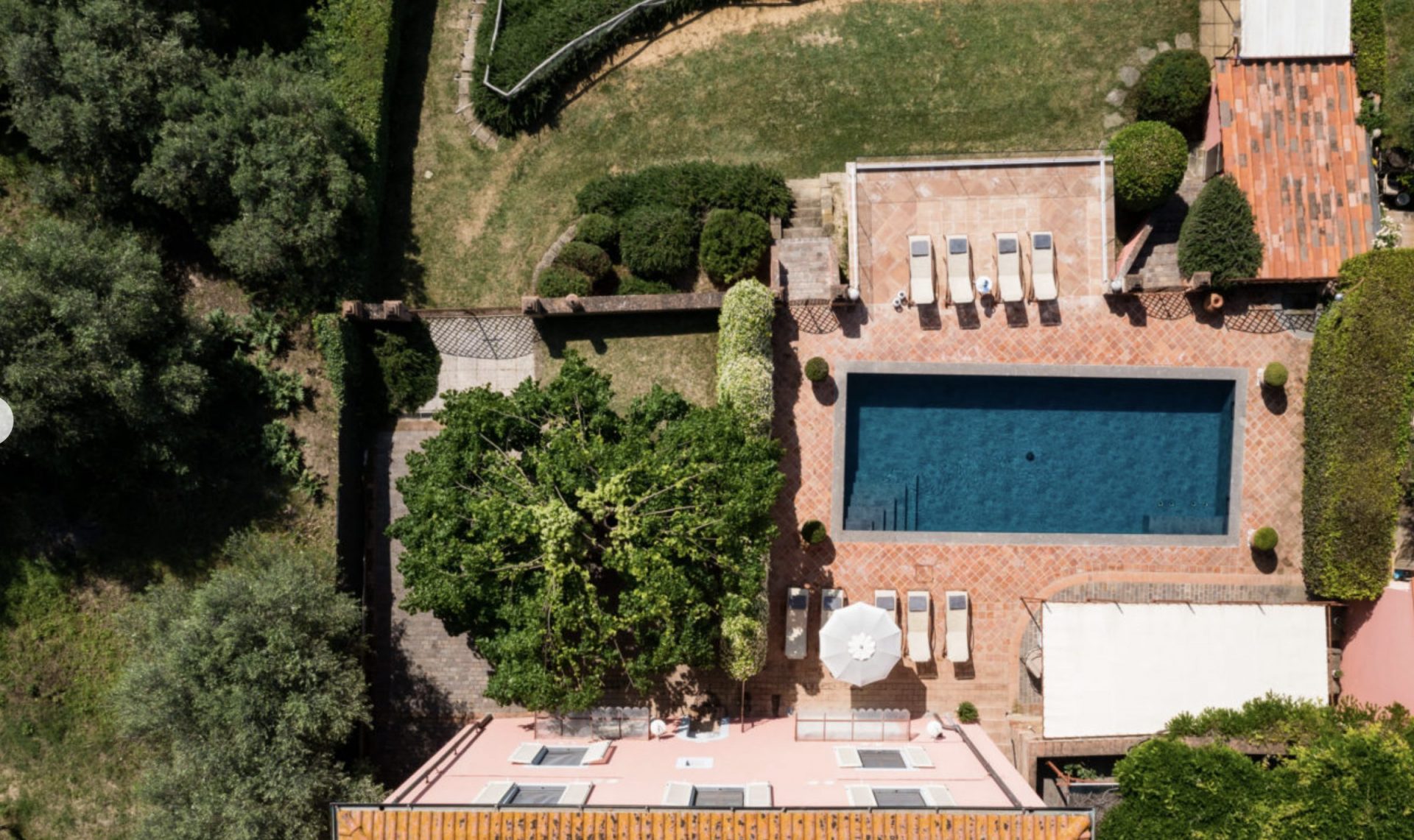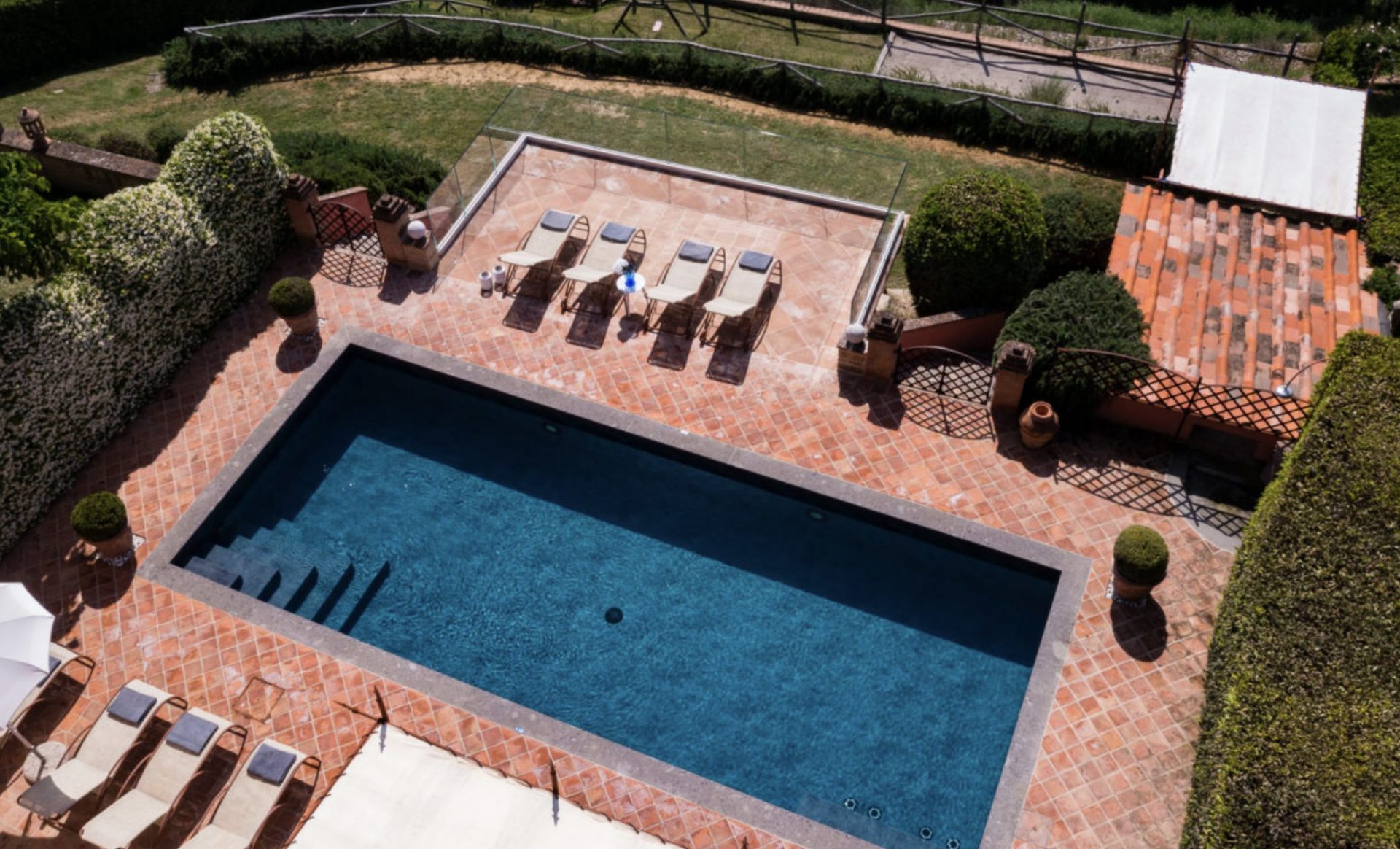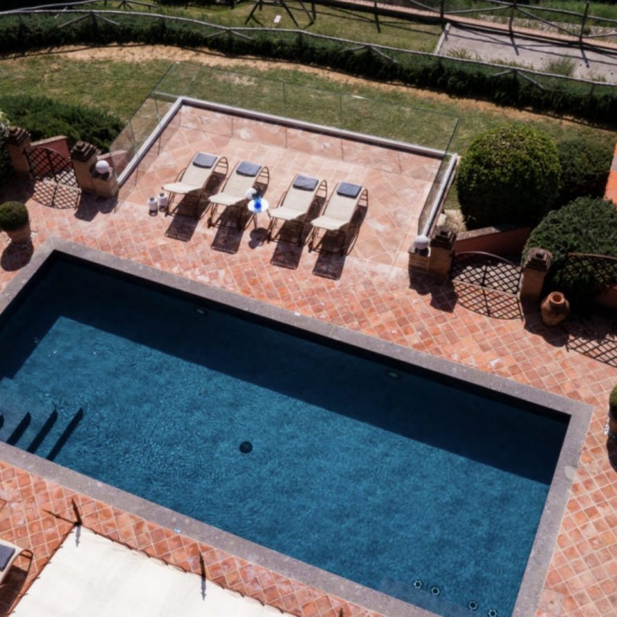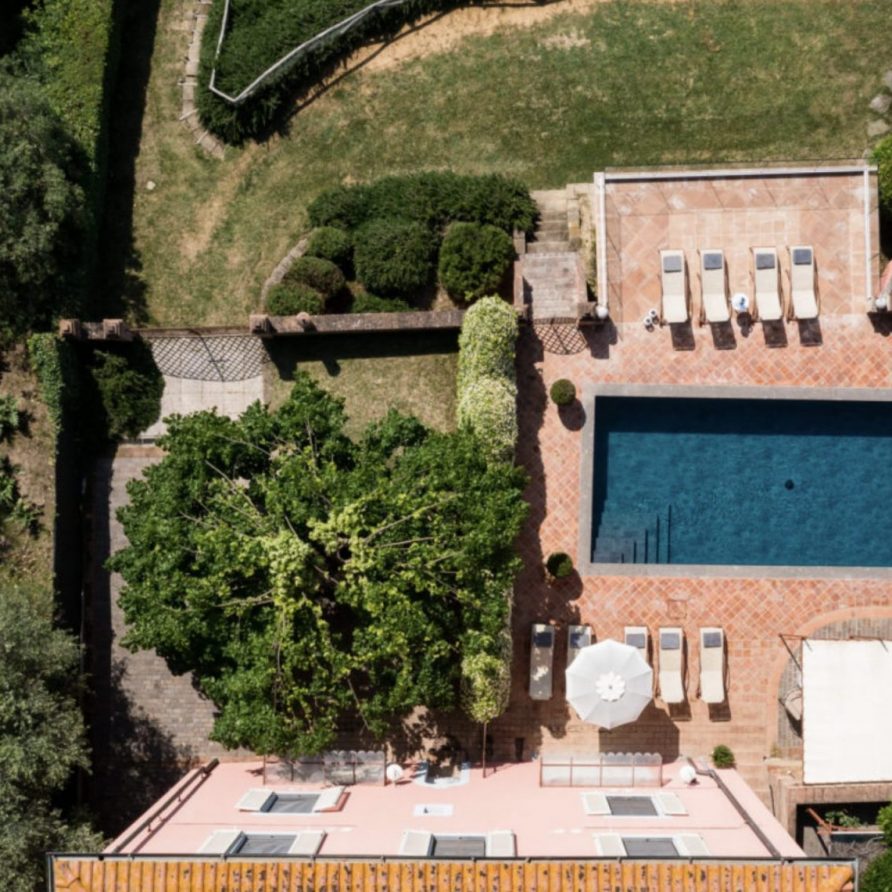 By means of another stone staircase we go down to the garden, protected by an ancient wall for privacy, to the panoramic swimming pool (12×4 metres by 1.40 deep).It has a hydromassage area, divans and umbrellas.