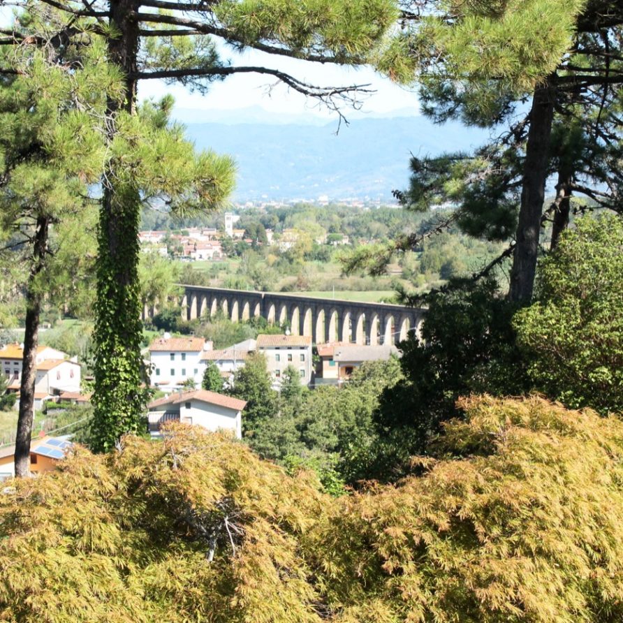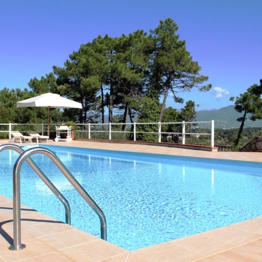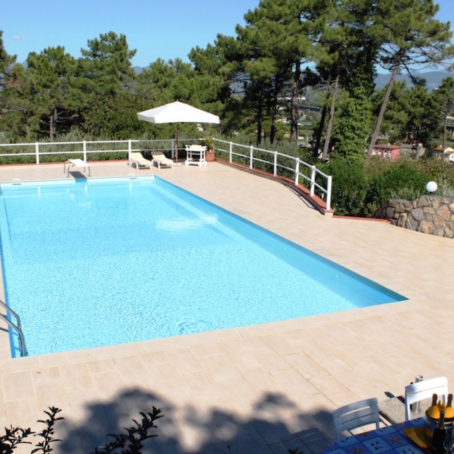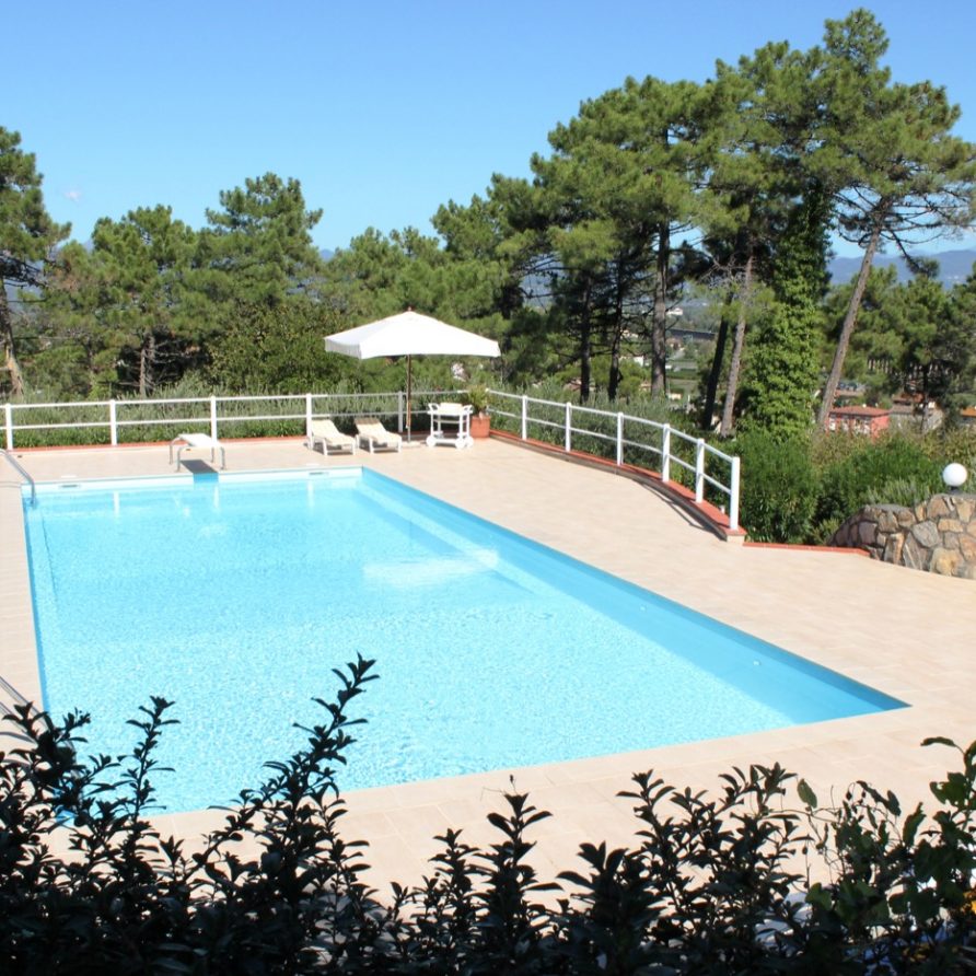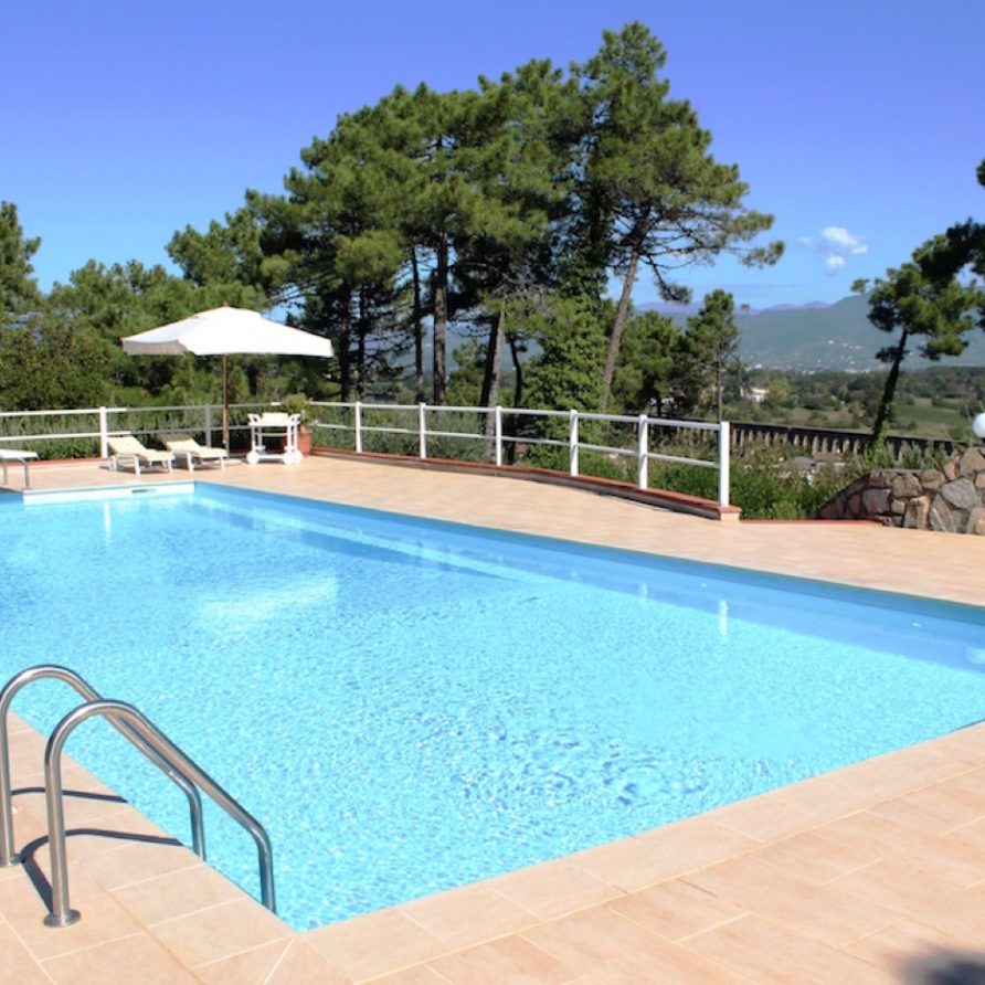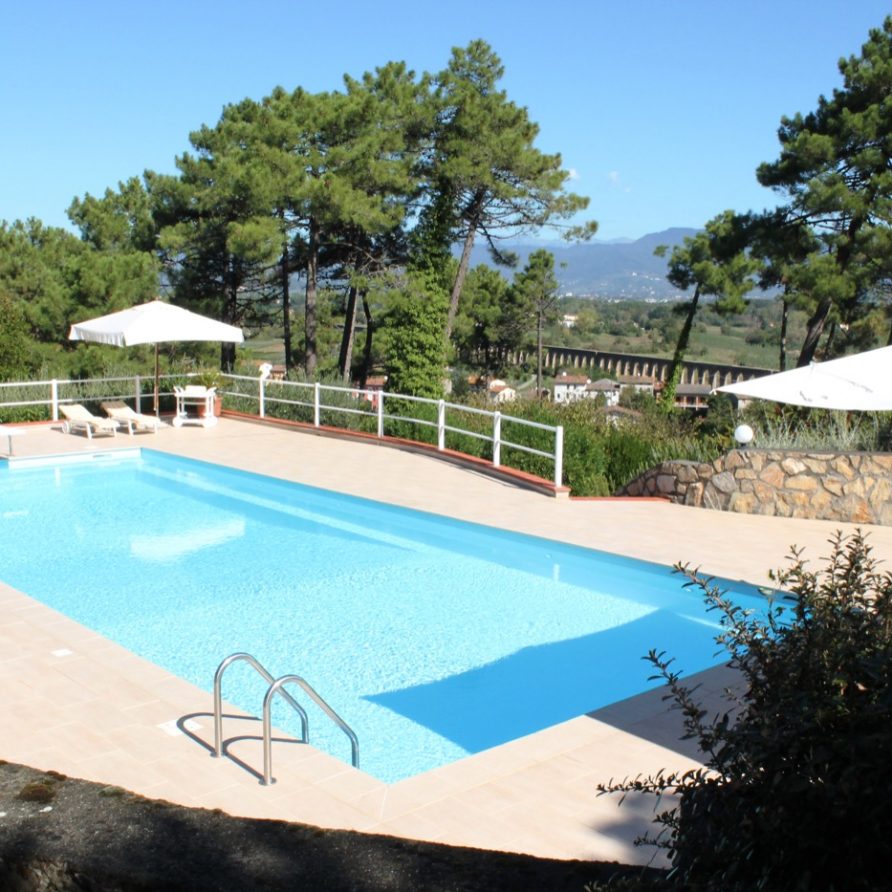 Downstairs, passing through the internal stairs, sometimes used with the owners, through a lobby and a small entrance, bedroom with double beds and a bath with shower. In addition to all the outdoor environments of the villa (access driveway park, woods, entrance terrace, etc.) there is a large swimming pool with spectacular views over Lucca and the arches of the historic aqueduct of Nottolini, equipped with umbrellas, deckchairs, armchairs, dining table etc. and has a dressing room with bath and shower.