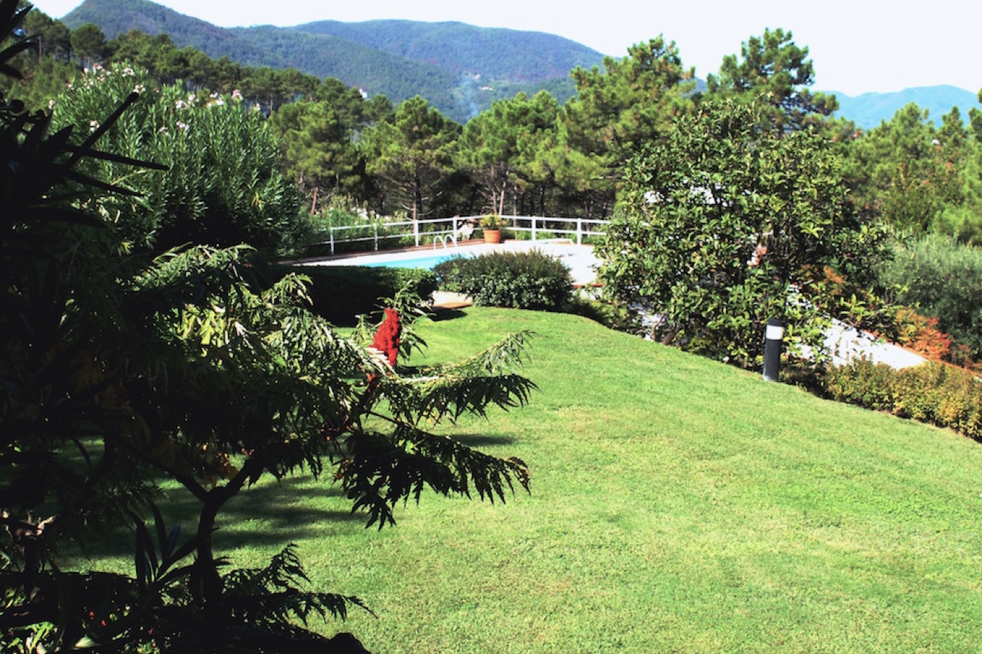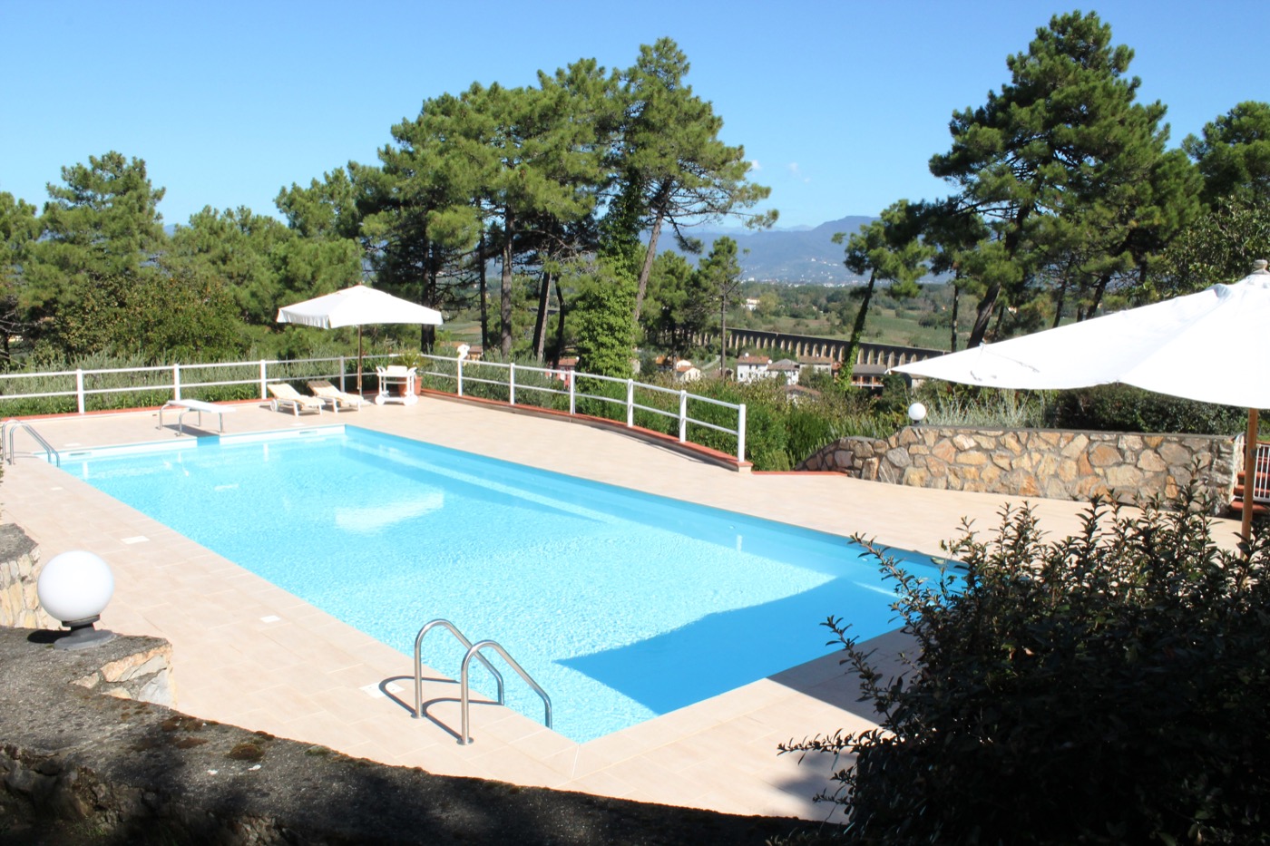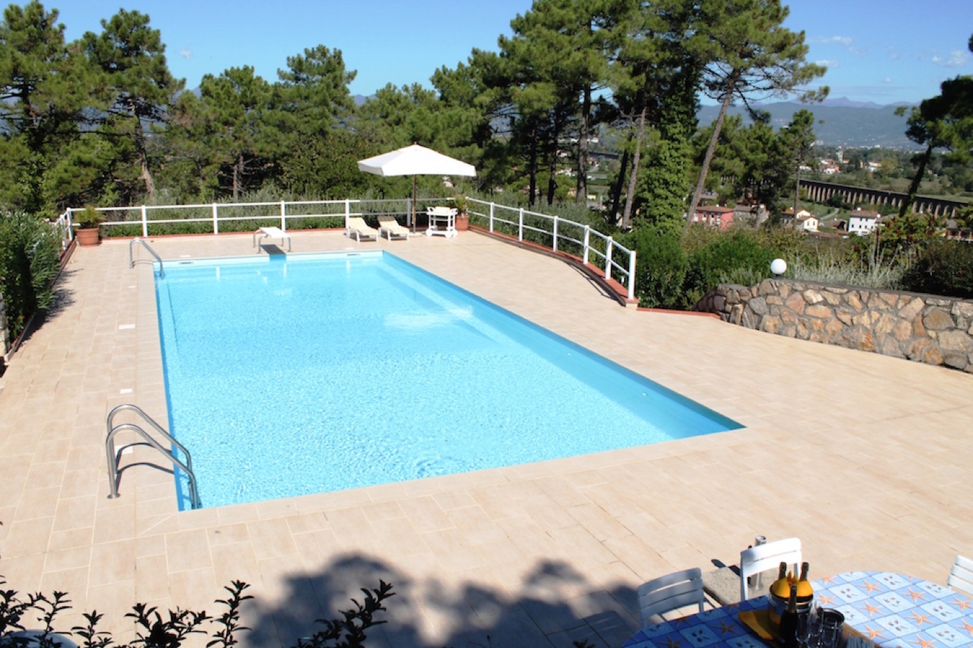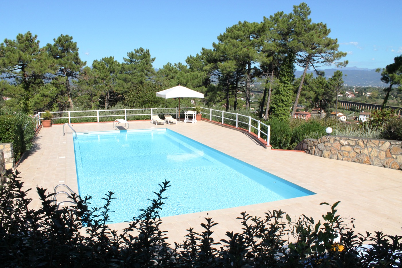 Downstairs, passing through the internal stairs, sometimes used with the owners, through a lobby and a small entrance, bedroom with double beds and a bath with shower. In addition to all the outdoor environments of the villa (access driveway park, woods, entrance terrace, etc.) there is a large swimming pool with spectacular views over Lucca and the arches of the historic aqueduct of Nottolini, equipped with umbrellas, deckchairs, armchairs, dining table etc. and has a dressing room with bath and shower.