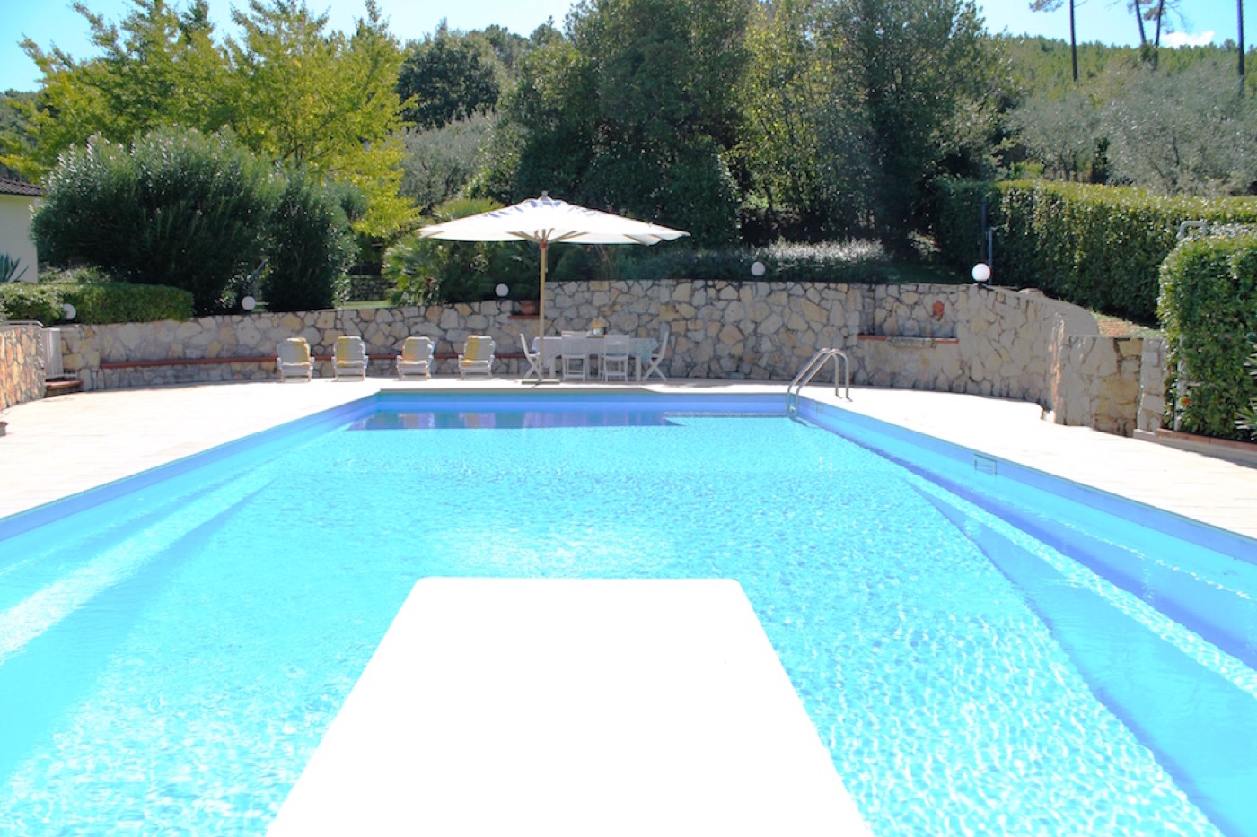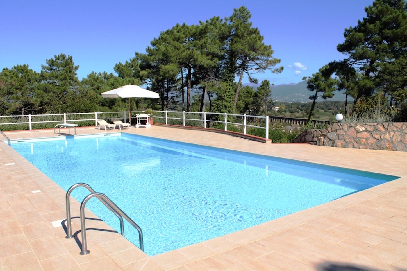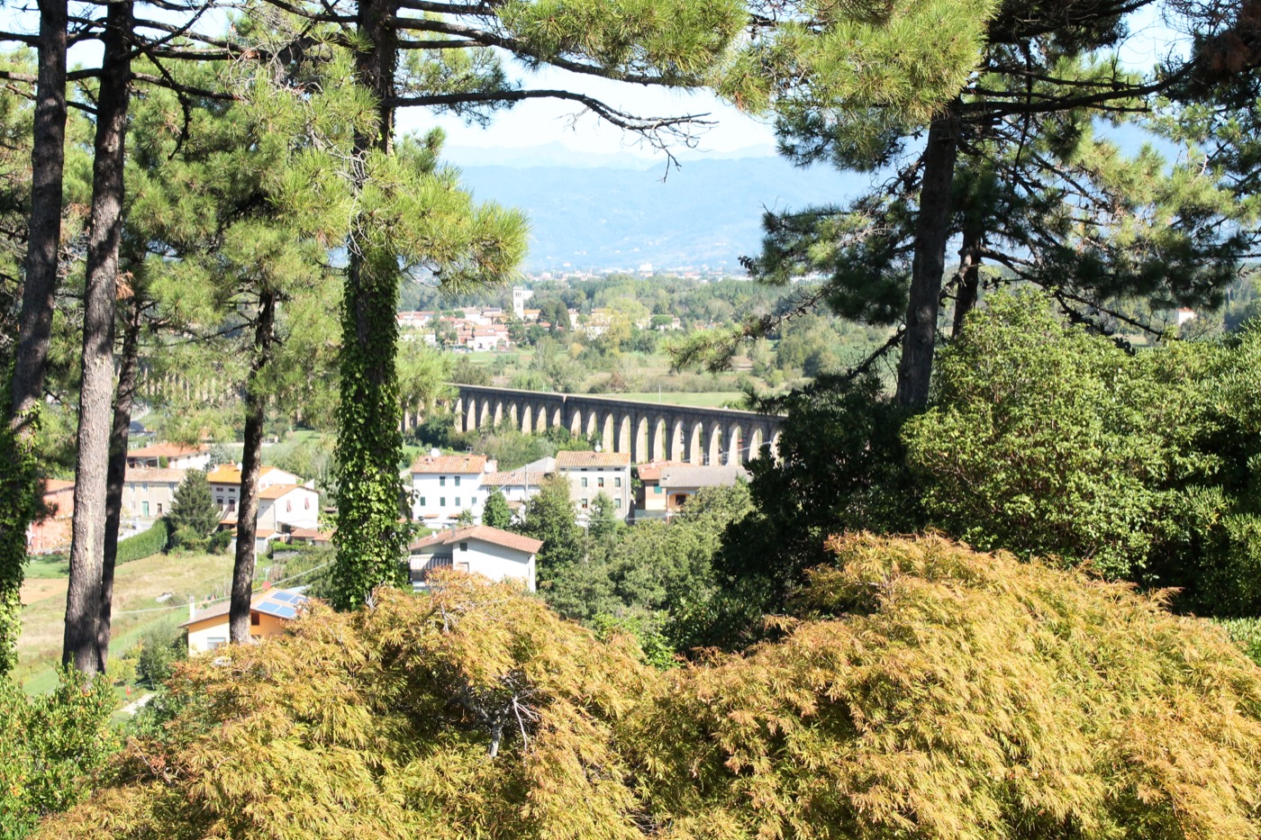 Downstairs, passing through the internal stairs, sometimes used with the owners, through a lobby and a small entrance, bedroom with double beds and a bath with shower. In addition to all the outdoor environments of the villa (access driveway park, woods, entrance terrace, etc.) there is a large swimming pool with spectacular views over Lucca and the arches of the historic aqueduct of Nottolini, equipped with umbrellas, deckchairs, armchairs, dining table etc. and has a dressing room with bath and shower.