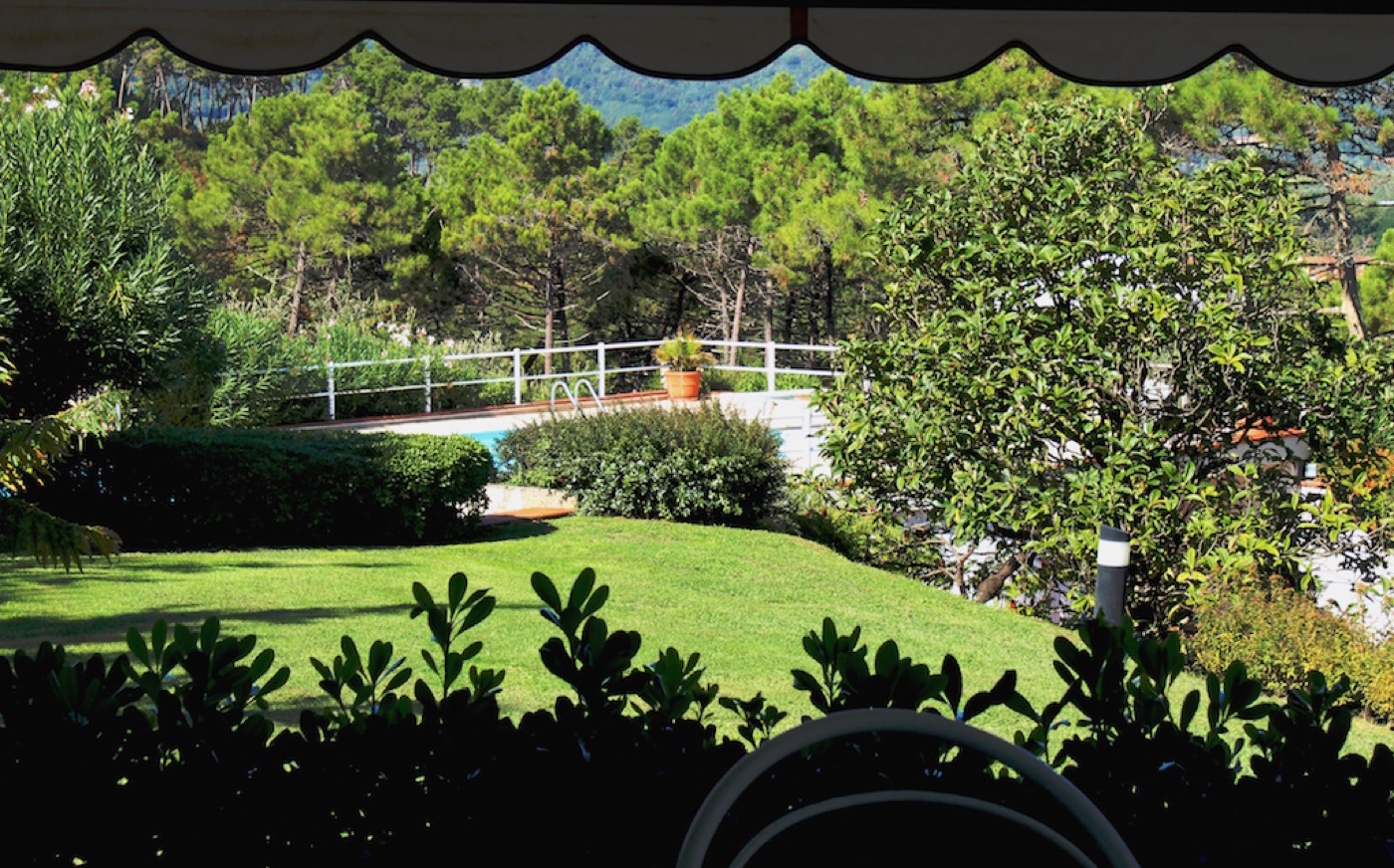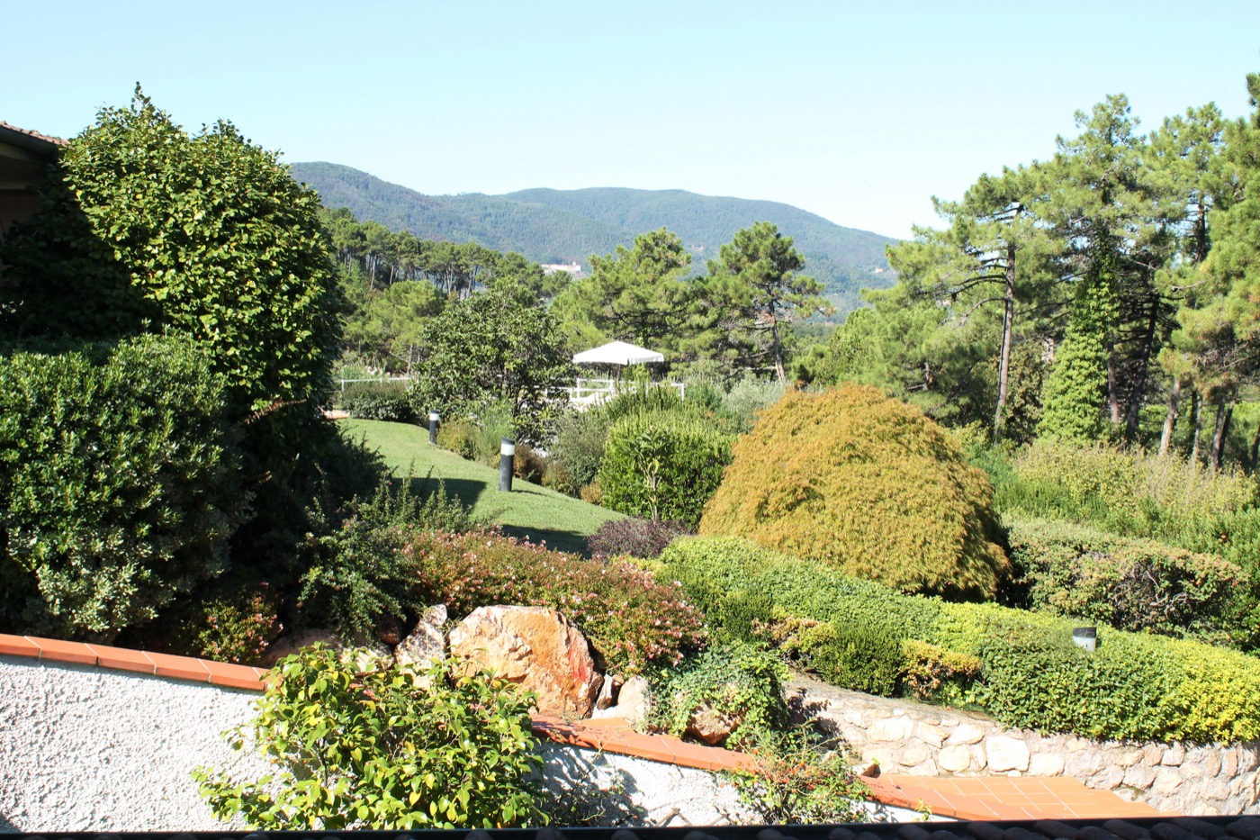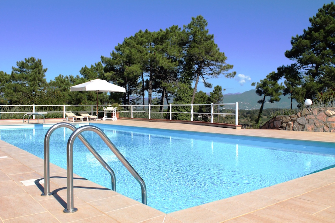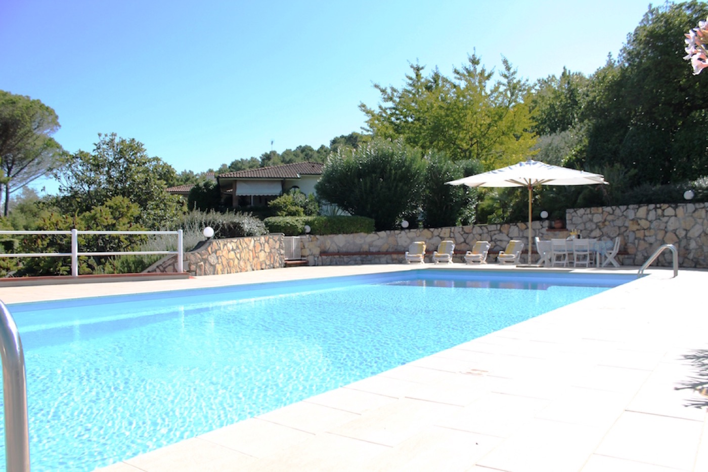 Downstairs, passing through the internal stairs, sometimes used with the owners, through a lobby and a small entrance, bedroom with double beds and a bath with shower. In addition to all the outdoor environments of the villa (access driveway park, woods, entrance terrace, etc.) there is a large swimming pool with spectacular views over Lucca and the arches of the historic aqueduct of Nottolini, equipped with umbrellas, deckchairs, armchairs, dining table etc. and has a dressing room with bath and shower.