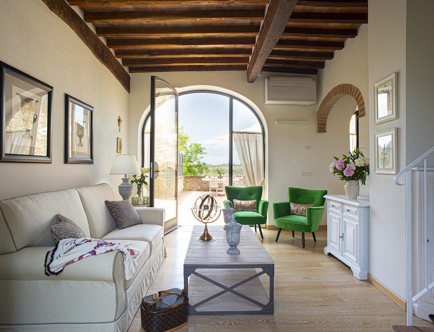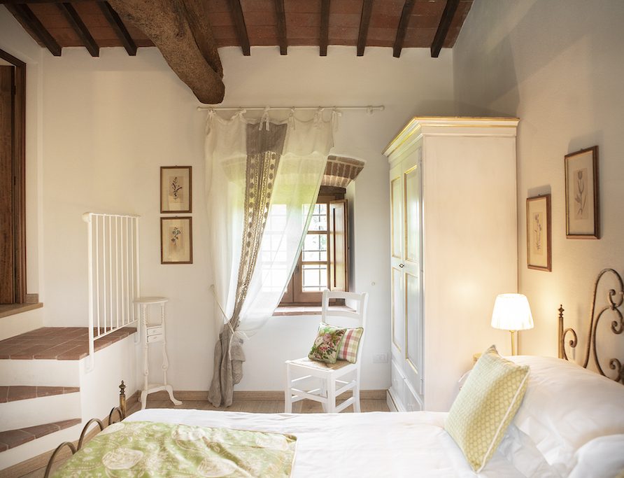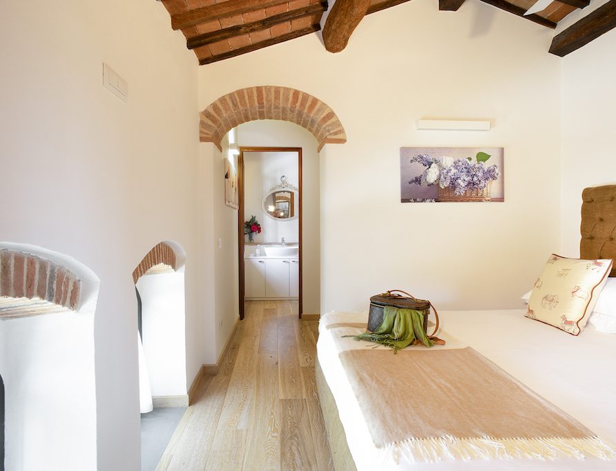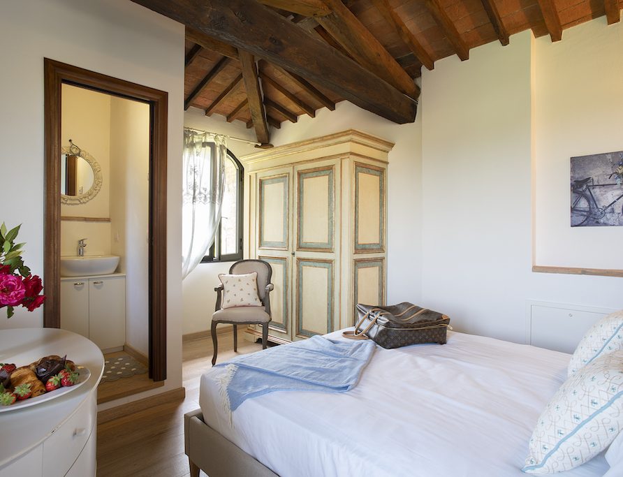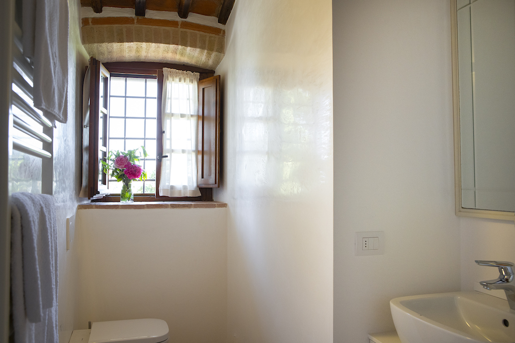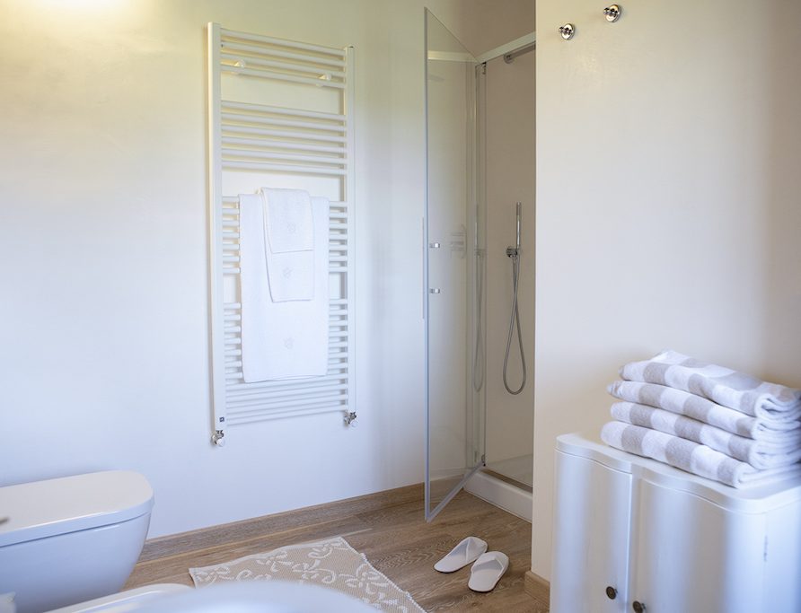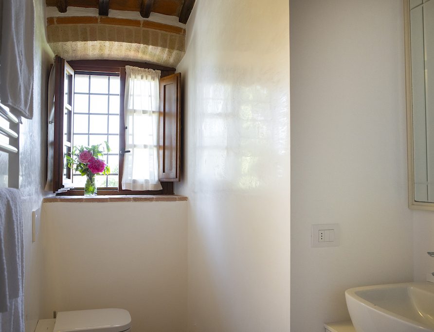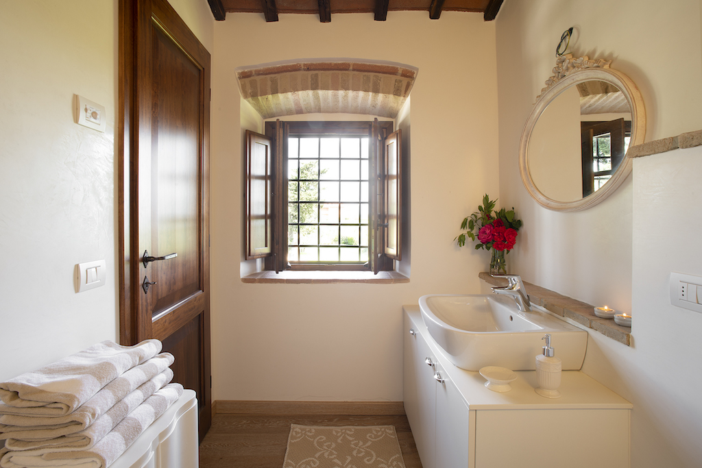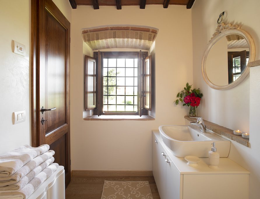 On the Villa first floor are located the three bedrooms Rosa, Girasole and Peonia. Two have double beds and one have two single beds. All the bedrooms have ensuite bathroom with shower. The sixth double bedroom, Gelsomino with bathroom with shower, is located on the Villa’s higher level, on the tower, with a stunning view over the Tuscan countryside, covered with vineyards and olive trees.The Villa is furnished also with lovely living areas with understated elegance which create a welcoming atmosphere. The Villa is completely Air Conditioned.