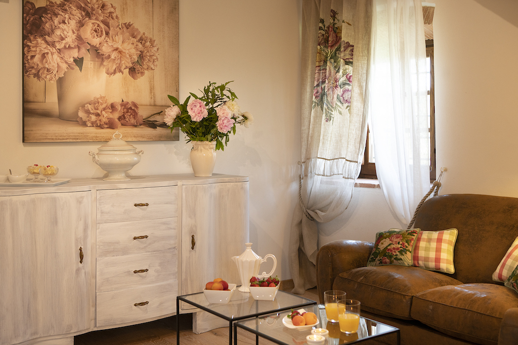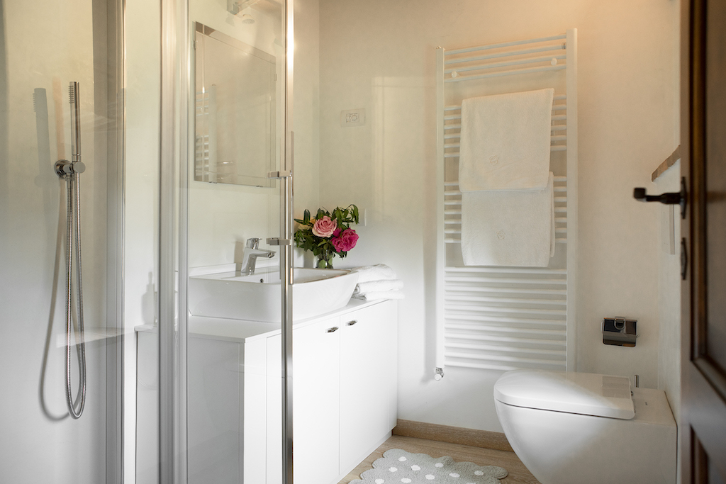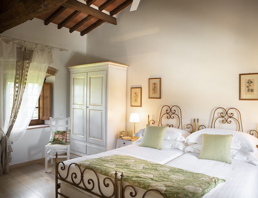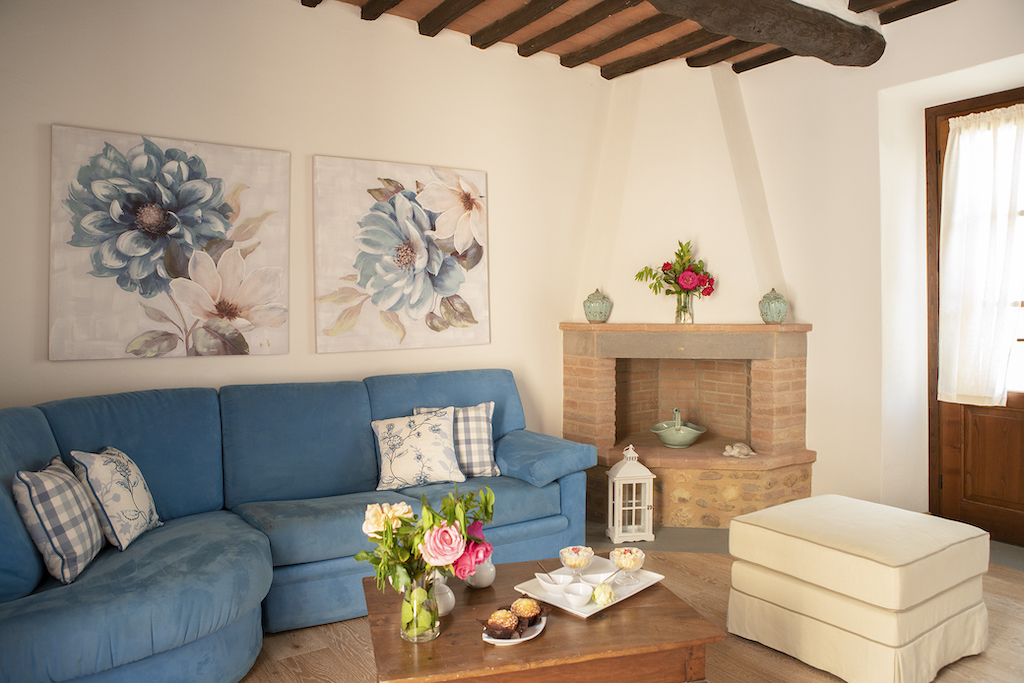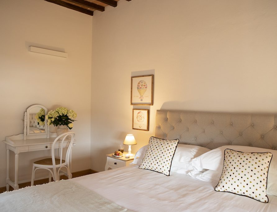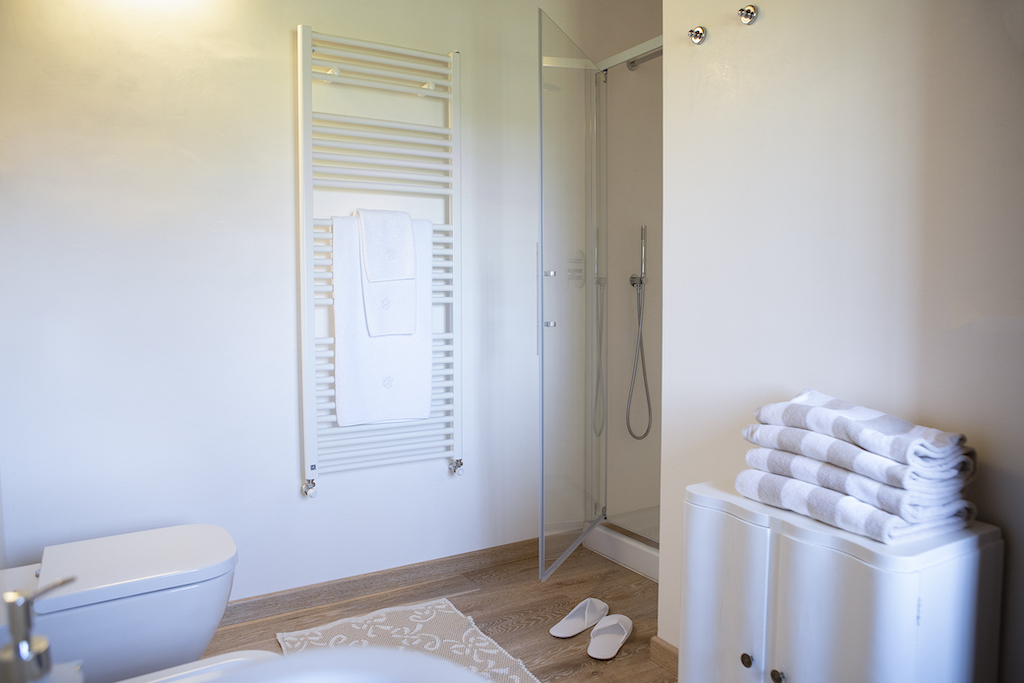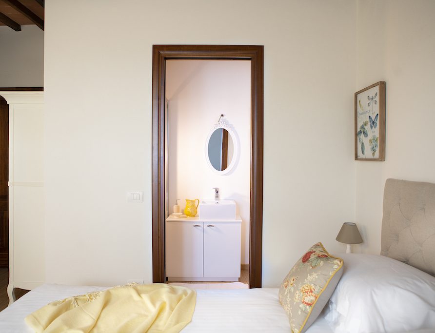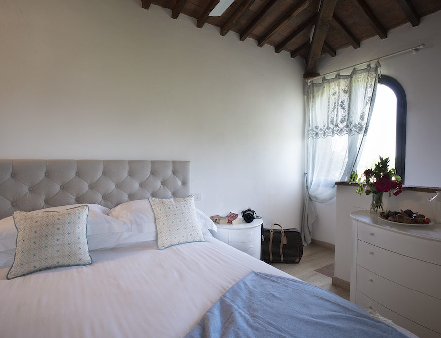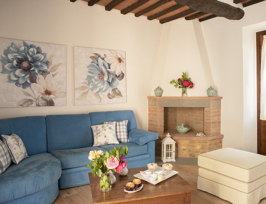 On the Villa first floor are located the three bedrooms Rosa, Girasole and Peonia. Two have double beds and one have two single beds. All the bedrooms have ensuite bathroom with shower. The sixth double bedroom, Gelsomino with bathroom with shower, is located on the Villa’s higher level, on the tower, with a stunning view over the Tuscan countryside, covered with vineyards and olive trees.The Villa is furnished also with lovely living areas with understated elegance which create a welcoming atmosphere. The Villa is completely Air Conditioned.
