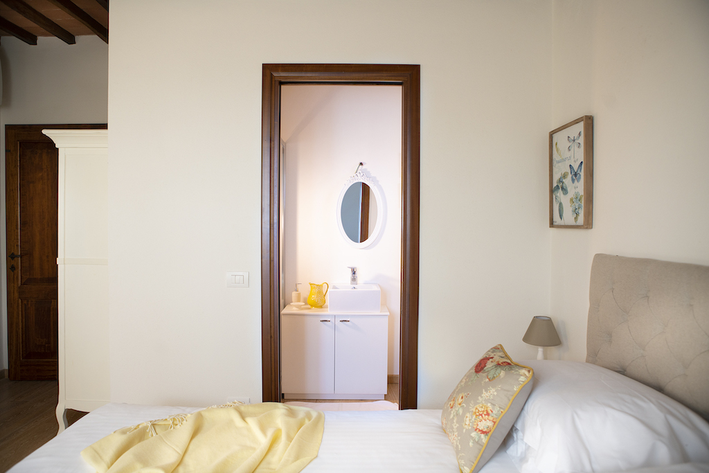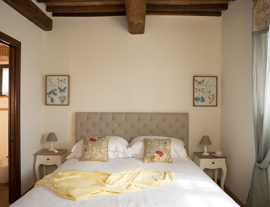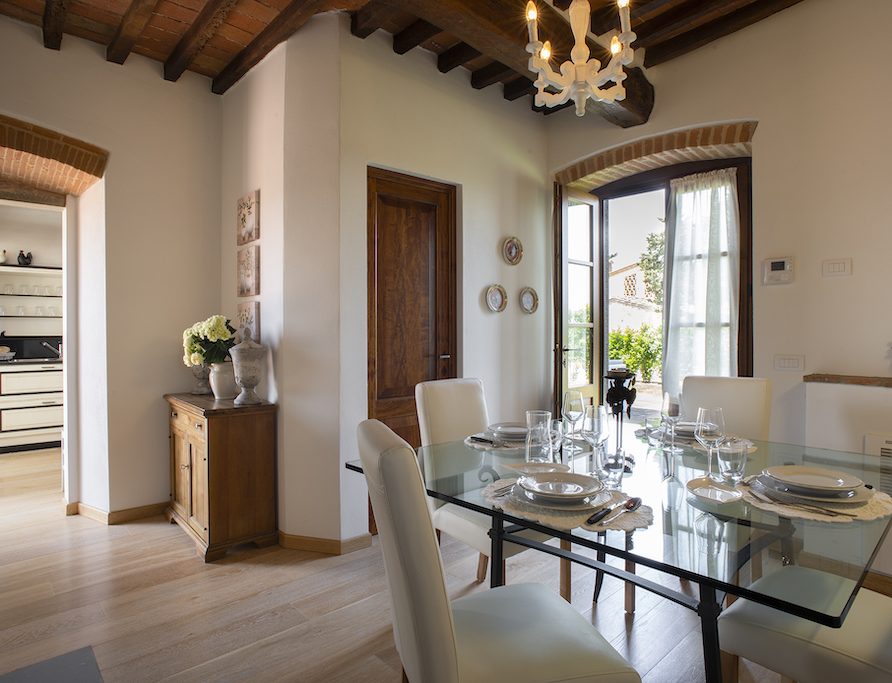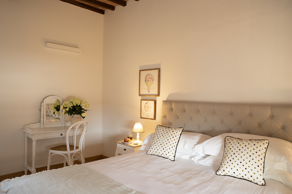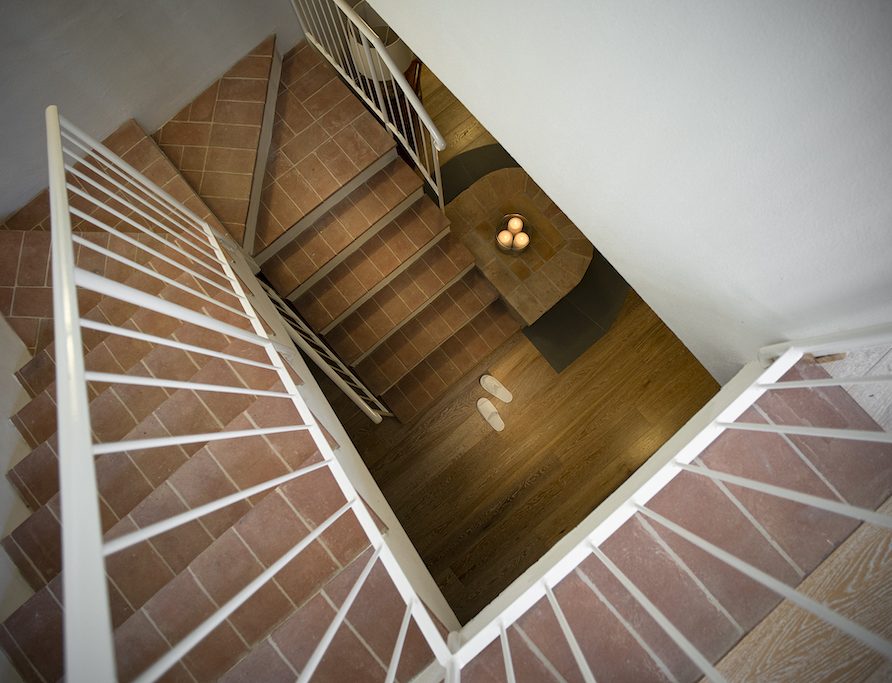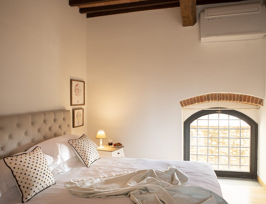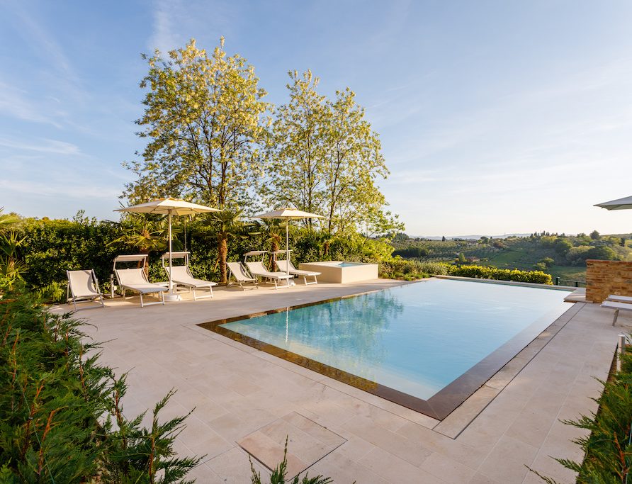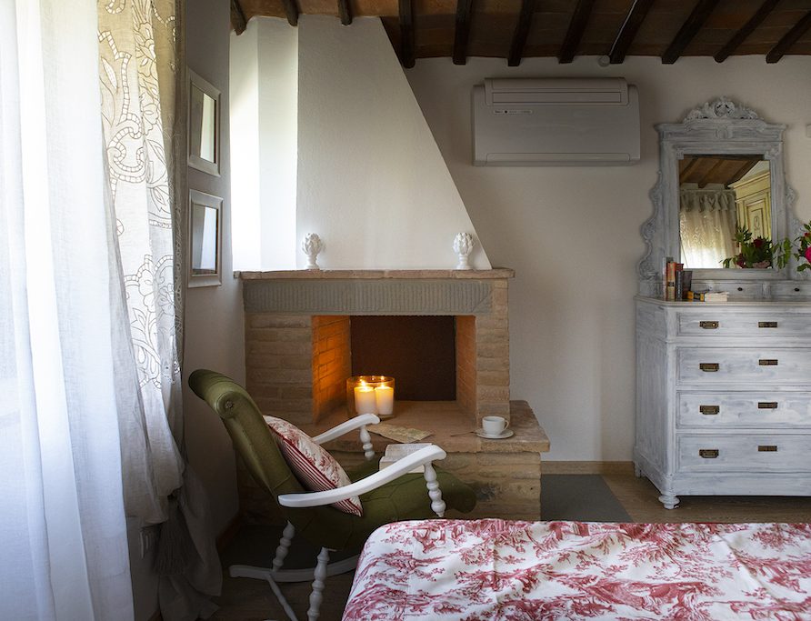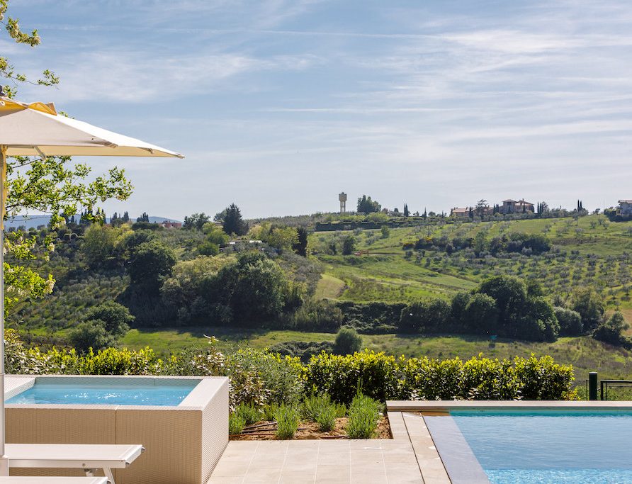 On the Villa first floor are located the three bedrooms Rosa, Girasole and Peonia. Two have double beds and one have two single beds. All the bedrooms have ensuite bathroom with shower. The sixth double bedroom, Gelsomino with bathroom with shower, is located on the Villa’s higher level, on the tower, with a stunning view over the Tuscan countryside, covered with vineyards and olive trees.The Villa is furnished also with lovely living areas with understated elegance which create a welcoming atmosphere. The Villa is completely Air Conditioned.