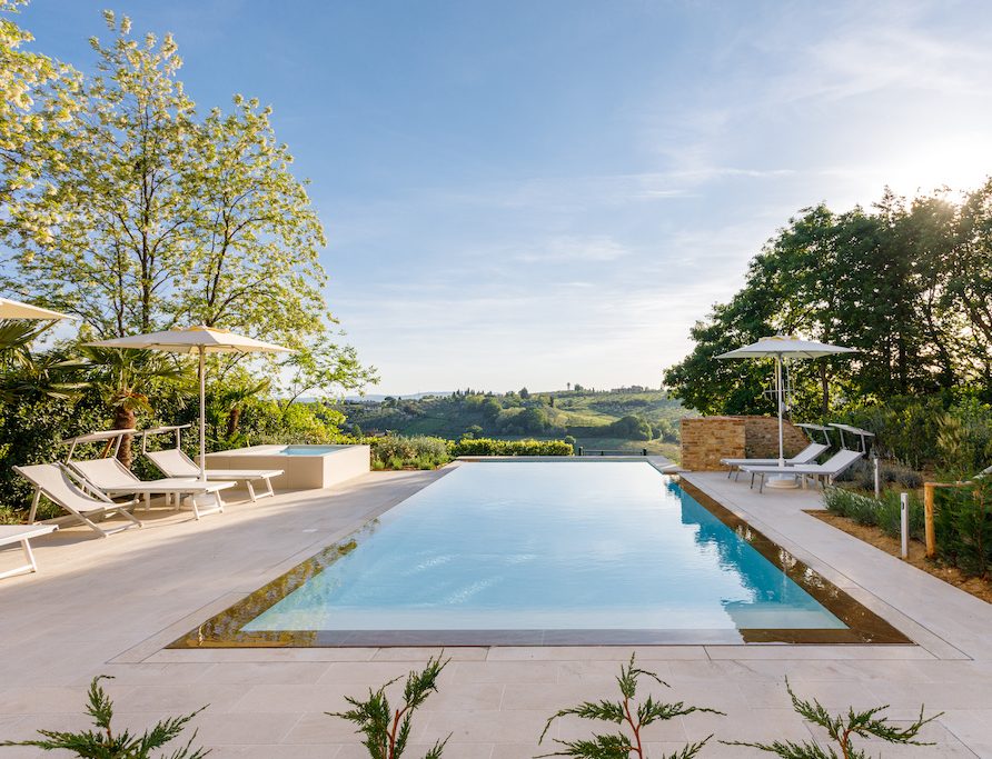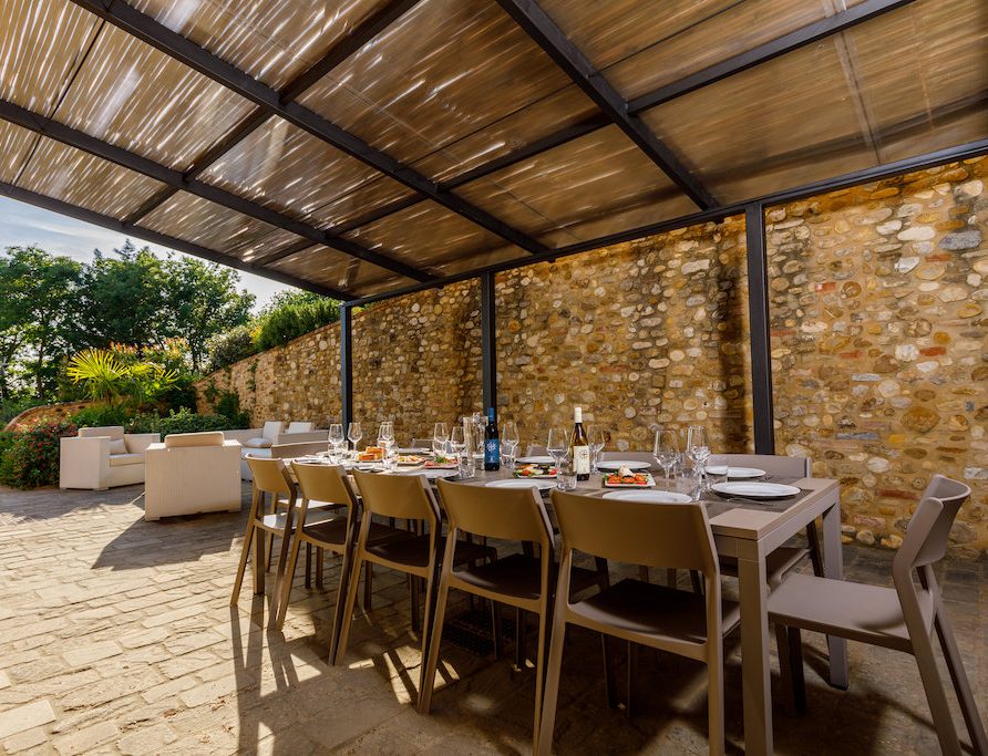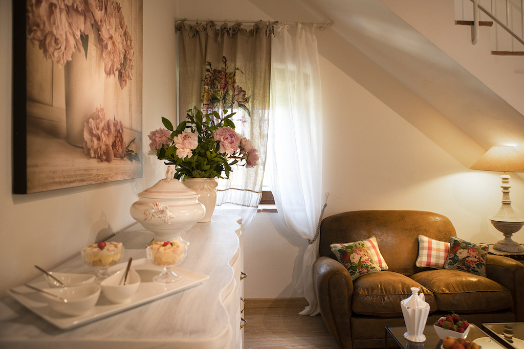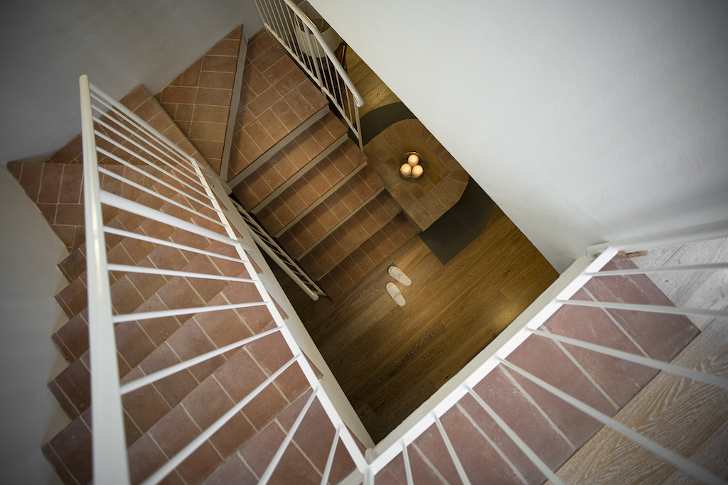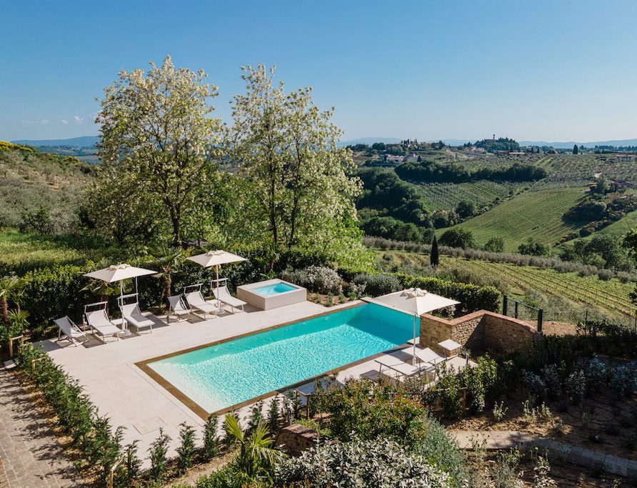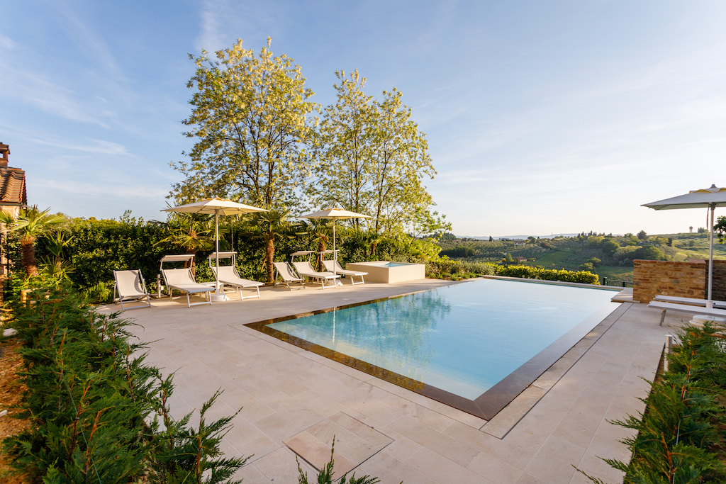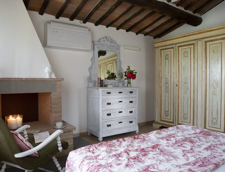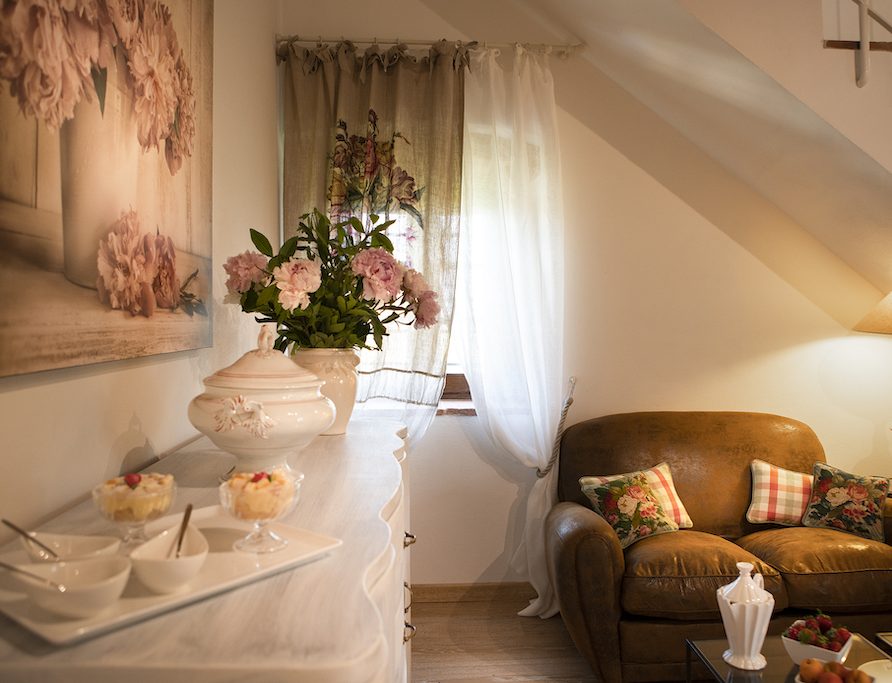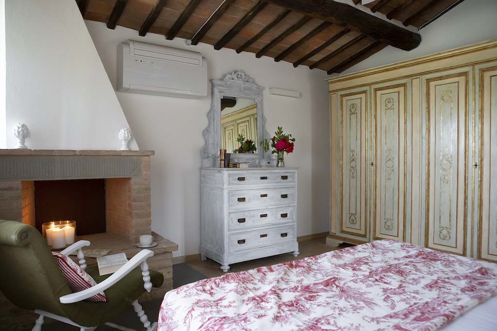 On the Villa first floor are located the three bedrooms Rosa, Girasole and Peonia. Two have double beds and one have two single beds. All the bedrooms have ensuite bathroom with shower. The sixth double bedroom, Gelsomino with bathroom with shower, is located on the Villa’s higher level, on the tower, with a stunning view over the Tuscan countryside, covered with vineyards and olive trees.The Villa is furnished also with lovely living areas with understated elegance which create a welcoming atmosphere. The Villa is completely Air Conditioned.