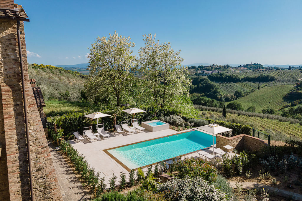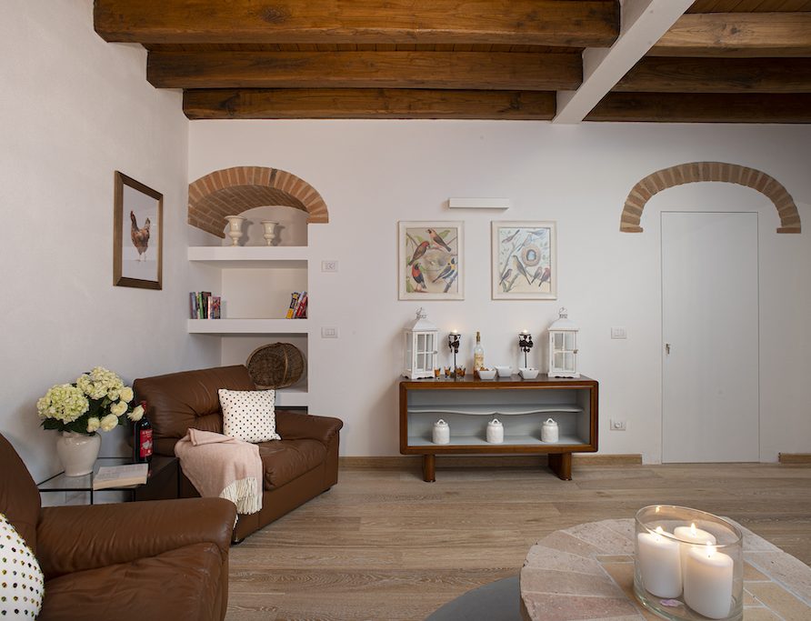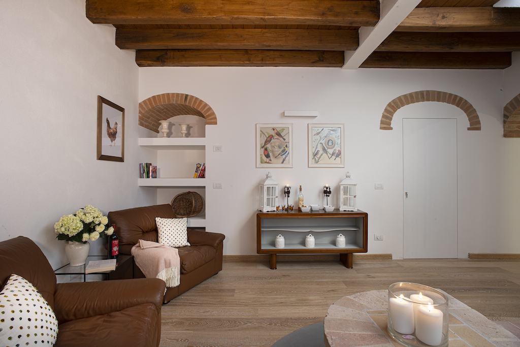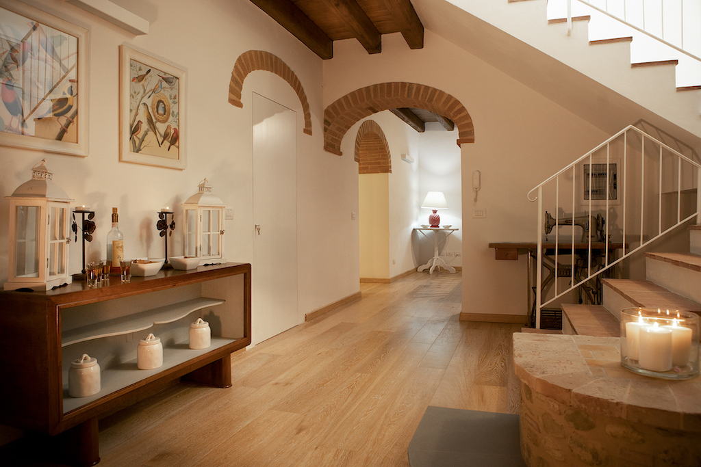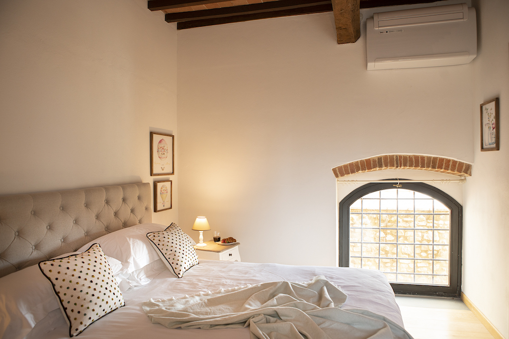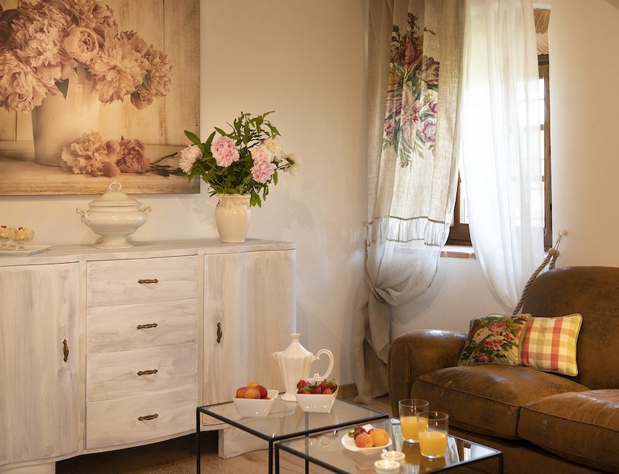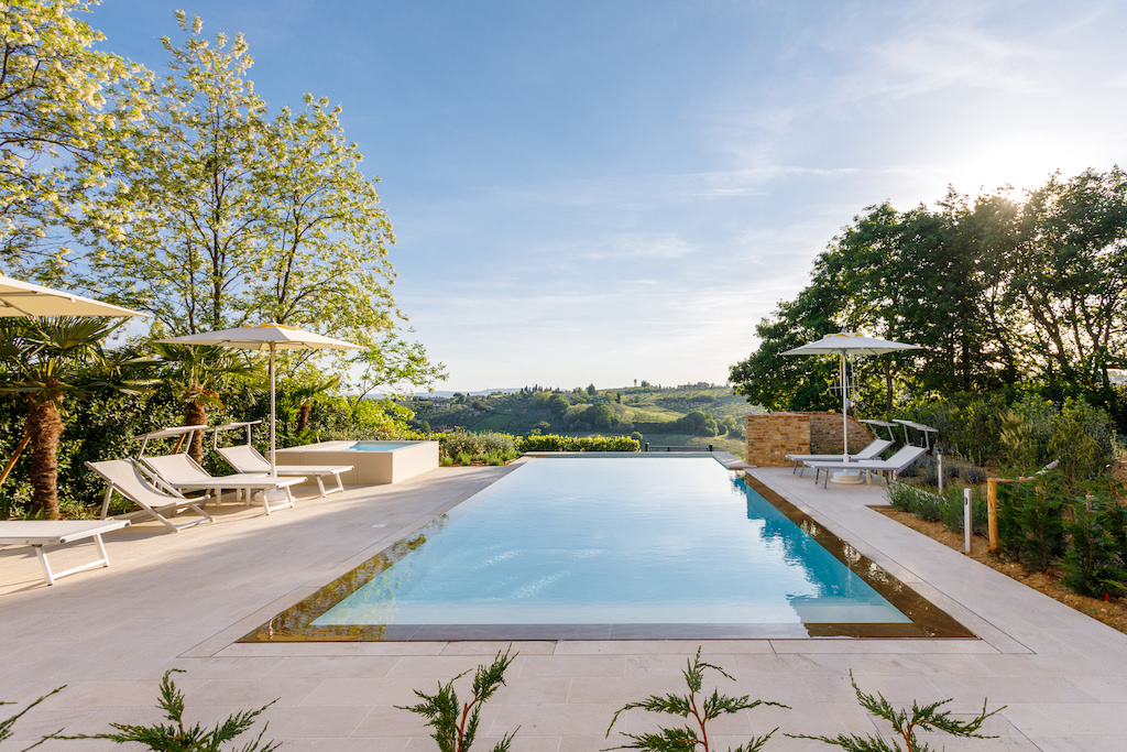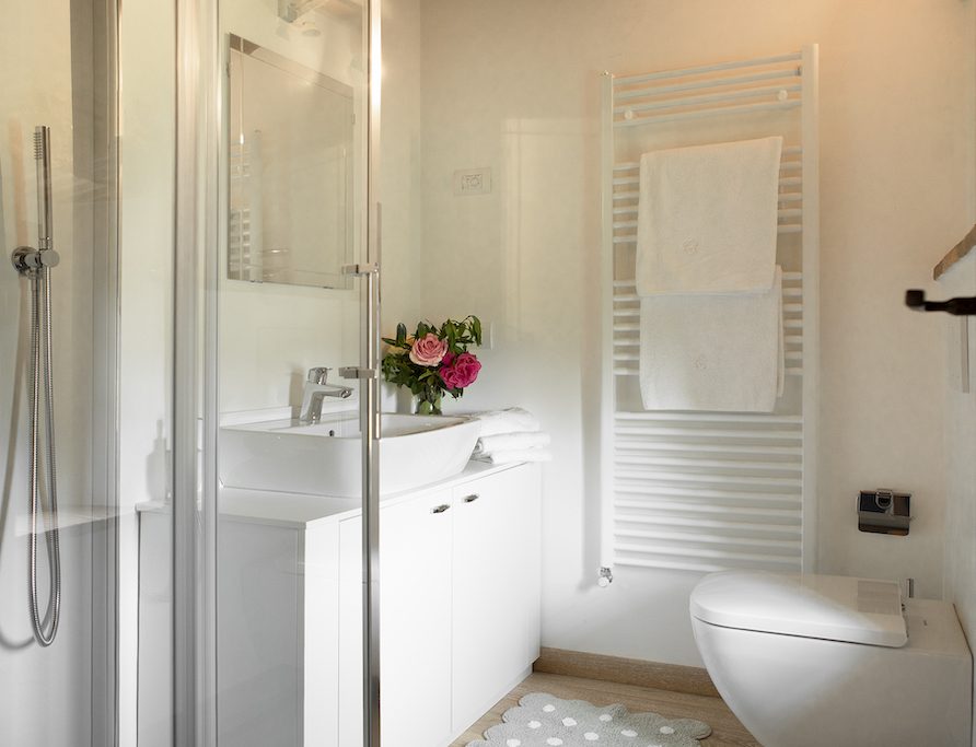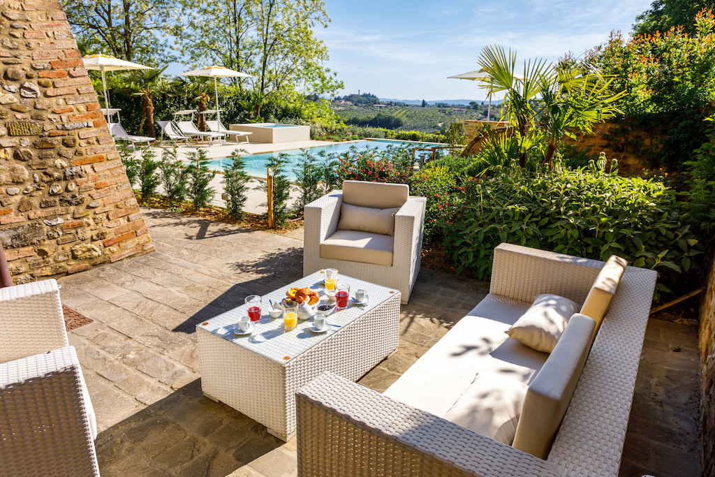 On the Villa first floor are located the three bedrooms Rosa, Girasole and Peonia. Two have double beds and one have two single beds. All the bedrooms have ensuite bathroom with shower. The sixth double bedroom, Gelsomino with bathroom with shower, is located on the Villa’s higher level, on the tower, with a stunning view over the Tuscan countryside, covered with vineyards and olive trees.The Villa is furnished also with lovely living areas with understated elegance which create a welcoming atmosphere. The Villa is completely Air Conditioned.