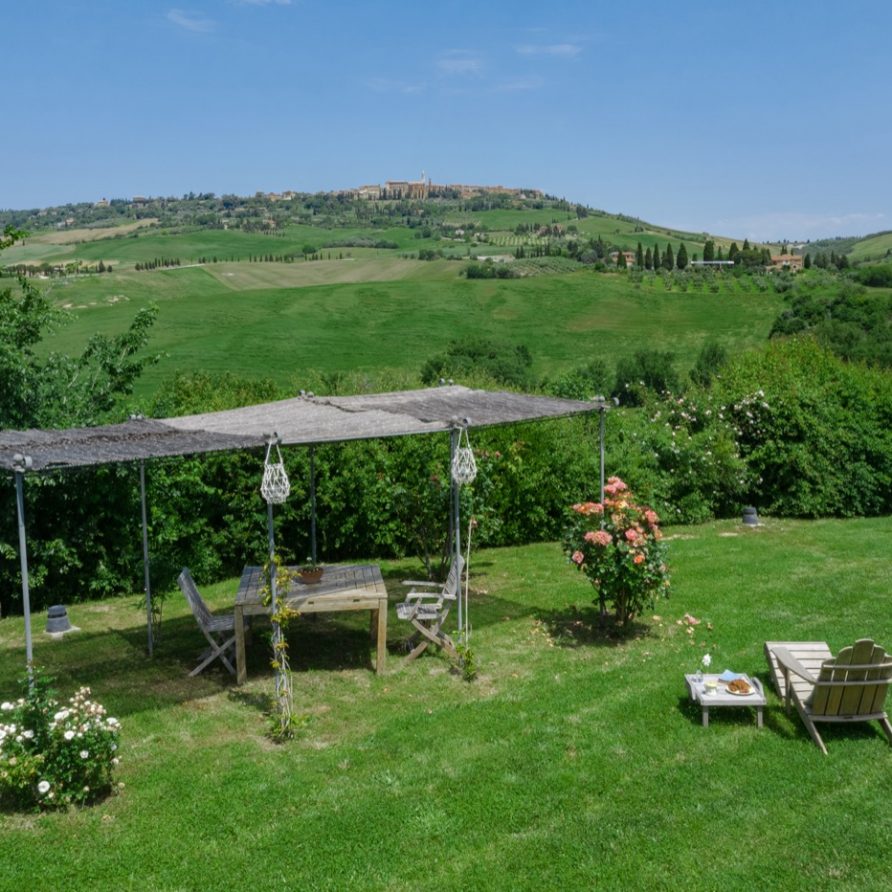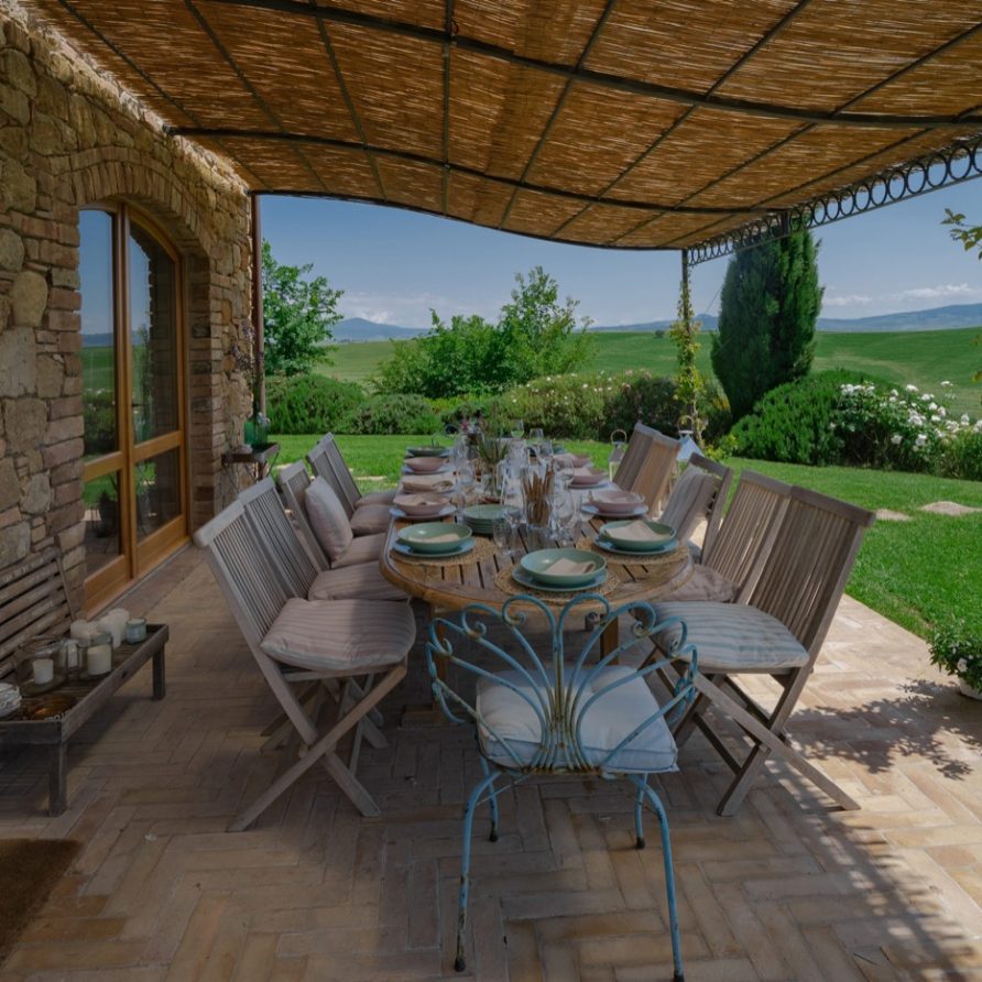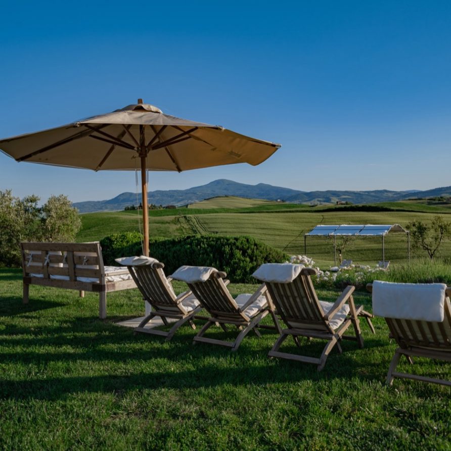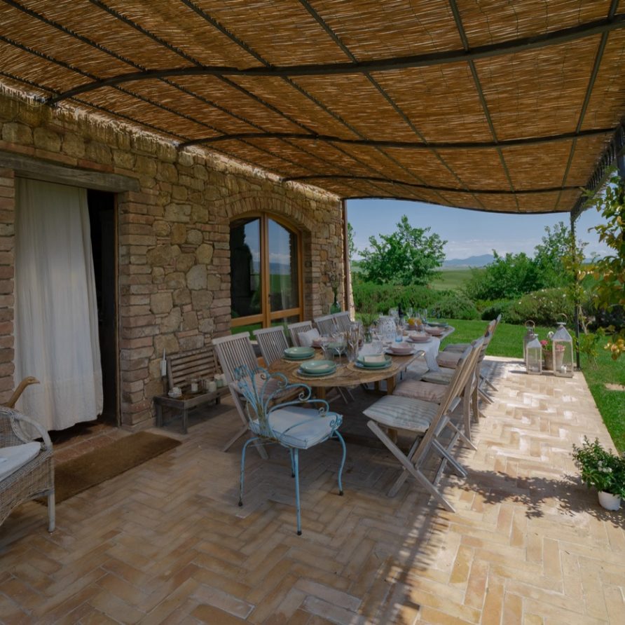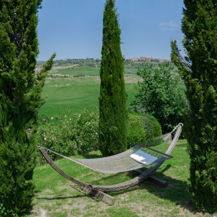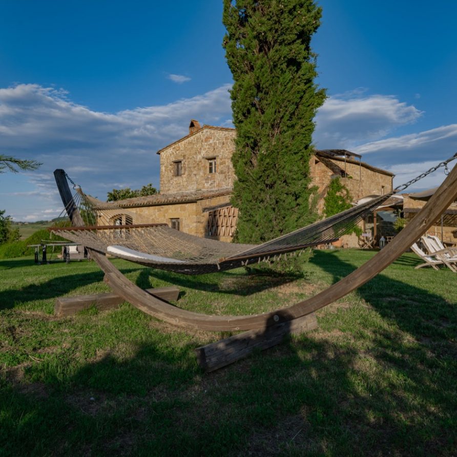 This sensation is so strong that it seems that you can evensmell the aroma of coffee accompanied by the inviting odor of a soft cake straight out of the oven of the owner, who is happy to receive the guests to whom he has left his corner of paradise. The villa is perfect for big groups of people, who love the stimulating experience of Tuscany, with sport, adventure, well being and good food.Total comfort and relax are waiting for you in the outside location: open air lounges with divans and arm chairs in front of the spectacular painting of Val d’ Orcia. Here you can find tranquillity and peace, while tasting some of the renowned local wines or reading a good book in the shaded hammock. The villa is surrounded by a large garden with aromatic herbs, lavender, rosmary, basil and wild flowers. A large portico with a dining table and chairs is the perfect area for al fresco eating and for fully enjoying the freedom of country life in front of a magnificent sunset, perhaps drinking a nice cool aperitive.