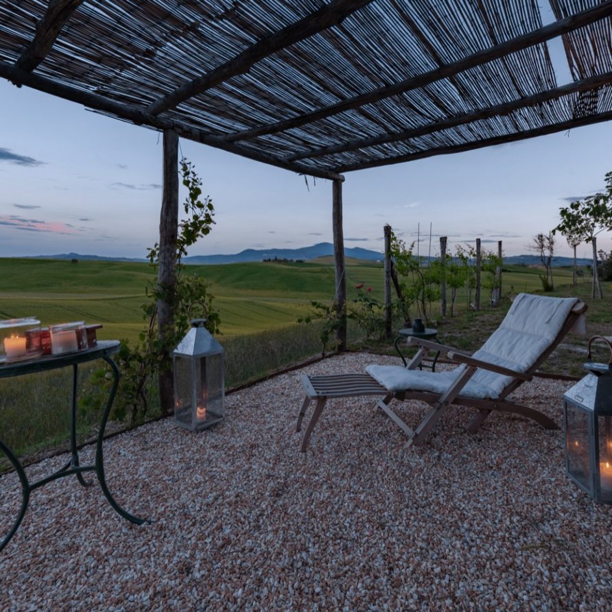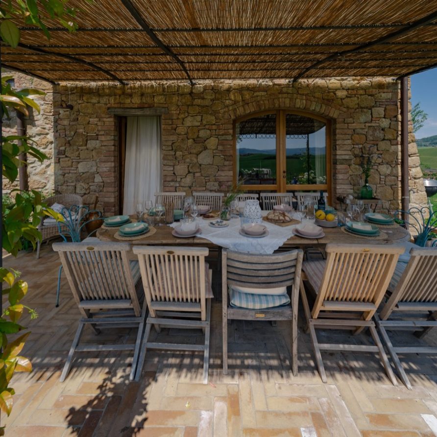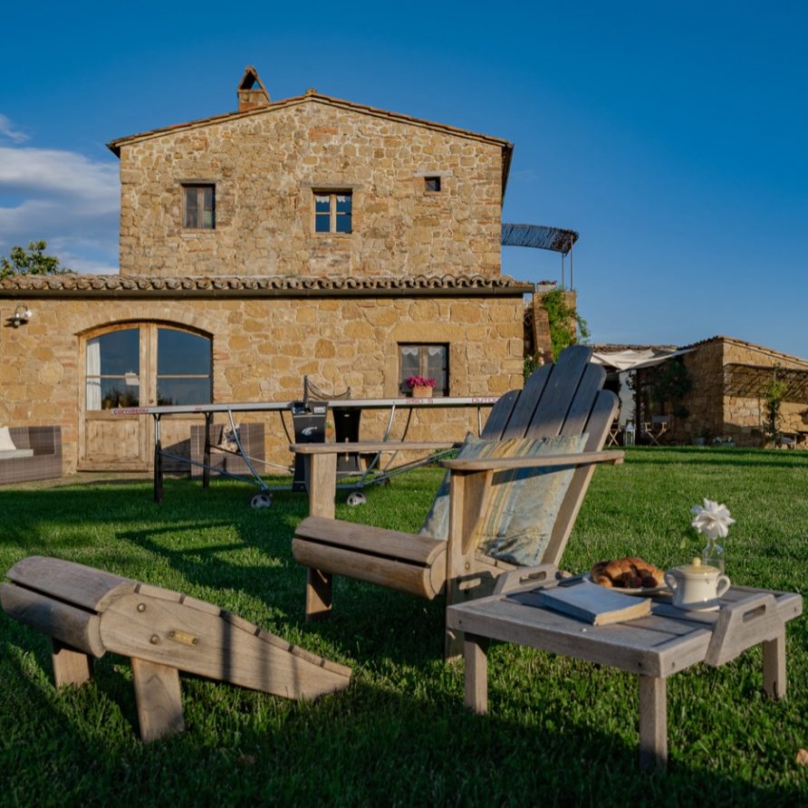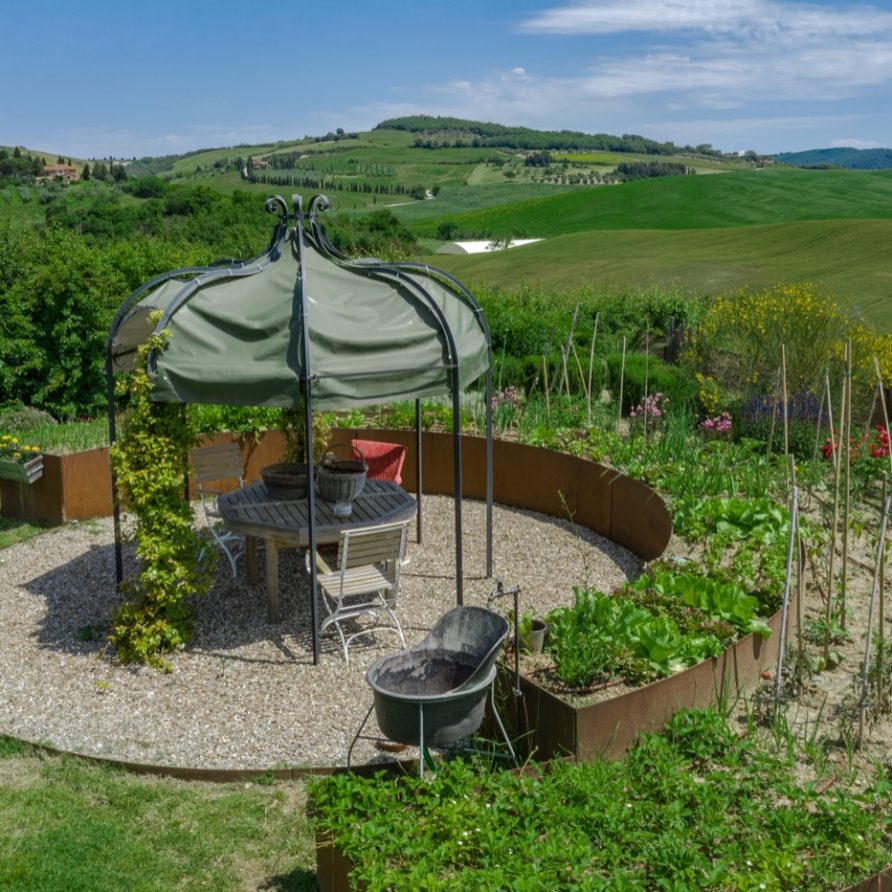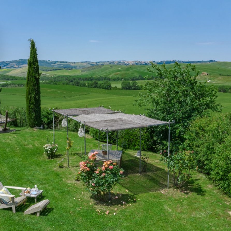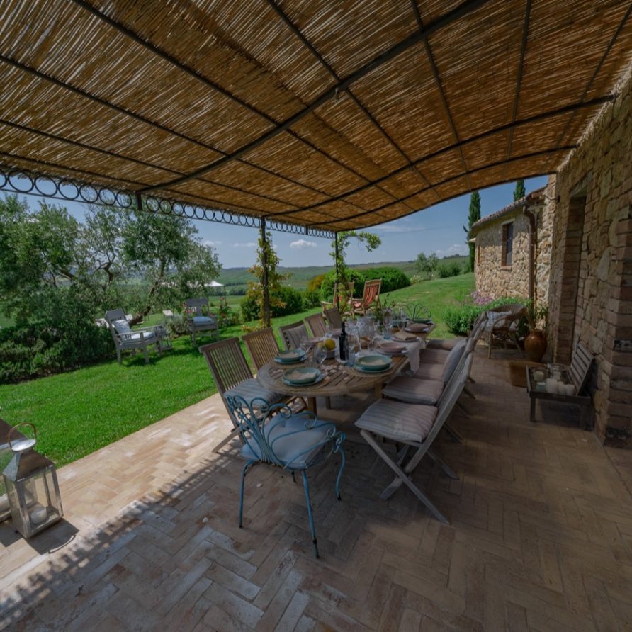This sensation is so strong that it seems that you can evensmell the aroma of coffee accompanied by the inviting odor of a soft cake straight out of the oven of the owner, who is happy to receive the guests to whom he has left his corner of paradise. The villa is perfect for big groups of people, who love the stimulating experience of Tuscany, with sport, adventure, well being and good food.Total comfort and relax are waiting for you in the outside location: open air lounges with divans and arm chairs in front of the spectacular painting of Val d’ Orcia. Here you can find tranquillity and peace, while tasting some of the renowned local wines or reading a good book in the shaded hammock. The villa is surrounded by a large garden with aromatic herbs, lavender, rosmary, basil and wild flowers. A large portico with a dining table and chairs is the perfect area for al fresco eating and for fully enjoying the freedom of country life in front of a magnificent sunset, perhaps drinking a nice cool aperitive.