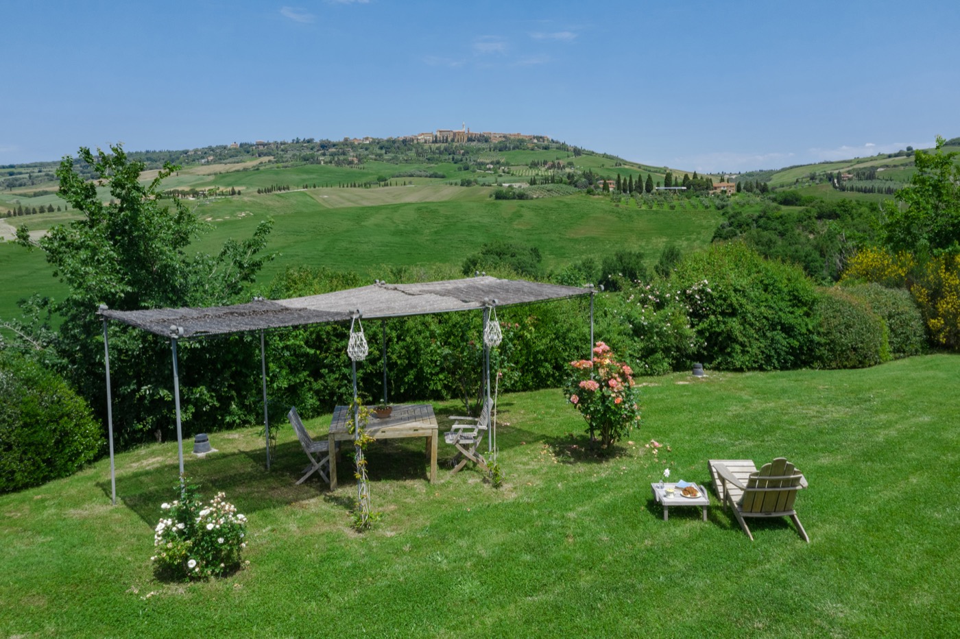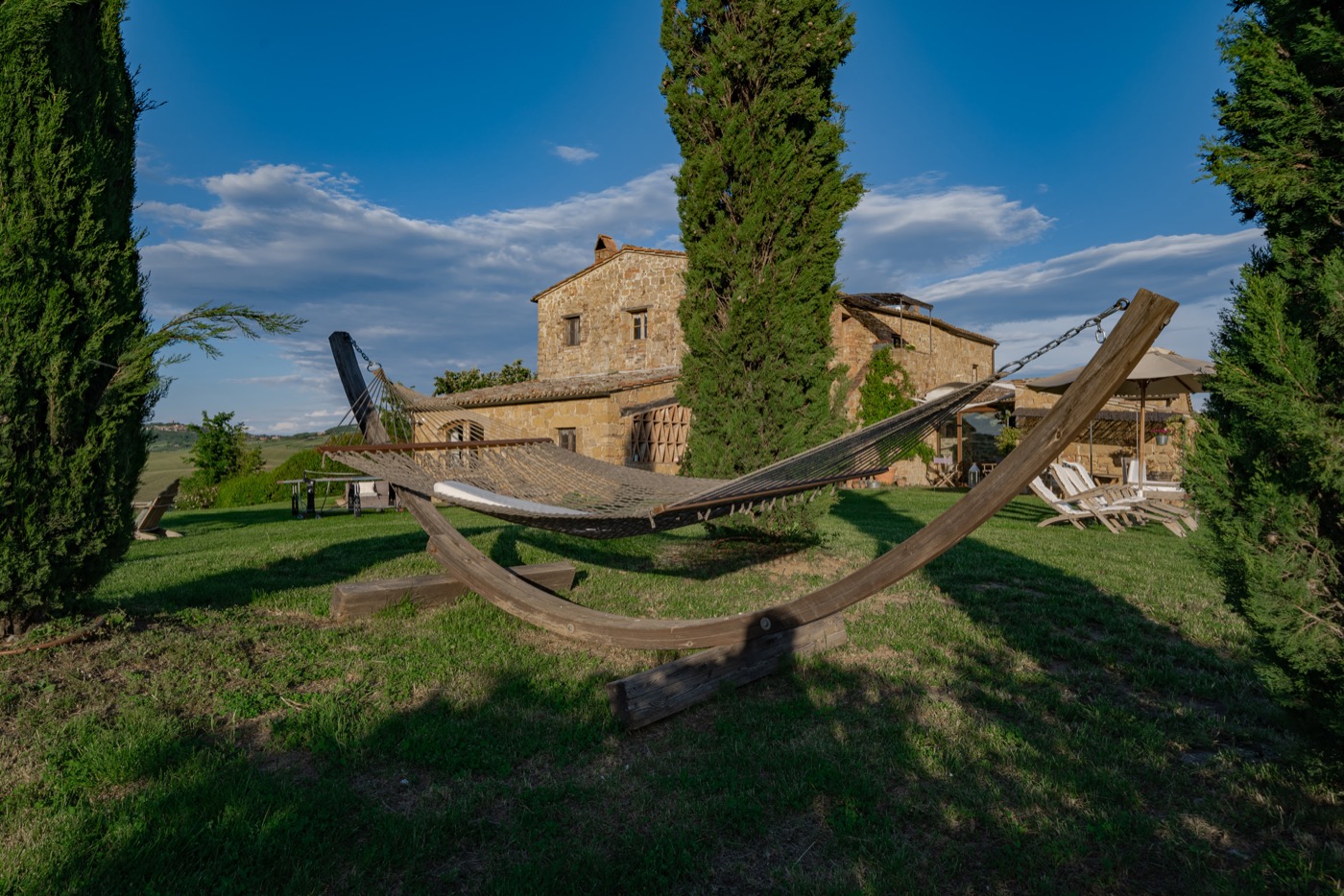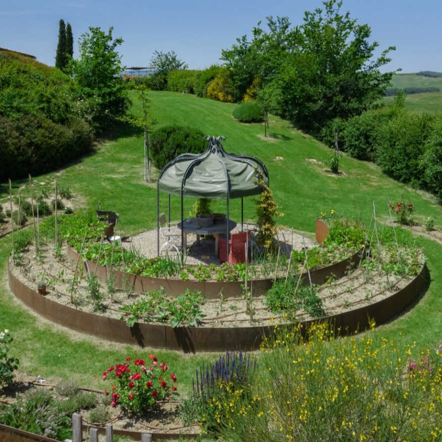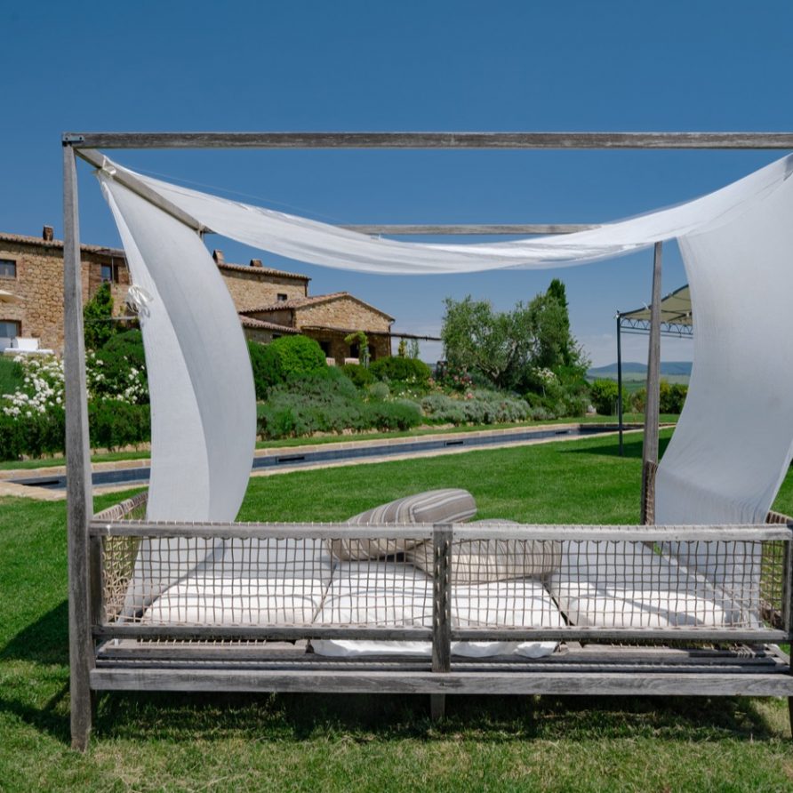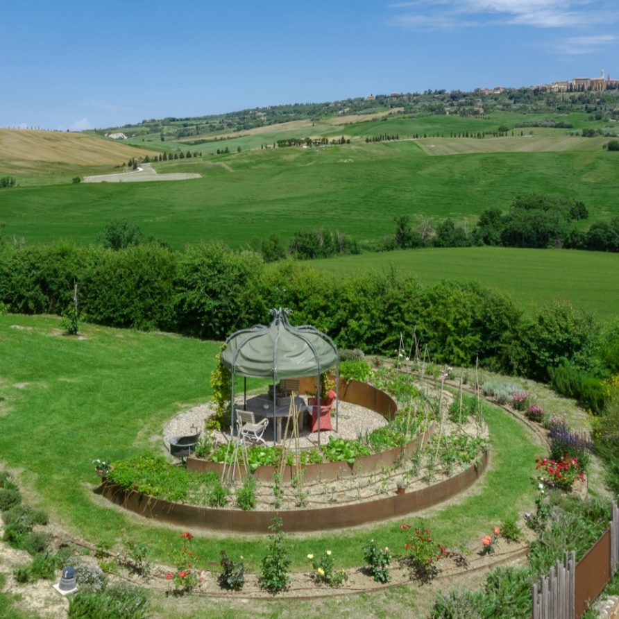 This sensation is so strong that it seems that you can evensmell the aroma of coffee accompanied by the inviting odor of a soft cake straight out of the oven of the owner, who is happy to receive the guests to whom he has left his corner of paradise. The villa is perfect for big groups of people, who love the stimulating experience of Tuscany, with sport, adventure, well being and good food.Total comfort and relax are waiting for you in the outside location: open air lounges with divans and arm chairs in front of the spectacular painting of Val d’ Orcia. Here you can find tranquillity and peace, while tasting some of the renowned local wines or reading a good book in the shaded hammock. The villa is surrounded by a large garden with aromatic herbs, lavender, rosmary, basil and wild flowers. A large portico with a dining table and chairs is the perfect area for al fresco eating and for fully enjoying the freedom of country life in front of a magnificent sunset, perhaps drinking a nice cool aperitive.