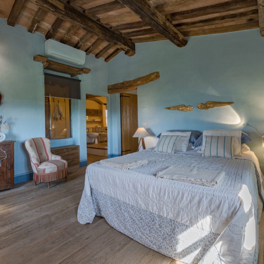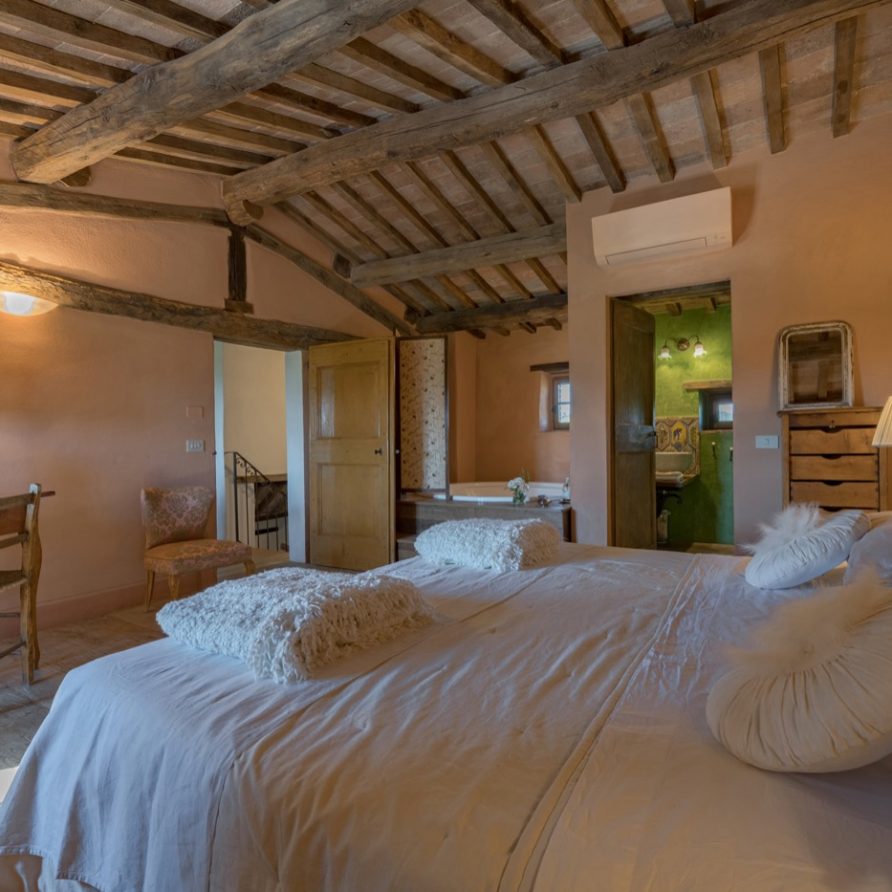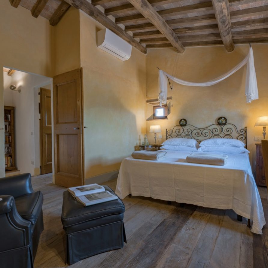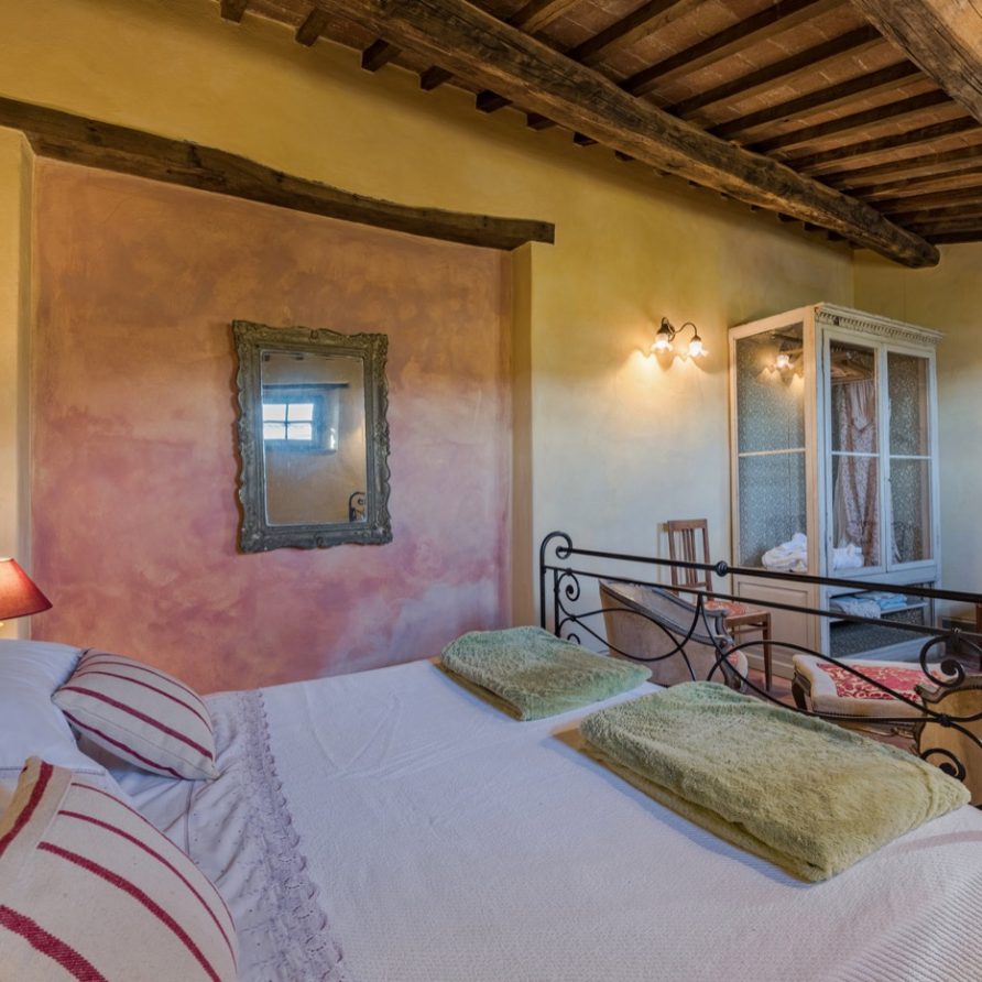 The swimming pool is very long like an ornamental lake and ideal for those who love swimming. The villa has AC and mosquito screens. You also have free access to the owners’ biological kitchen garden. This is a unique possibility: to be able to use healthy vegetables directly from the garden. The owners are always at your full disposition to make your holidays unforgettable, full of interesting experiences, like cooking classes, catering, yoga lessons(there is a special very large covered area for this), relaxing and invigorating massages…..All windows allow you to admire the enchanting Tuscan countryside and it will seem to you that the colors of the countryside are all in one with the colors of this wonderful villa. Try and think of the quiet of an unlimited field of wheat….Think of its colors that will become part of the tones of ocra of your room…Try to be the protagonist of this Tuscan magic!