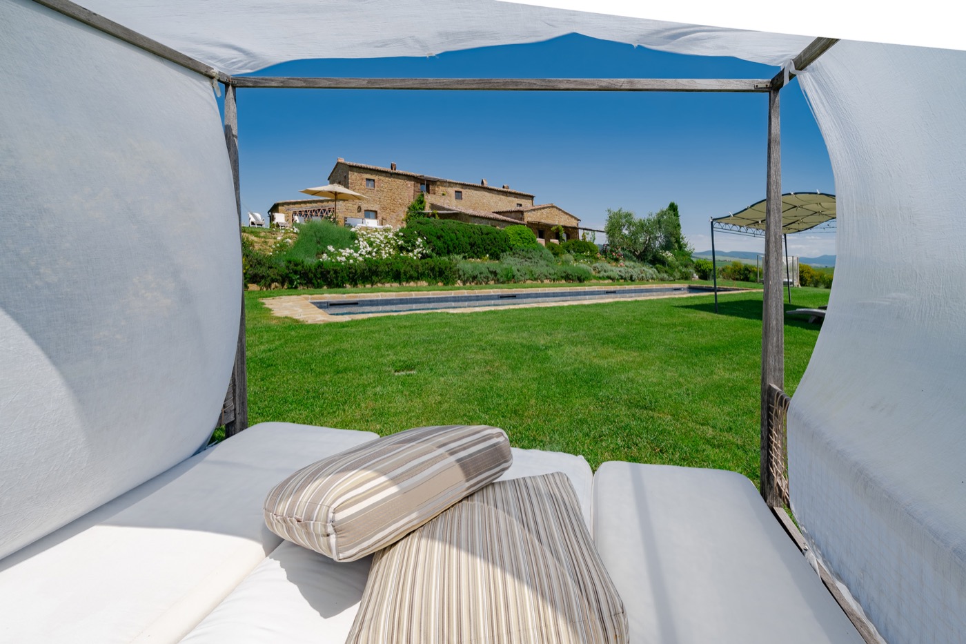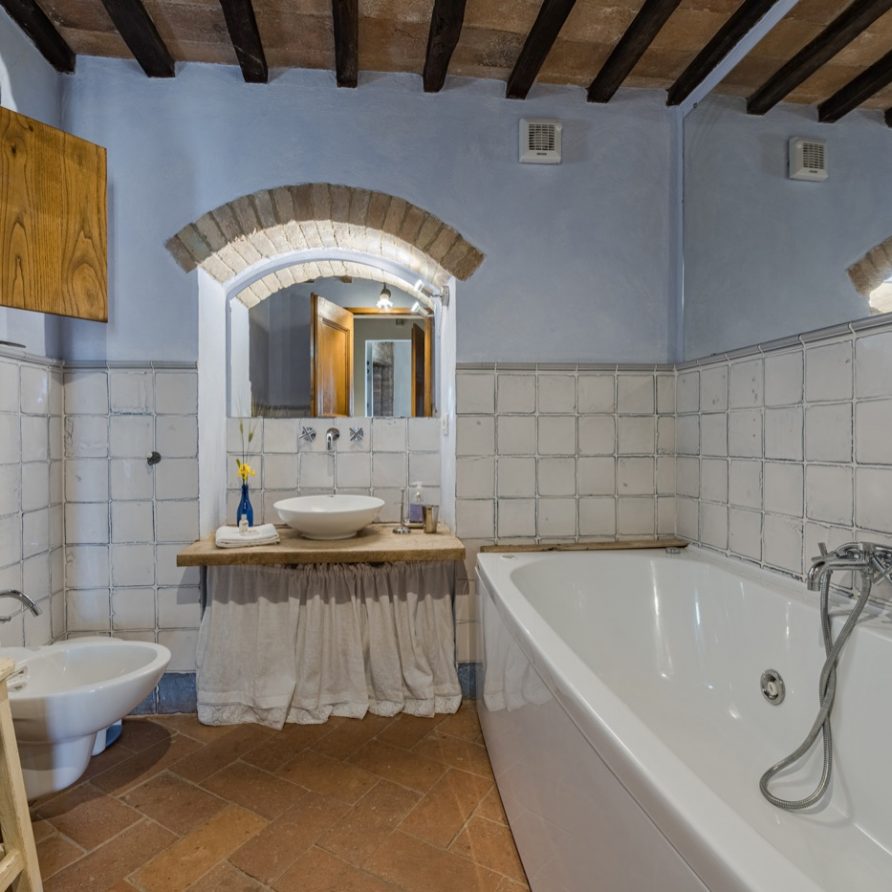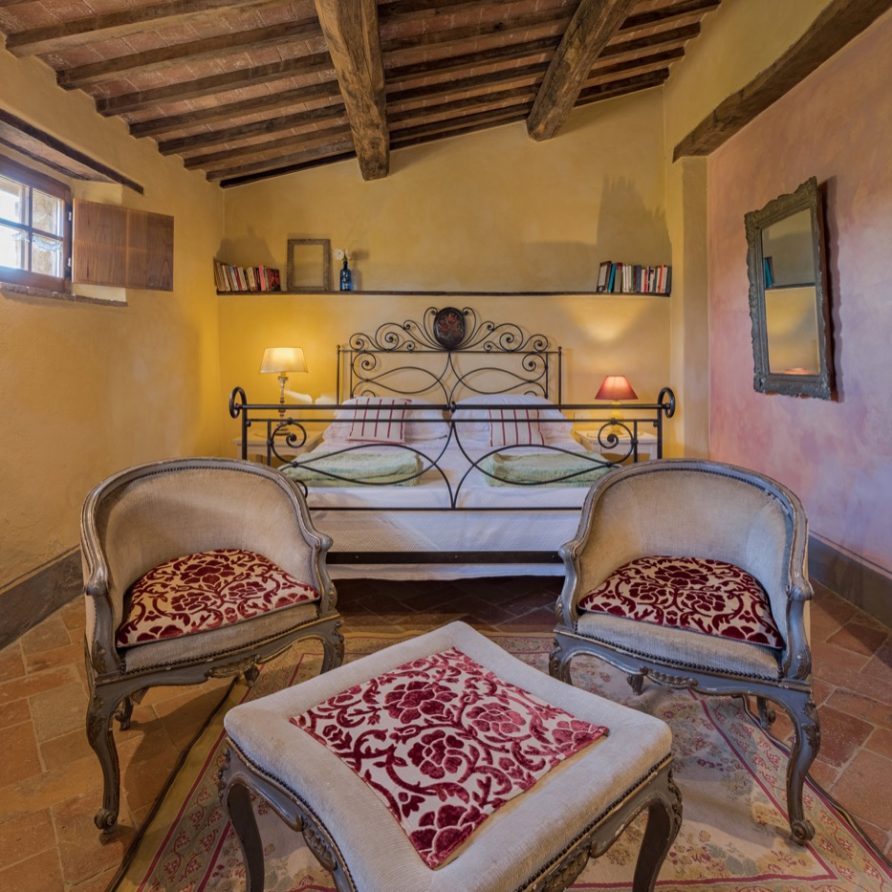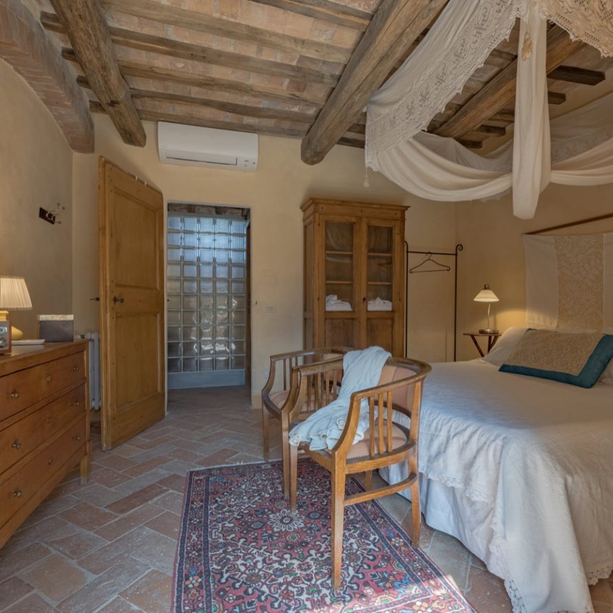 The swimming pool is very long like an ornamental lake and ideal for those who love swimming. The villa has AC and mosquito screens. You also have free access to the owners’ biological kitchen garden. This is a unique possibility: to be able to use healthy vegetables directly from the garden. The owners are always at your full disposition to make your holidays unforgettable, full of interesting experiences, like cooking classes, catering, yoga lessons(there is a special very large covered area for this), relaxing and invigorating massages…..All windows allow you to admire the enchanting Tuscan countryside and it will seem to you that the colors of the countryside are all in one with the colors of this wonderful villa. Try and think of the quiet of an unlimited field of wheat….Think of its colors that will become part of the tones of ocra of your room…Try to be the protagonist of this Tuscan magic!