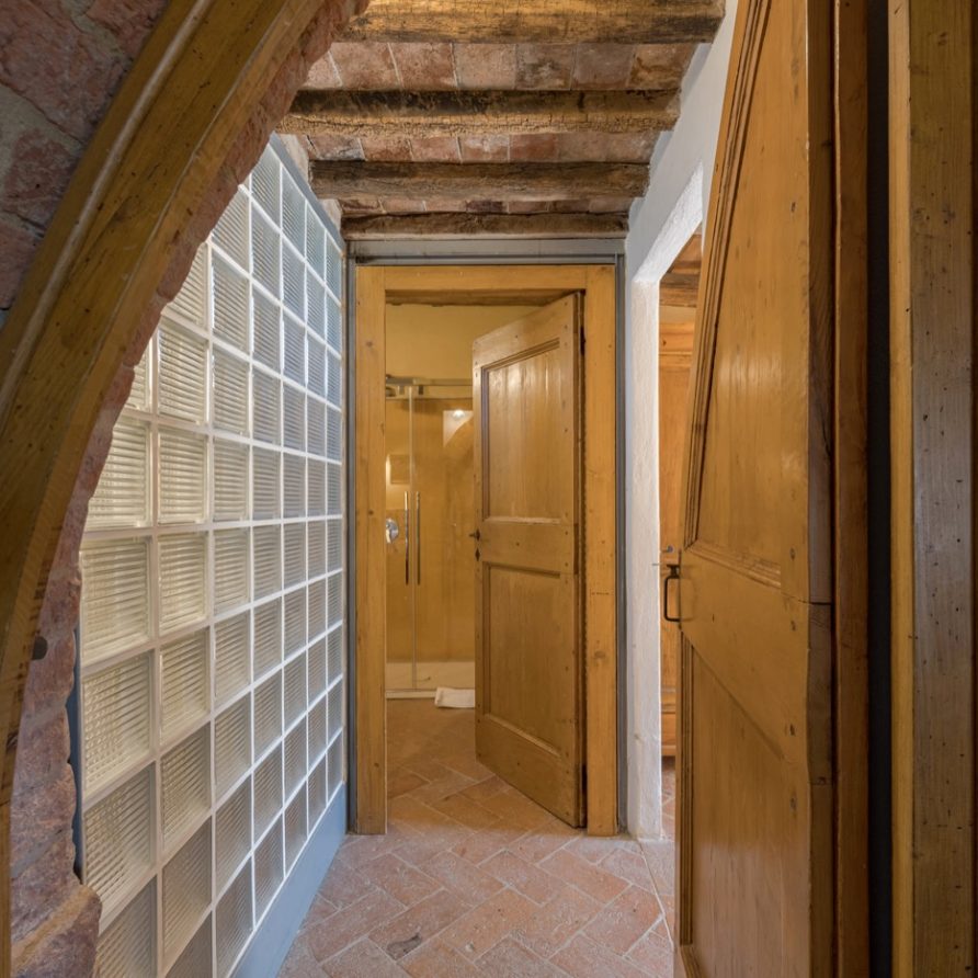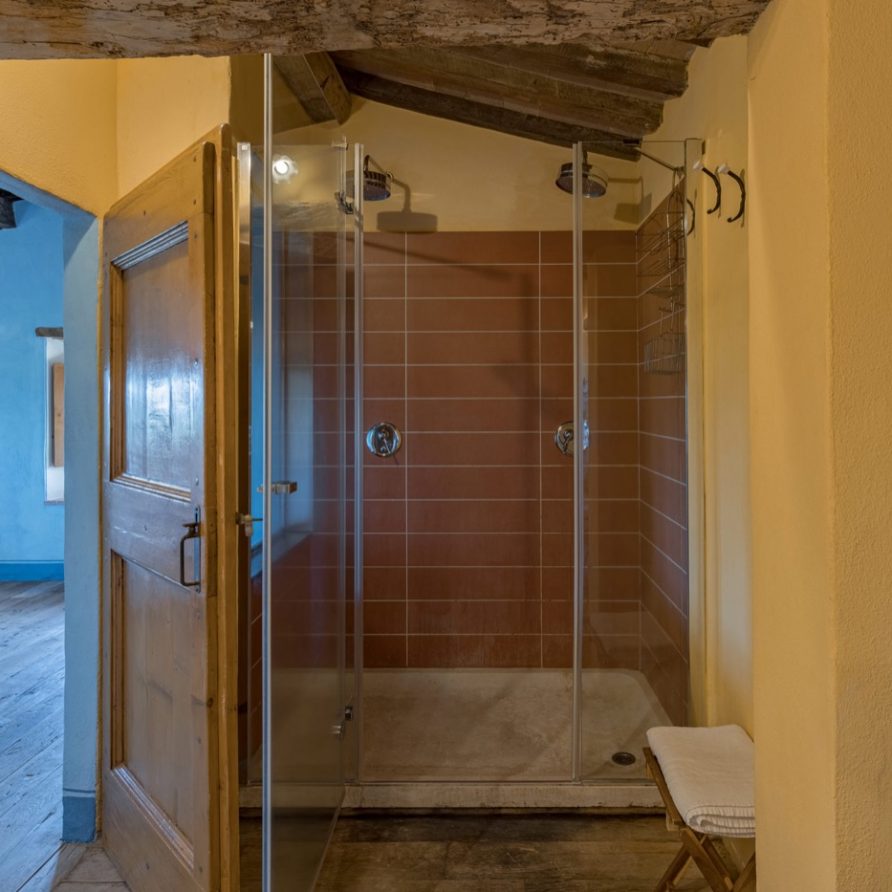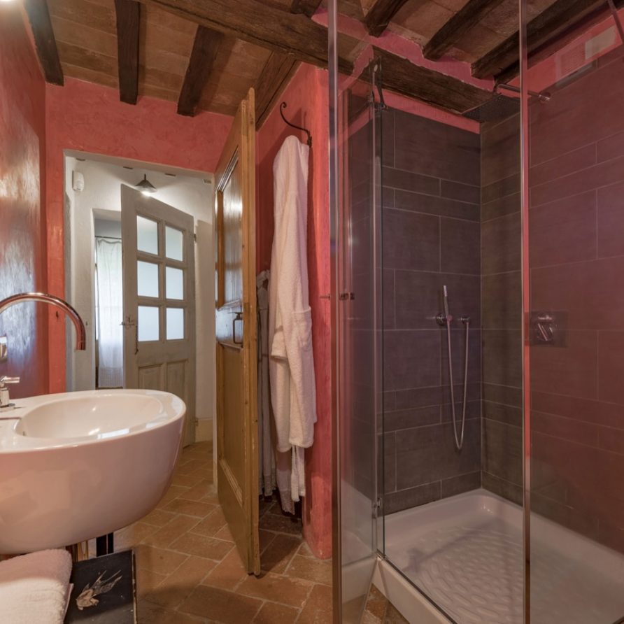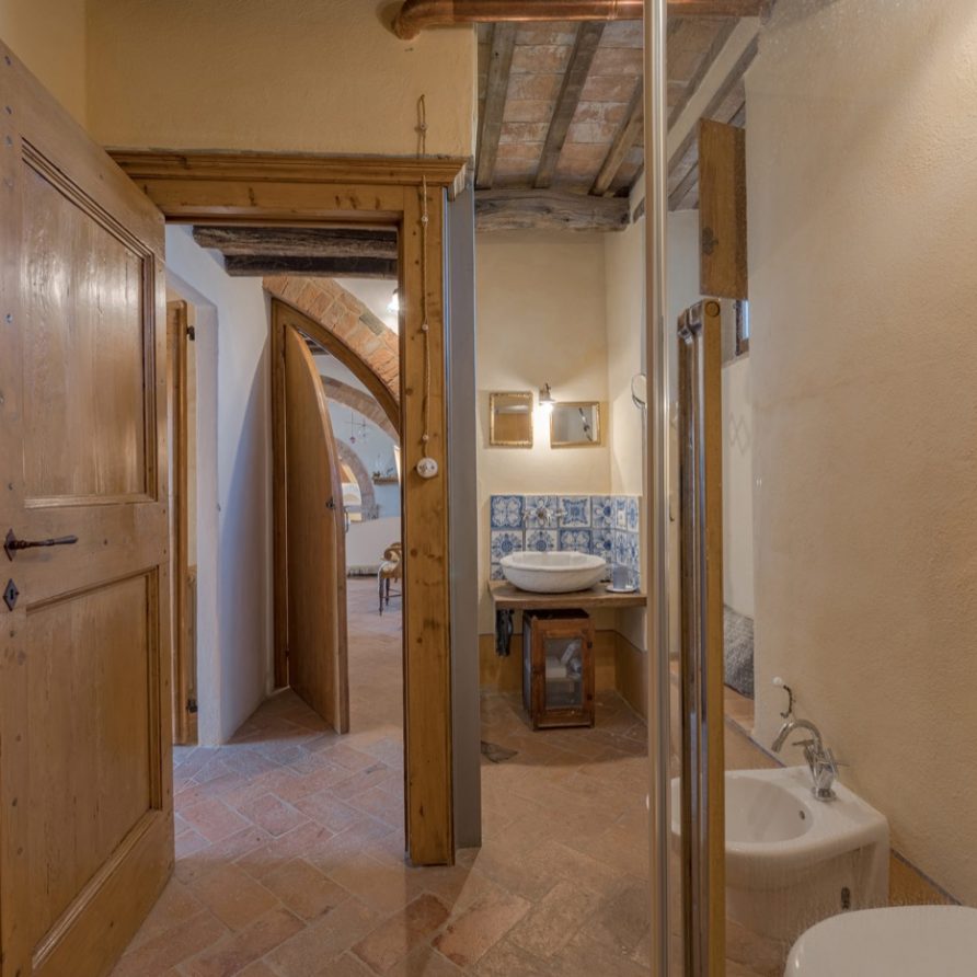 a double French bed suitable for children. Three steps above kitchen level there is a lounge room with fire place and billiard table and another three steps a small area leading to a double bedroom (possible twin beds) with private bathroom and shower. To the left of the kitchen, up three steps, there is small glassed in verandah: this a magical space in any season and it is a perfect setting for reading a book and perhaps sipping a good glass of Brunello wine and at the same time being outside and breathing the aromatic herbs of the garden. There is an entrance to a large sitting room with a big fire place, comfortable divans, a library with many books, stereo, tv with dvd. Next to the sitting room there is a small kitchen (oven, fridge, freezer, dishwasher and microwave oven), a sitting room with tv and library, double bedroom (possible twin) with access to the outside and bathroom with double shower (210×75 cm).