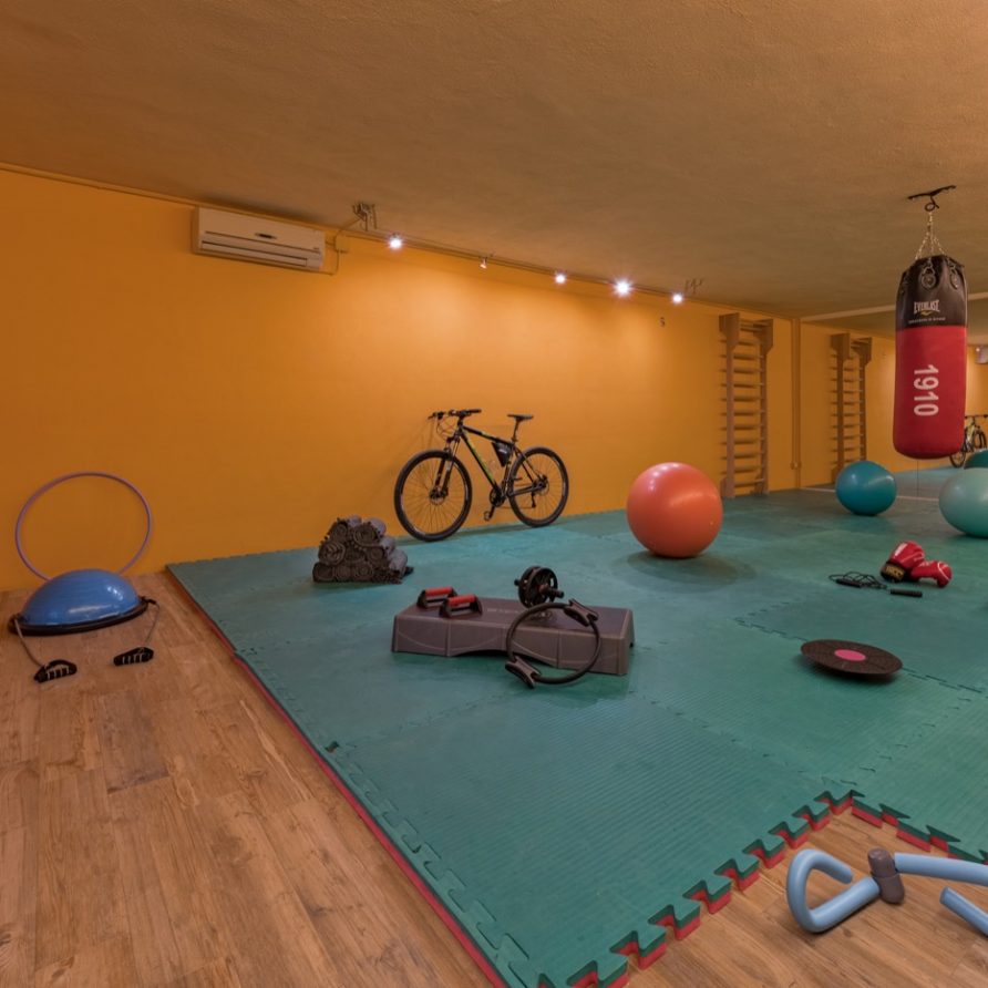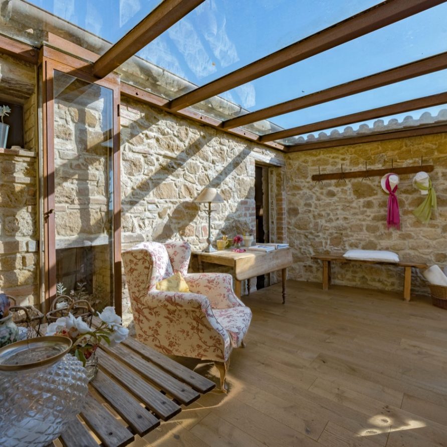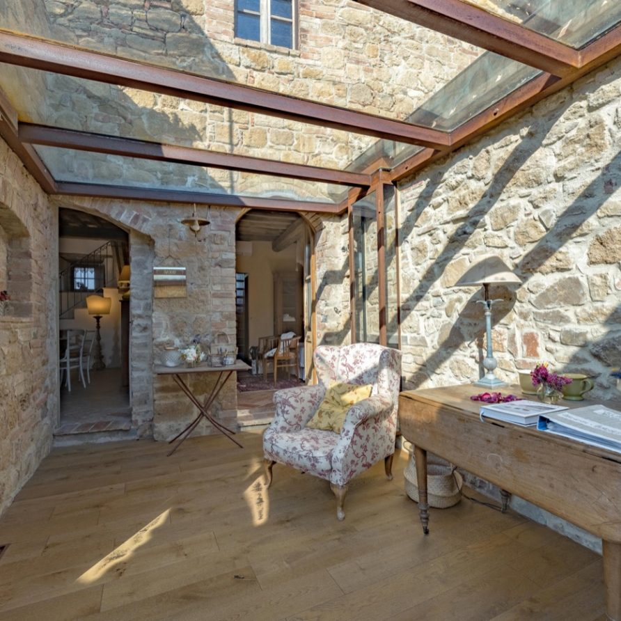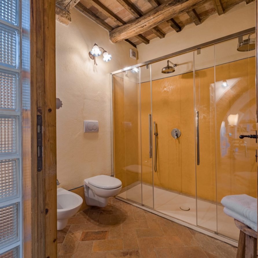 a double French bed suitable for children. Three steps above kitchen level there is a lounge room with fire place and billiard table and another three steps a small area leading to a double bedroom (possible twin beds) with private bathroom and shower. To the left of the kitchen, up three steps, there is small glassed in verandah: this a magical space in any season and it is a perfect setting for reading a book and perhaps sipping a good glass of Brunello wine and at the same time being outside and breathing the aromatic herbs of the garden. There is an entrance to a large sitting room with a big fire place, comfortable divans, a library with many books, stereo, tv with dvd. Next to the sitting room there is a small kitchen (oven, fridge, freezer, dishwasher and microwave oven), a sitting room with tv and library, double bedroom (possible twin) with access to the outside and bathroom with double shower (210×75 cm).