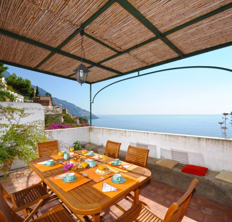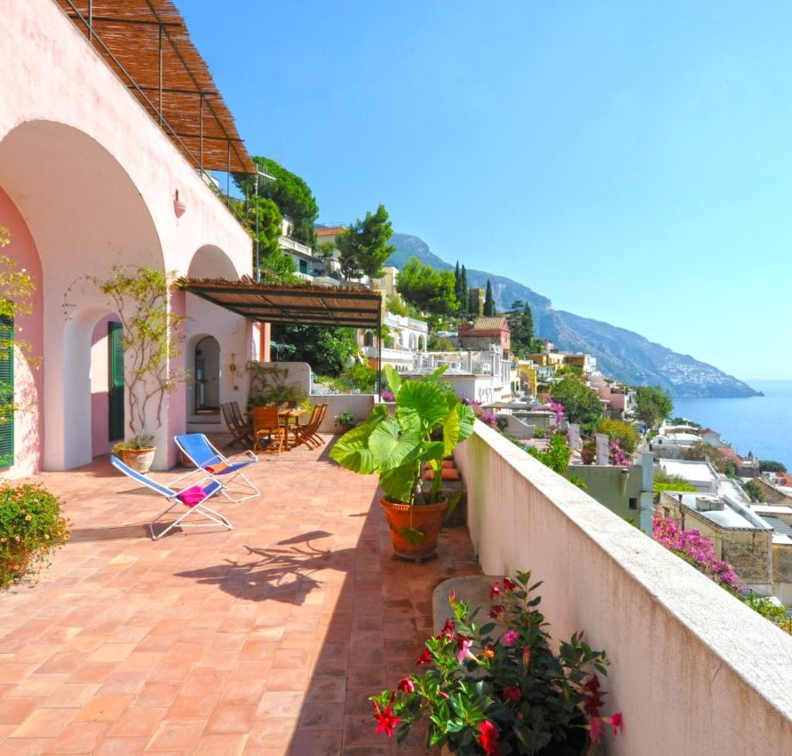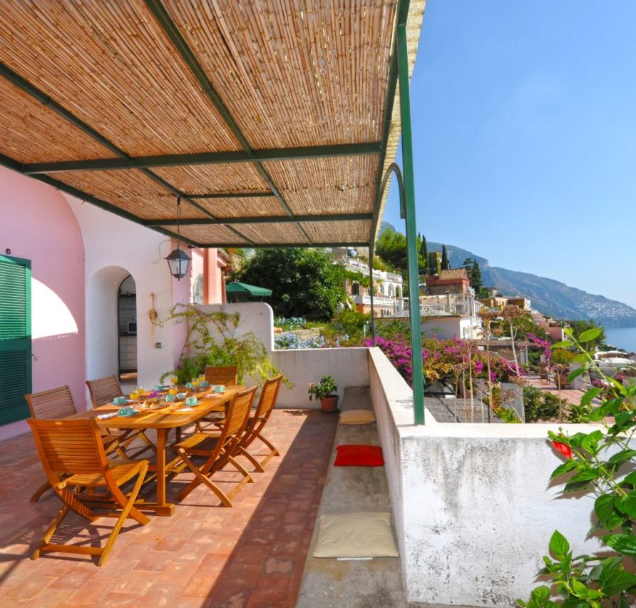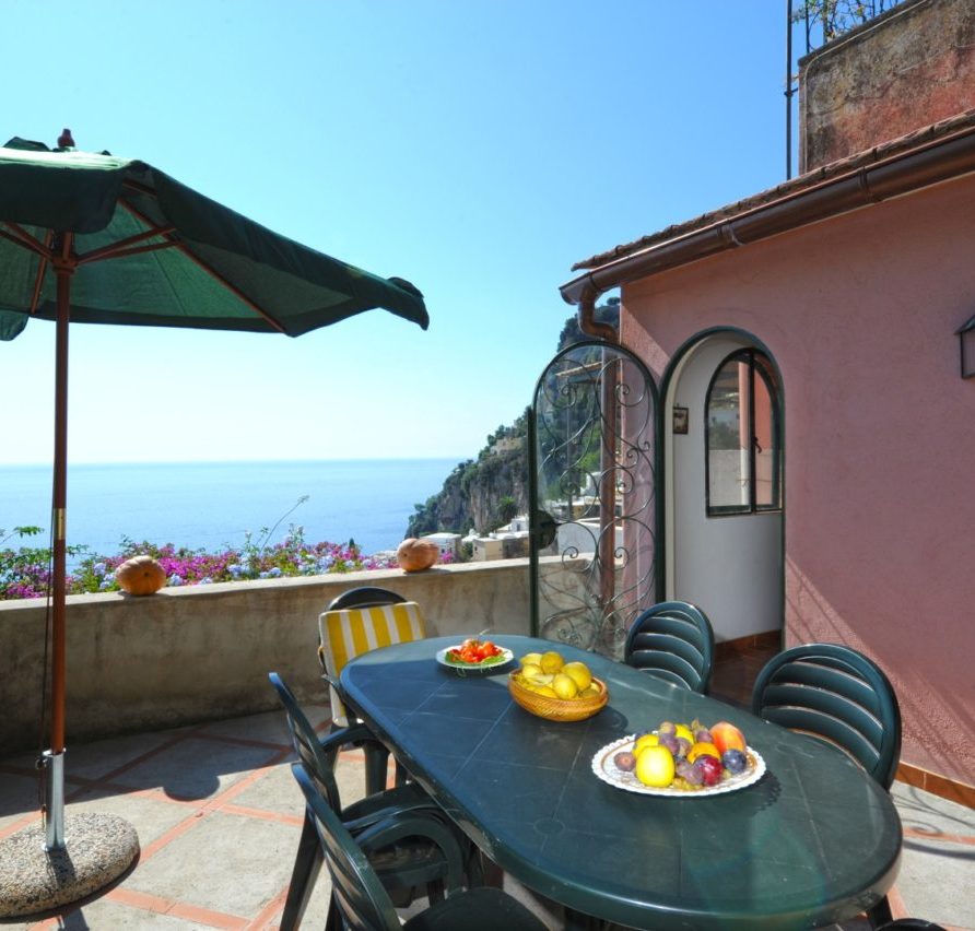 Rosa is a two storey villa, built in 19th century and recently renovated, with external walls 80 cm thick and painted in pink, 3 terraces, beautifully planted with bougainvillea, roses and other flowering plants, and a magnificent view of the town and the sea. The Villa measures 150 square meters; the three terraces together measure more than 110 square meters. Beside the Villa is an accessible vegetable garden of almost 300 square meters, cultivated with seasonal vegetables (tomatoes, lettuce, potatoes, etc.); if available, you can get some of them free from the farmer; at the end of the vegetable garden there is a big fig tree. A stairway of stone steps (typical of Positano) takes you to Villa Rosa, starting from Viale Pasitea, the main street in Positano, and going up through the oldest part of Positano; there are 85 steps leading to the entrance of the villa.