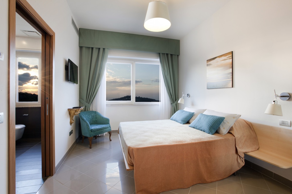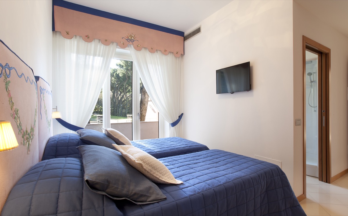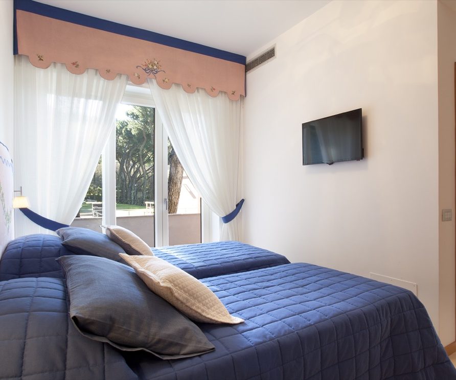 The furniture, with a simple design and light colour shades, welcomes guests in large, bright and clean spaces, diversified for all needs.